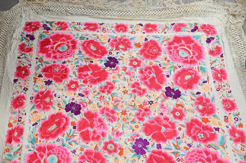 Chinese Silk Embroidered Piano Shawl, having large flowers, approximately 6′ 3″ x 6′ 5″.