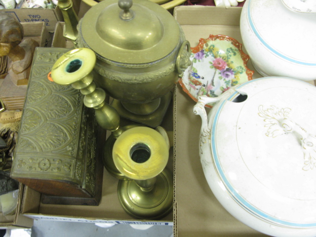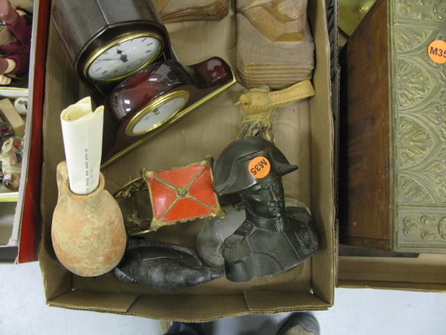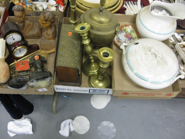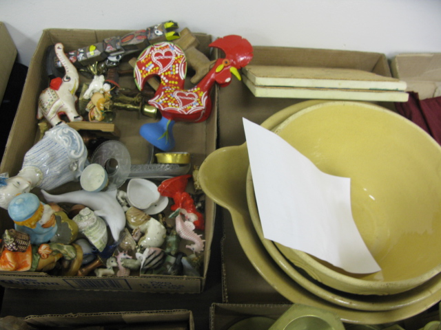 Five box lots, including brass candlesticks, small clocks, bookends, small curios, three yellow ware bowls and miscellaneous items.