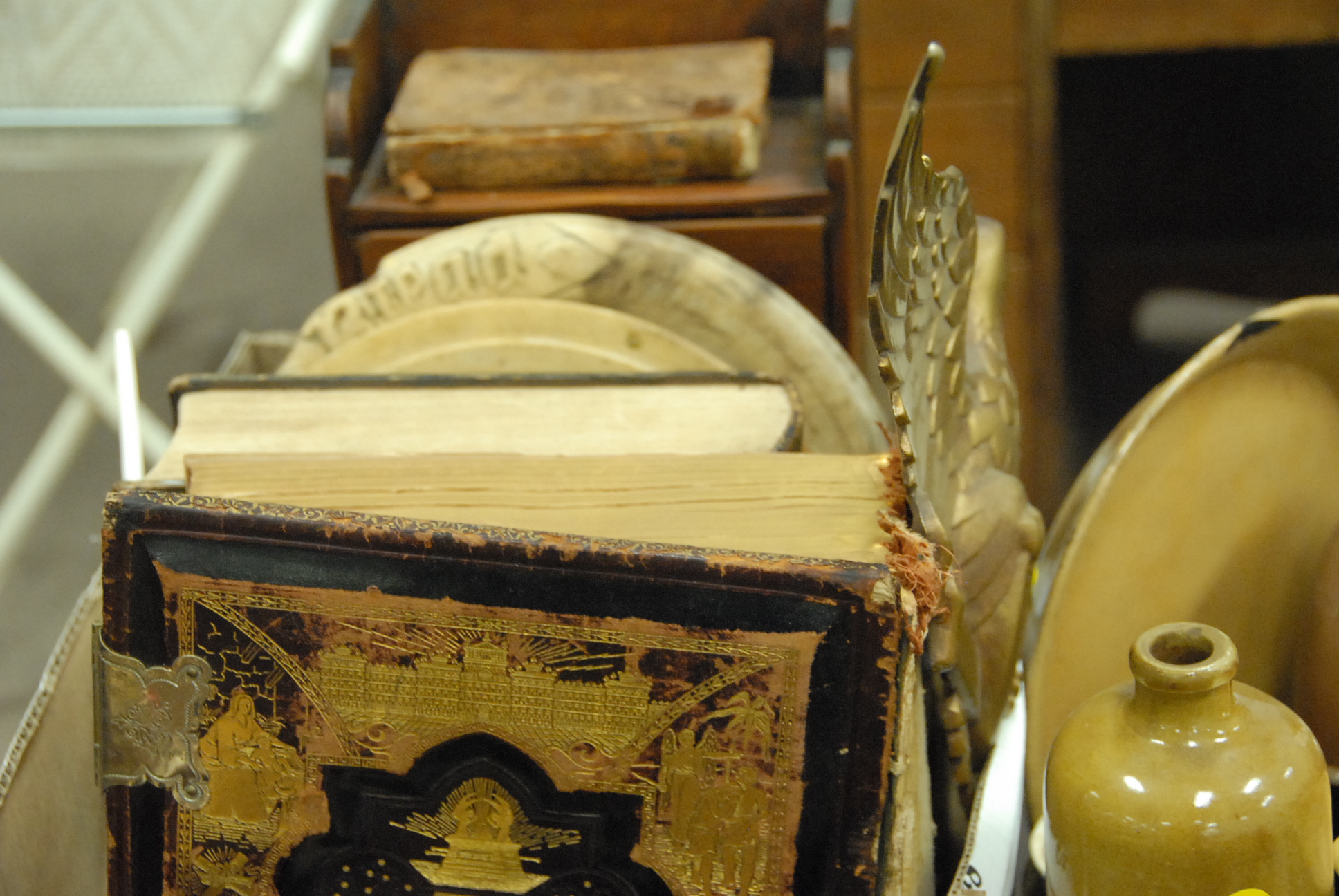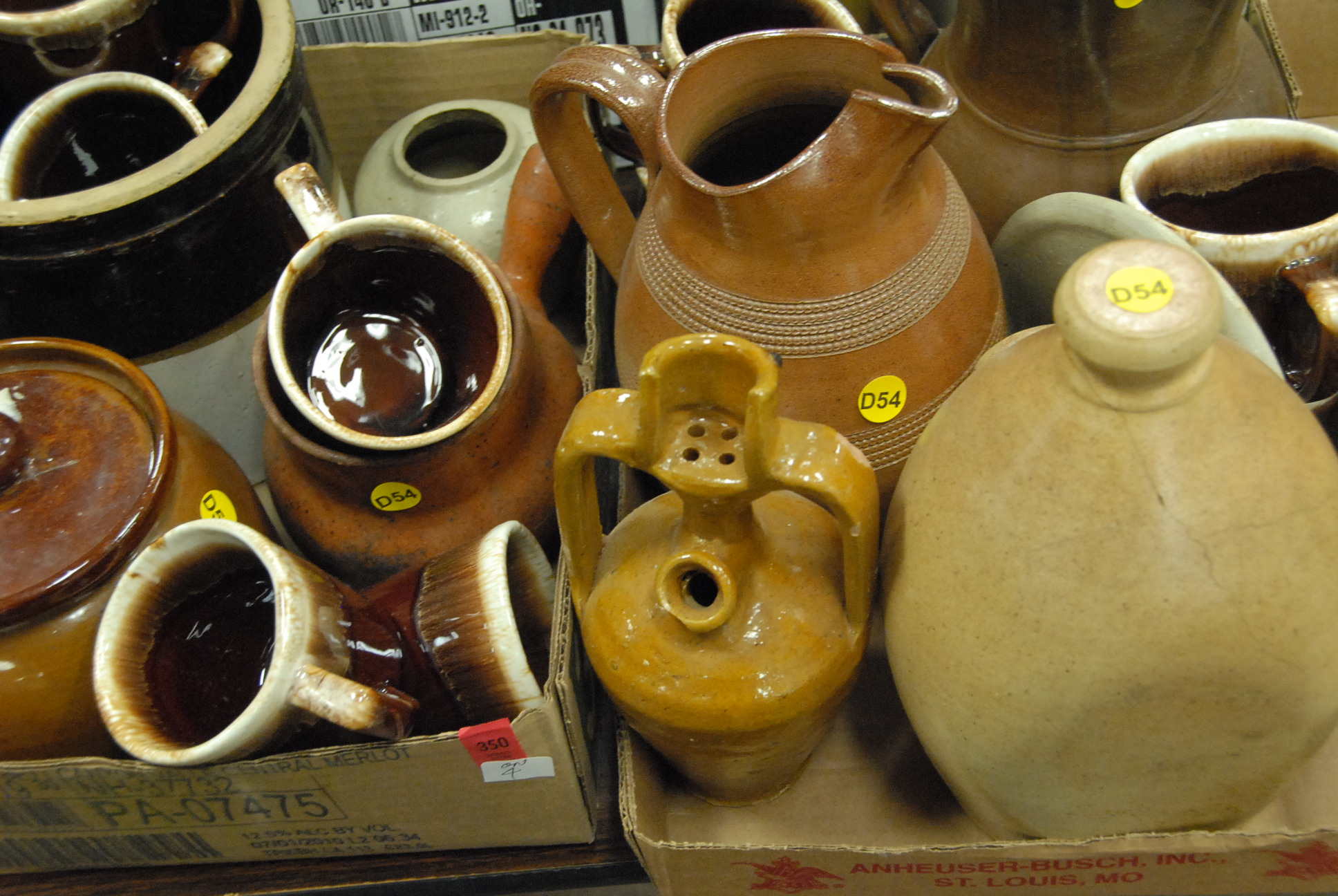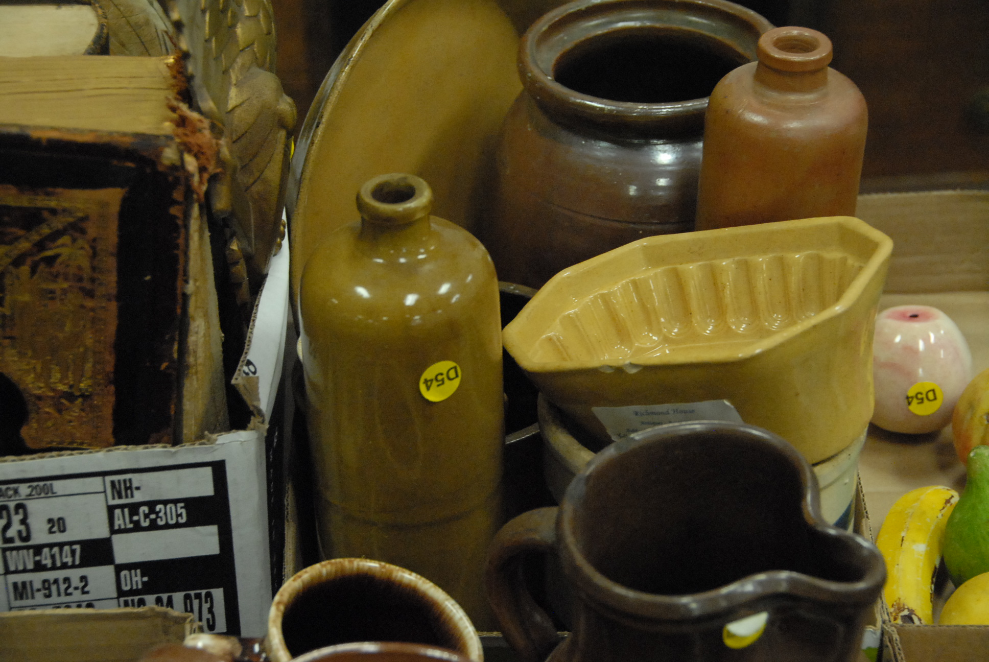 Four box lots to include books and three box lots of various stoneware, pitchers, crocks, covered jar, etc