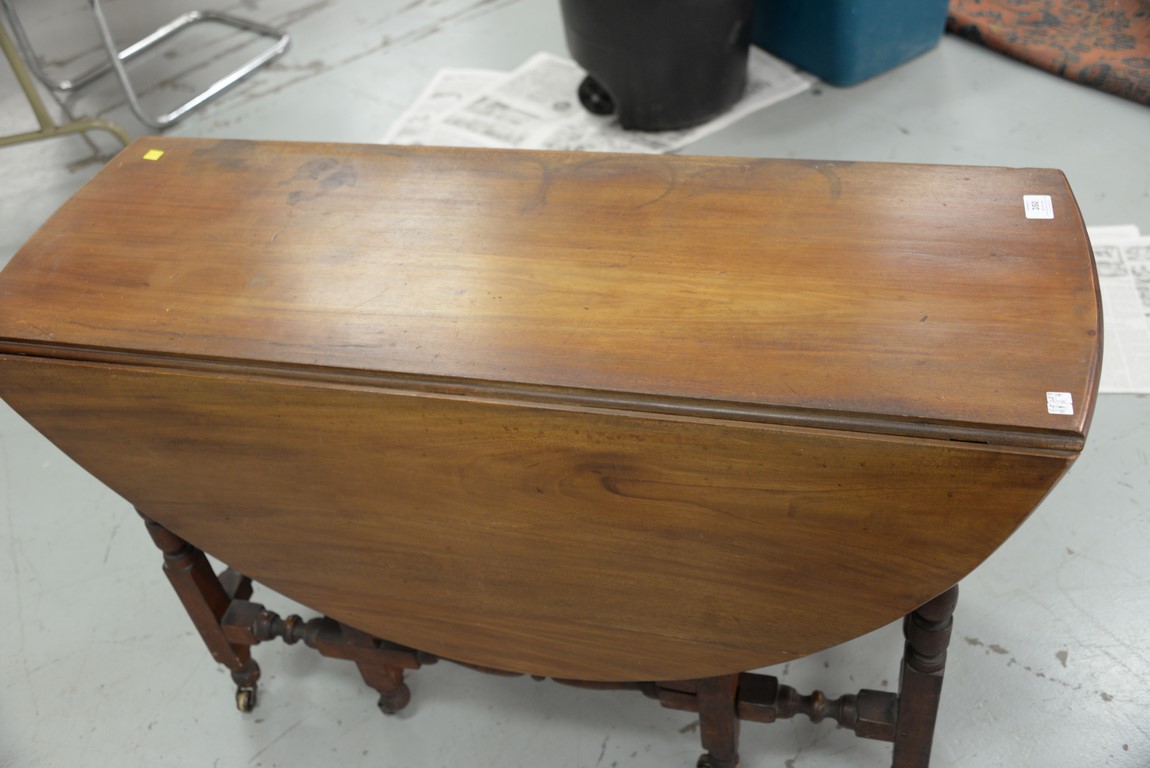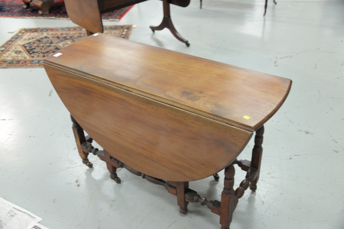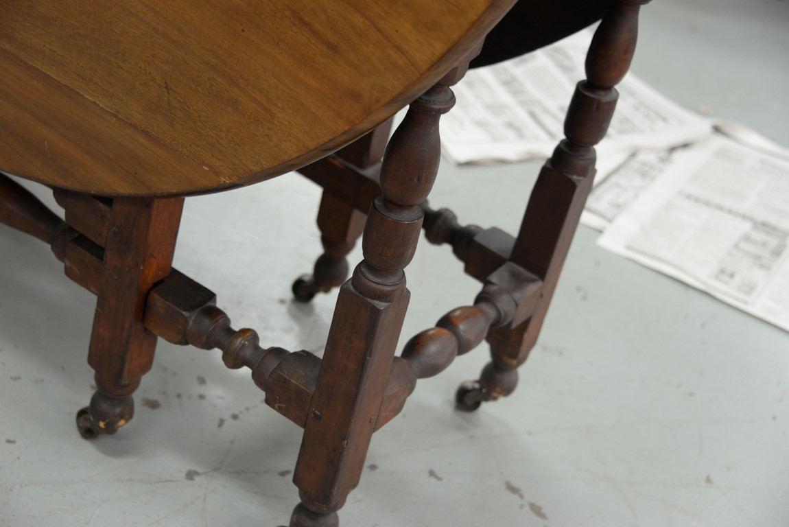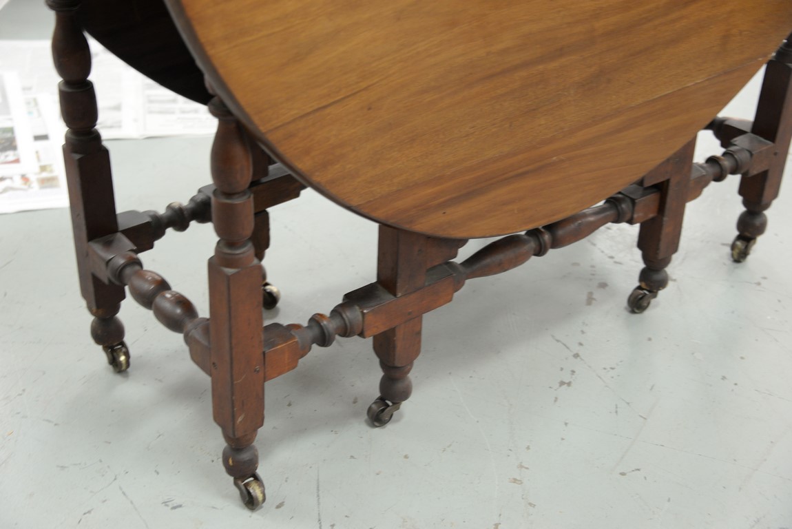 Lot 350: Gateleg table with oval drop leaves on block and turned base, base 17th – 18th century top and drawer replaced. ht. 28 in. top closed: 15 x 45 top open: 52 x 45