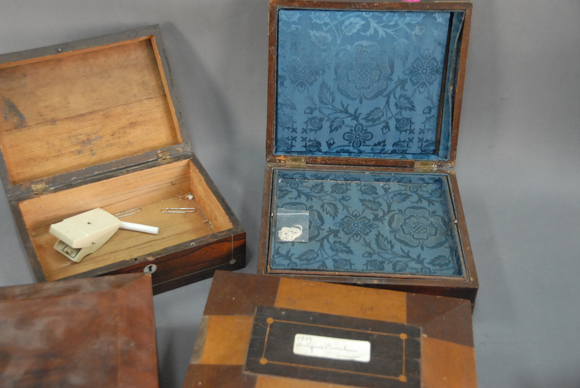 Group of four lift top boxes, one is mahogany inlaid sewing box.