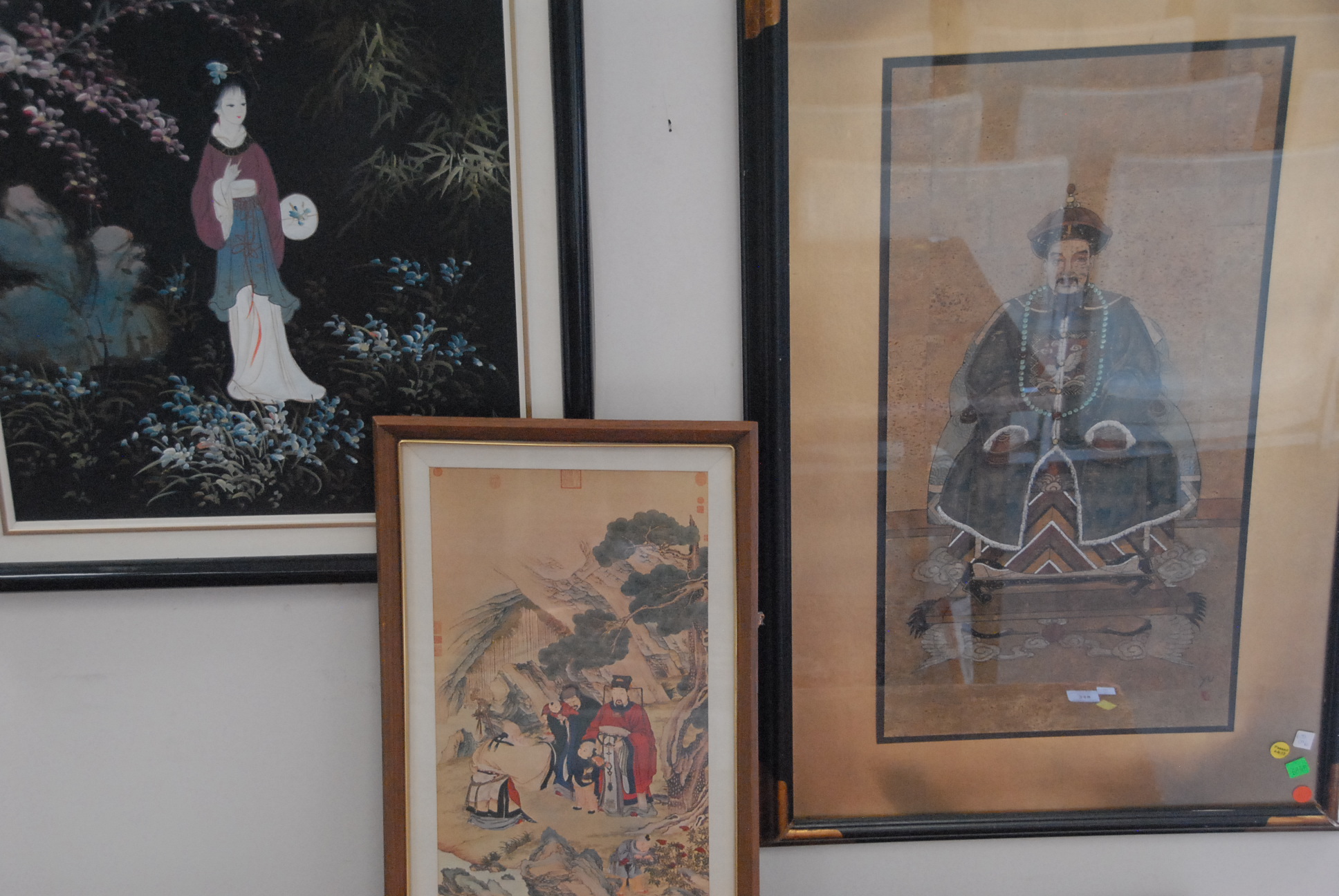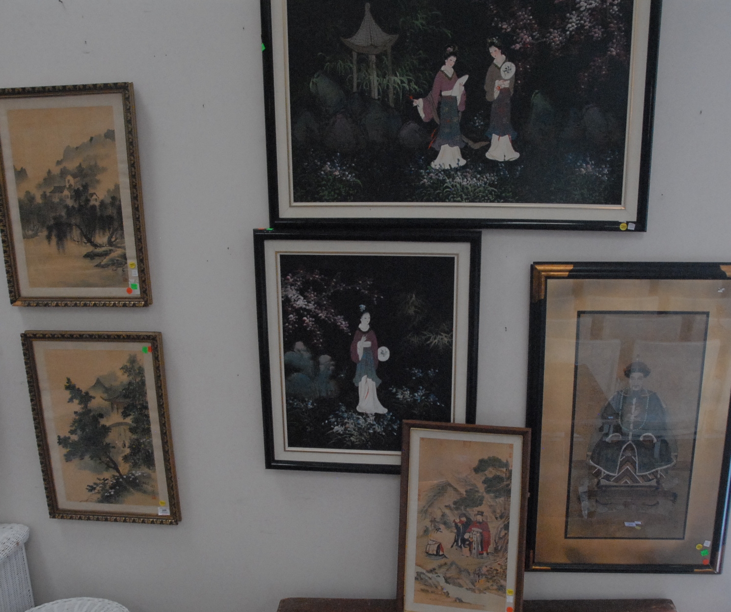Lot 350: Group of six framed paintings: oil on canvas, two prints, and pair of watercolor on paper landscapes. 21 x 13 to 21 x 36