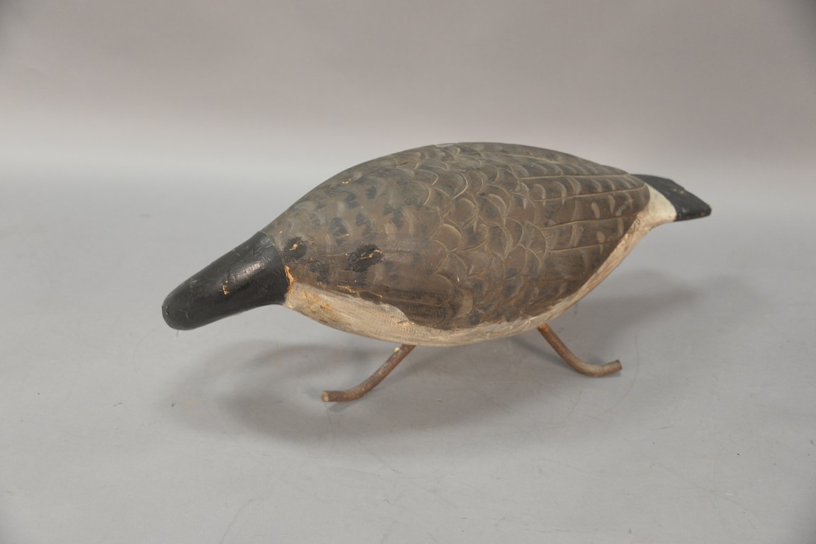Large Prince Edward Island, Canada, carved wood goose decoy with glass eyes and painted with brown, black, and white plumage, set on iron legs. ht. 10in, lg. 28in.