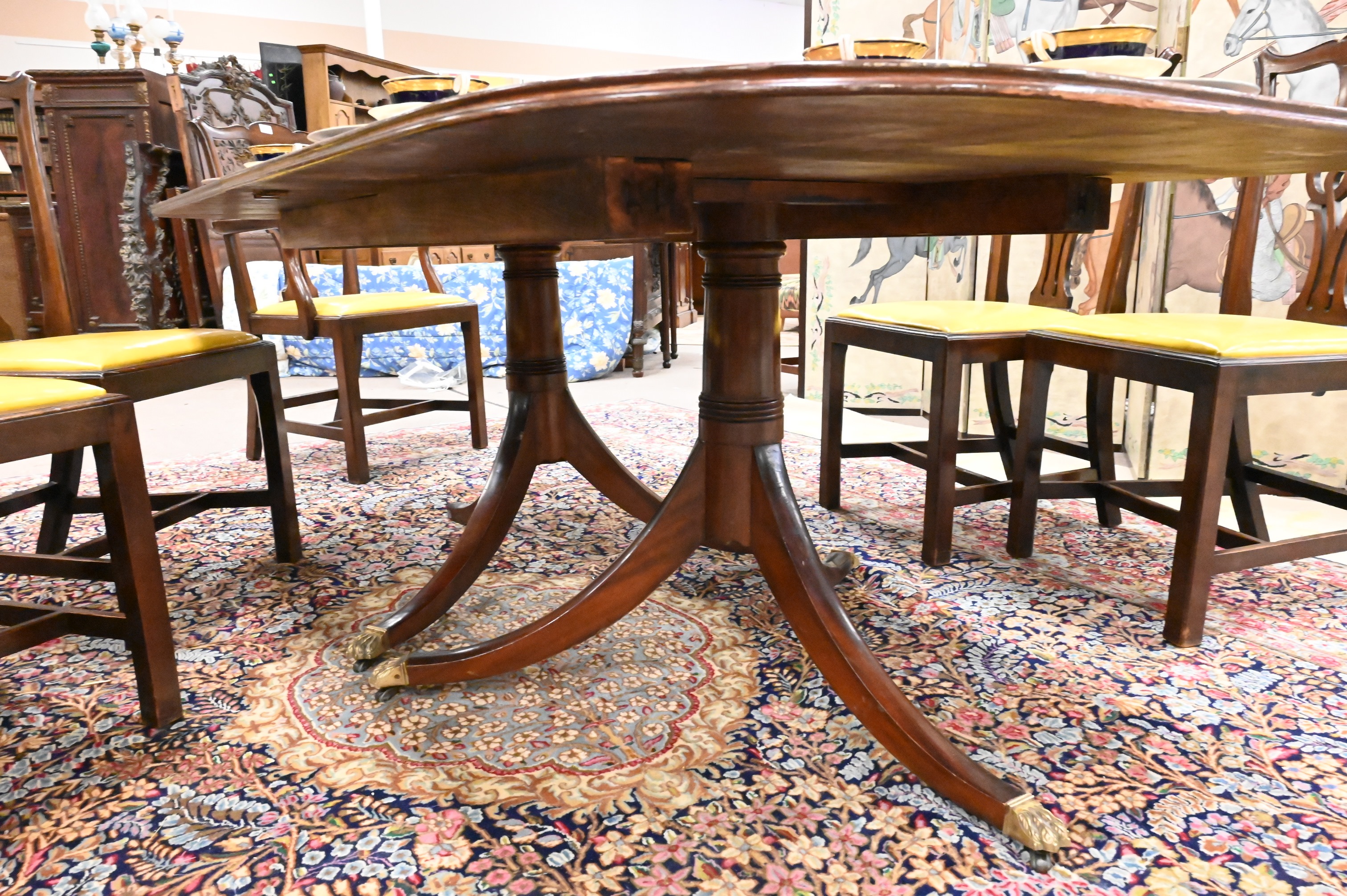 Mahogany Double Pedestal Dining Table, with banded inlaid top and leaves and pads, height 28 inches, top 40″ x 80″, table open 45″ x 128″