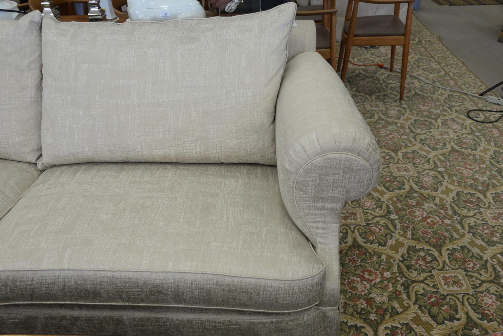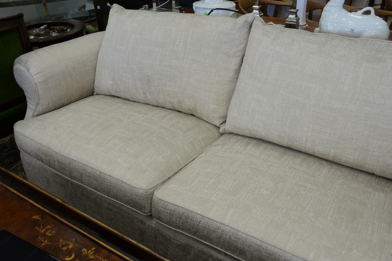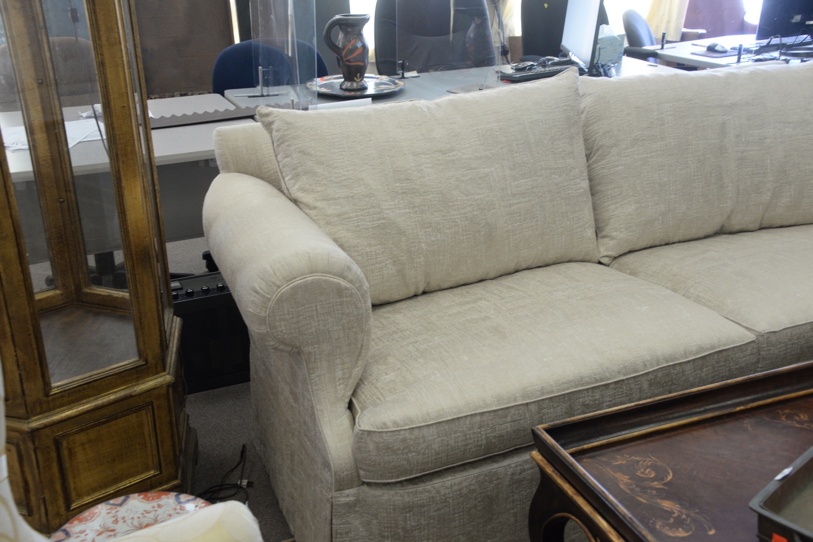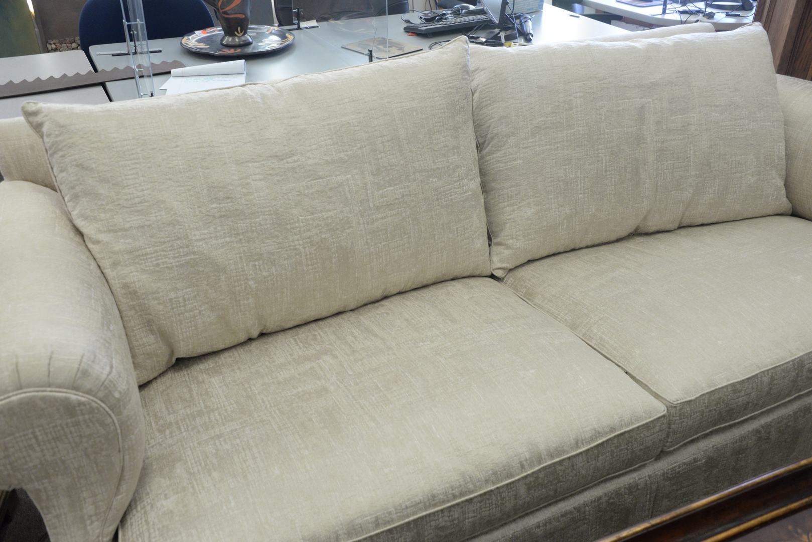 Lot 350: Pair of E.J. Victor Upholstered Sofas having custom upholstery, like new condition, height 35 inches, length 90 inches.