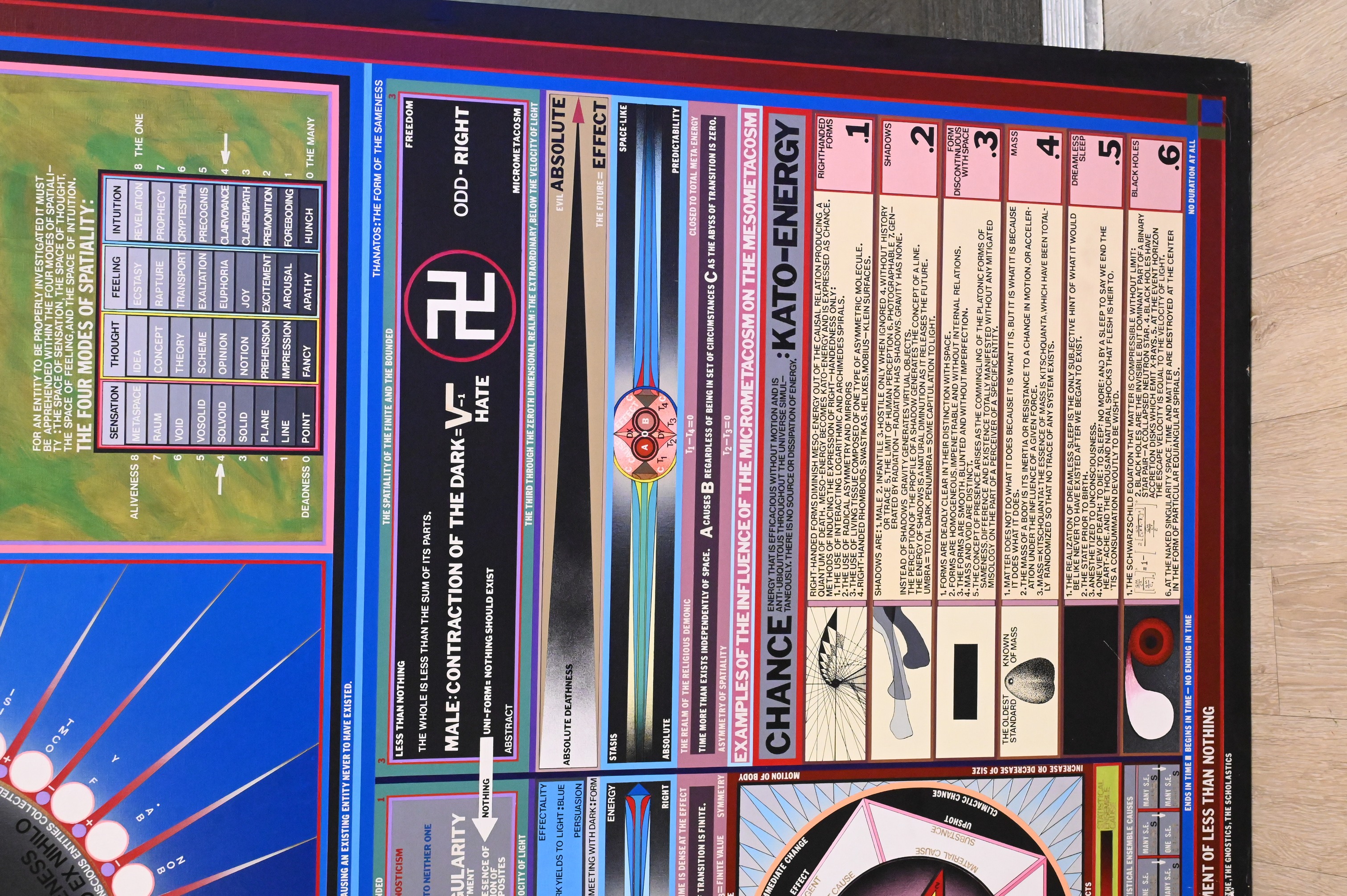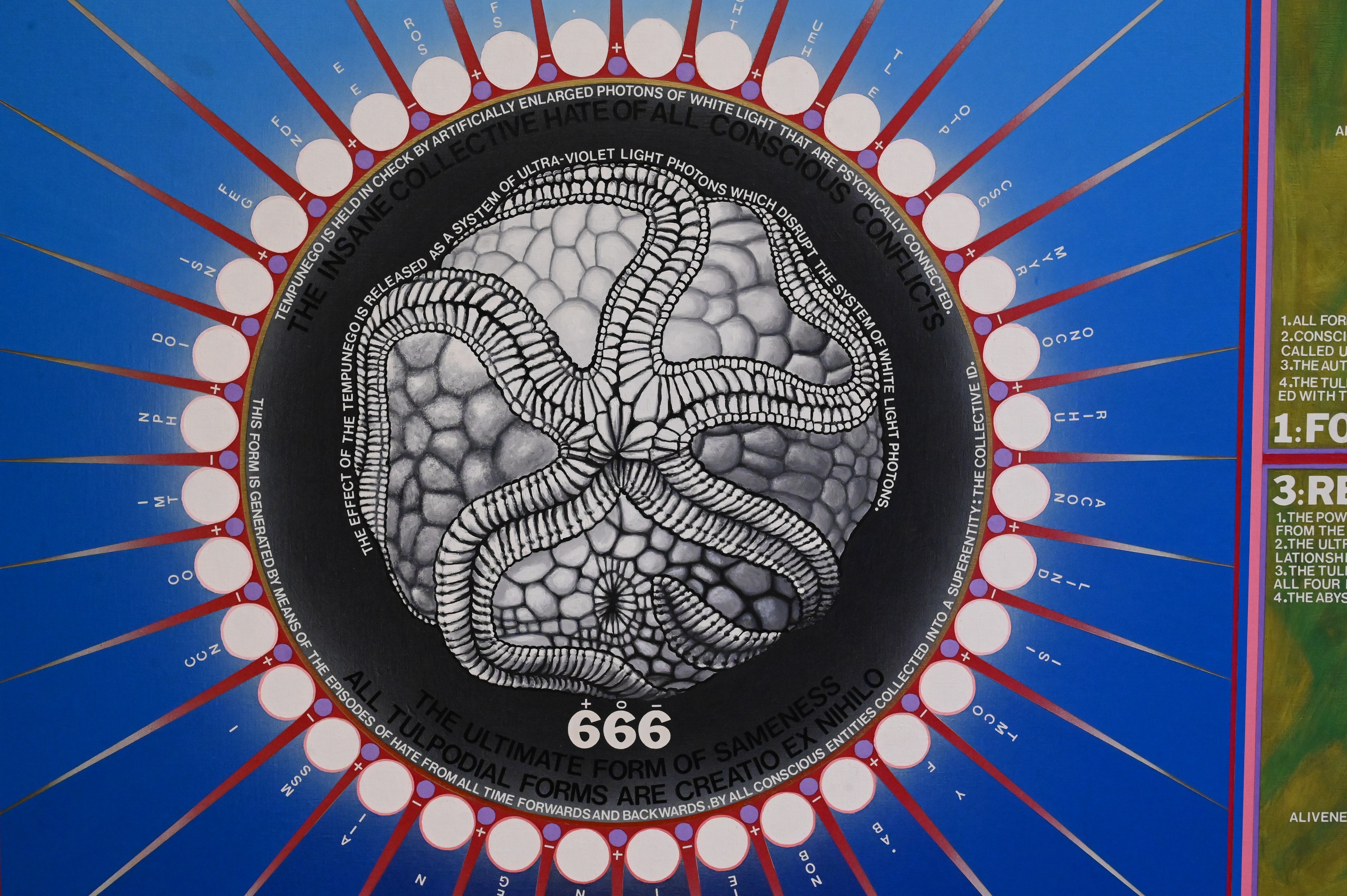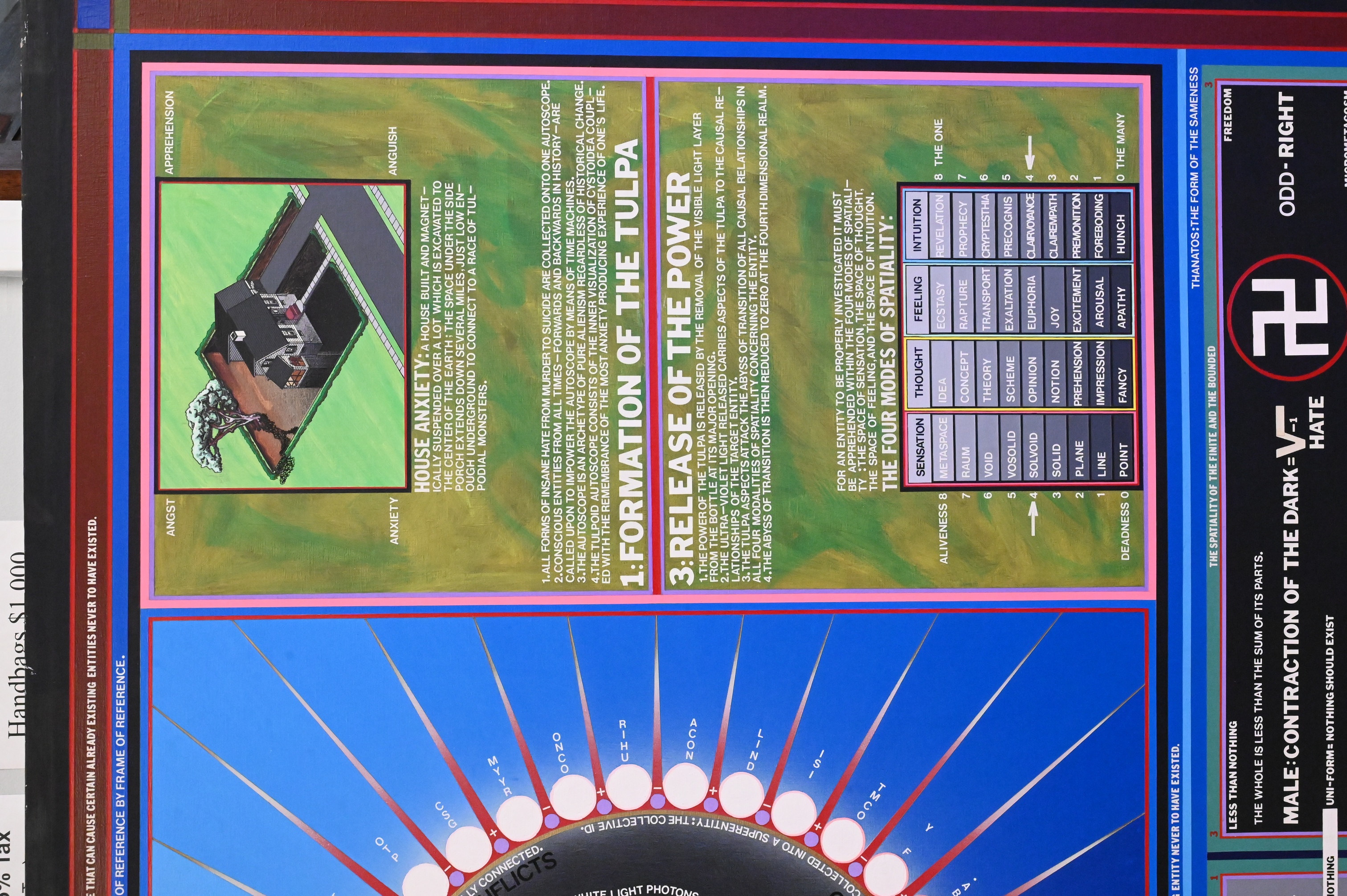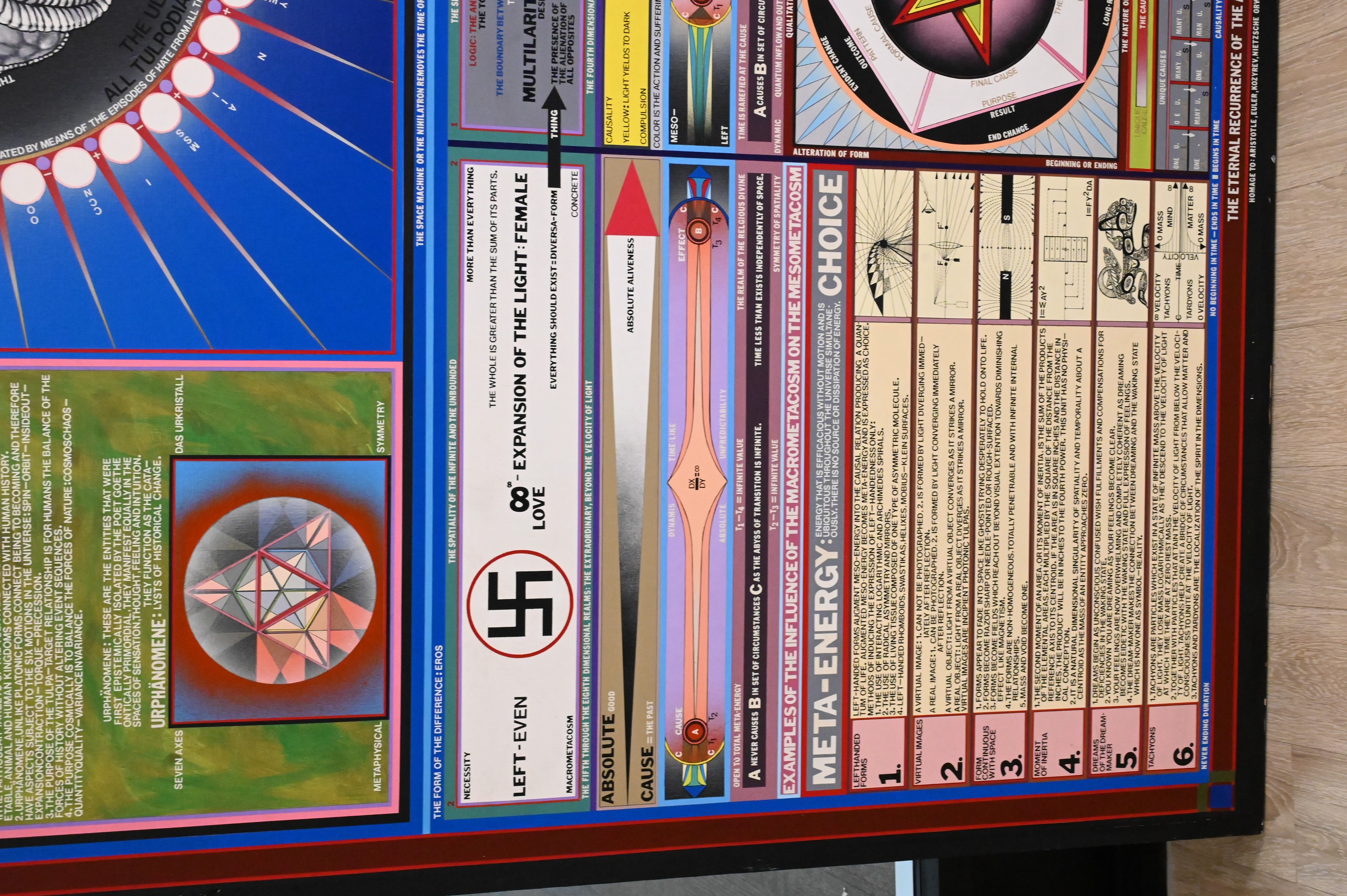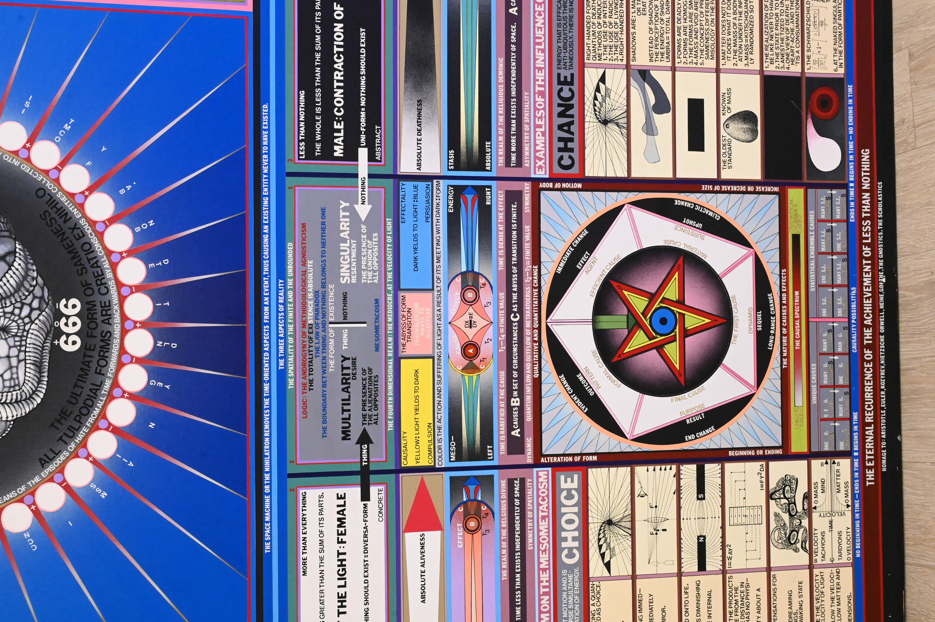 diagrammatic painting that functions like a visual map of a speculative system, combining dense text, symbols, and geometric forms into a single unified structure. At its center, a radiating circular form anchors a network of charts and explanatory panels that suggest an exploration of energy, consciousness, and metaphysical order rather than a traditional narrative scene