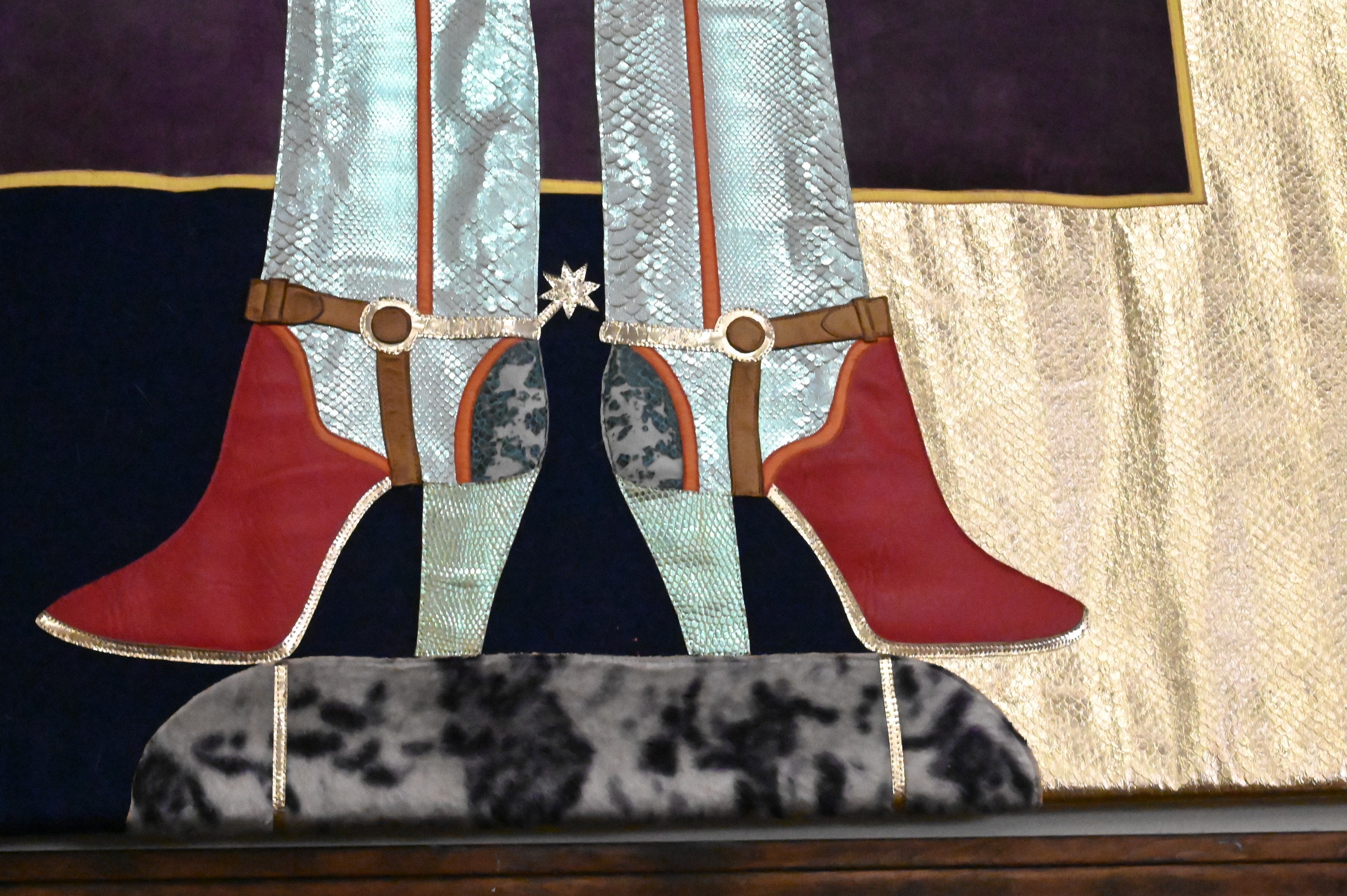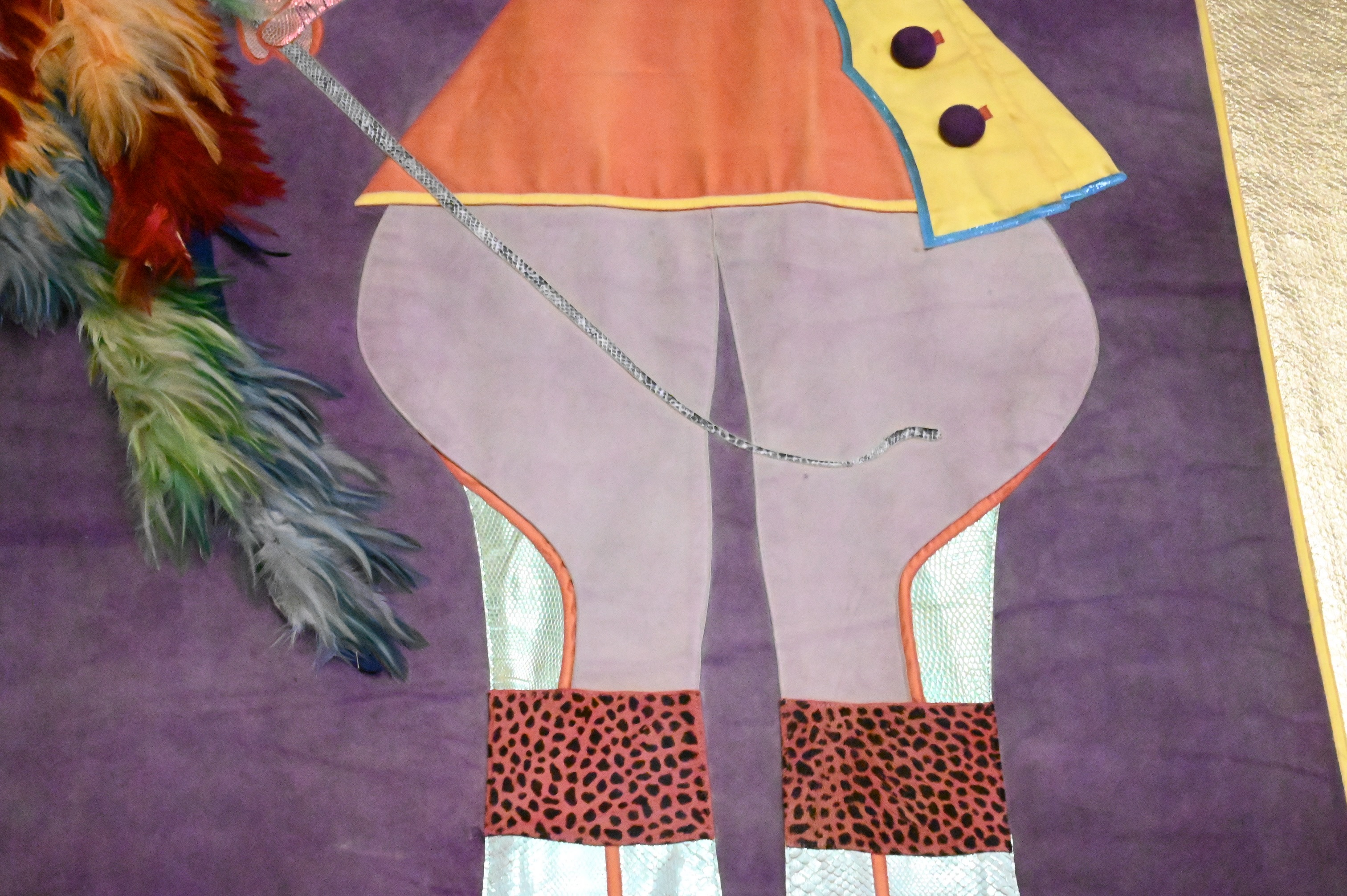 Felt tapestry collage with suede satin, velvet, and feathers