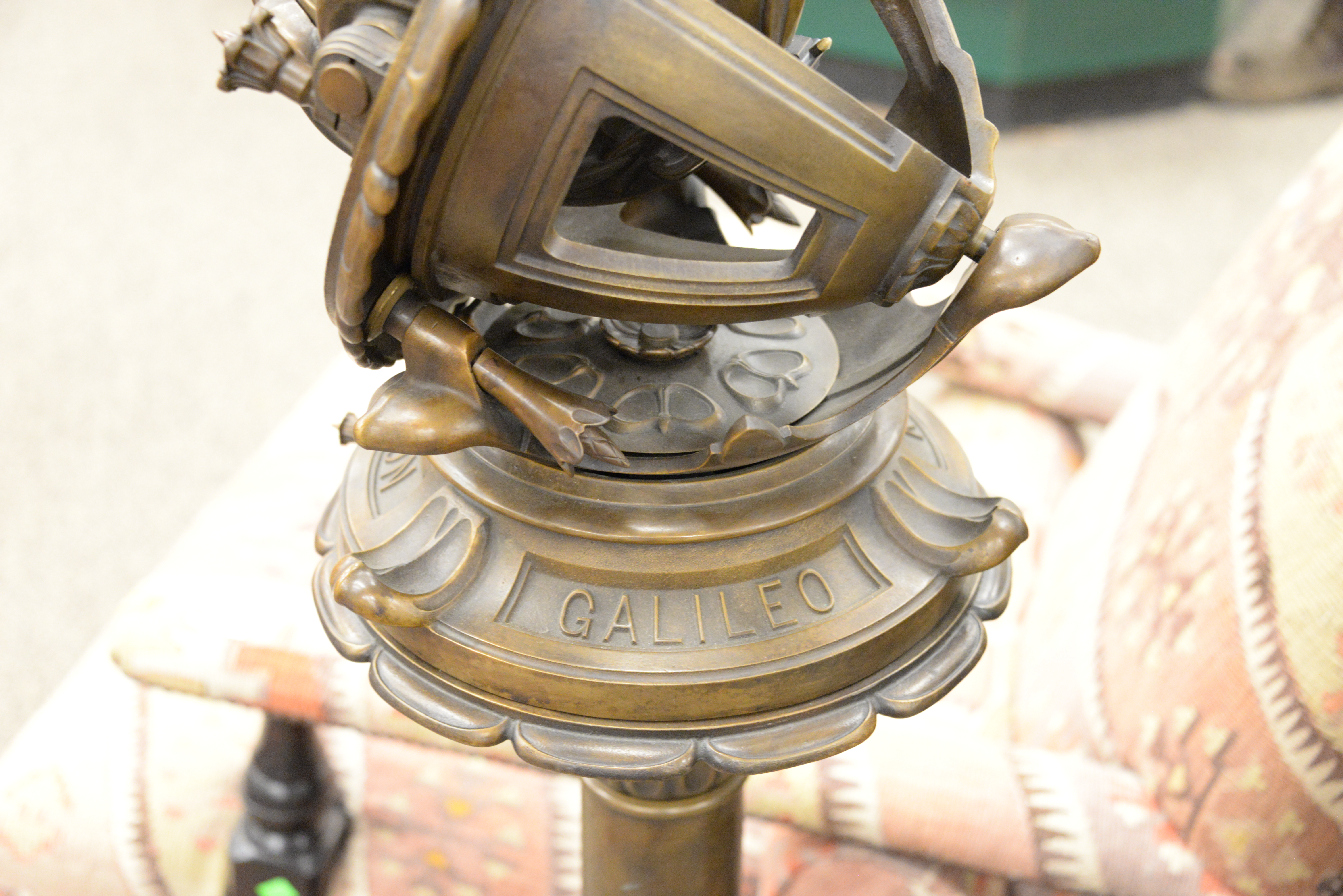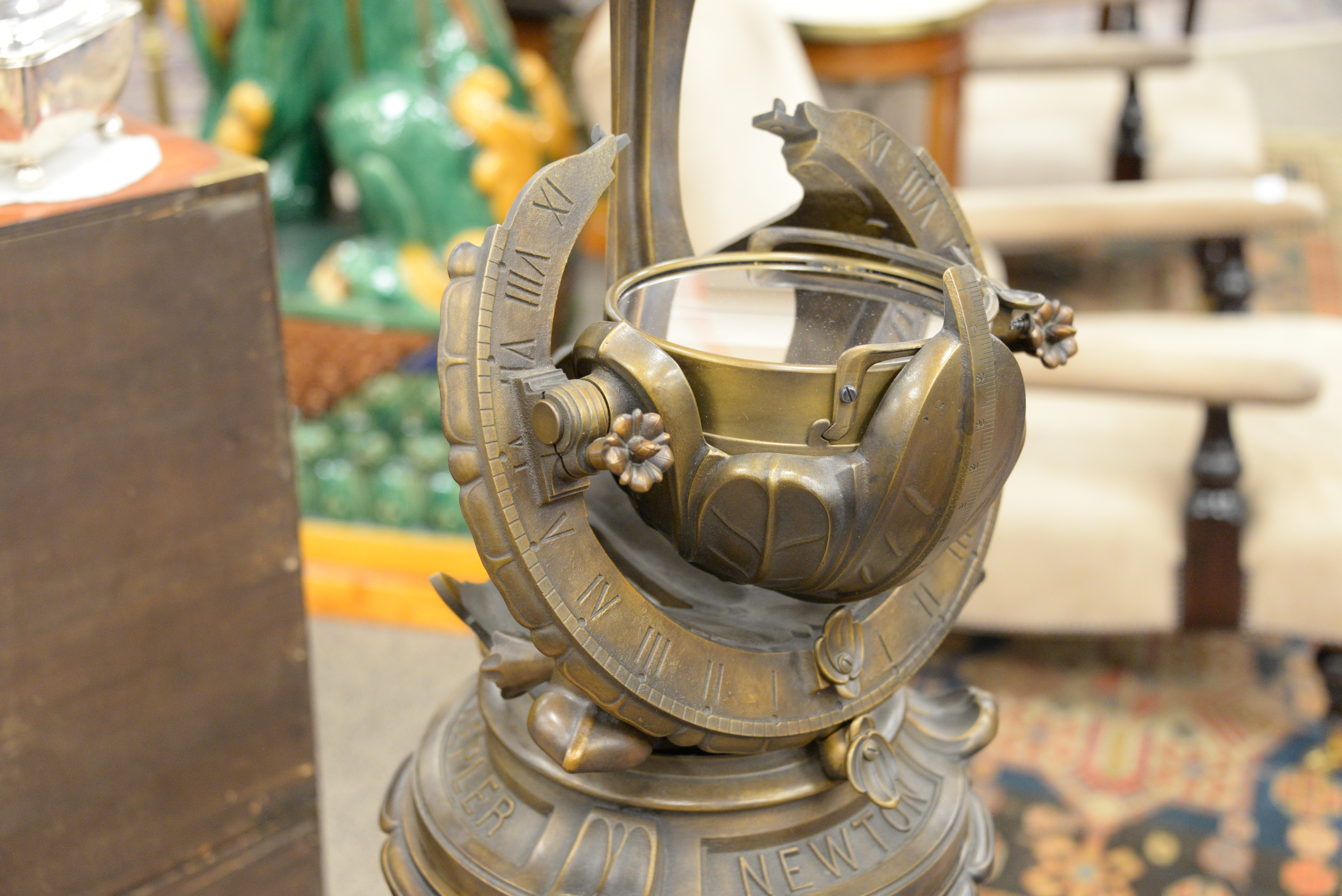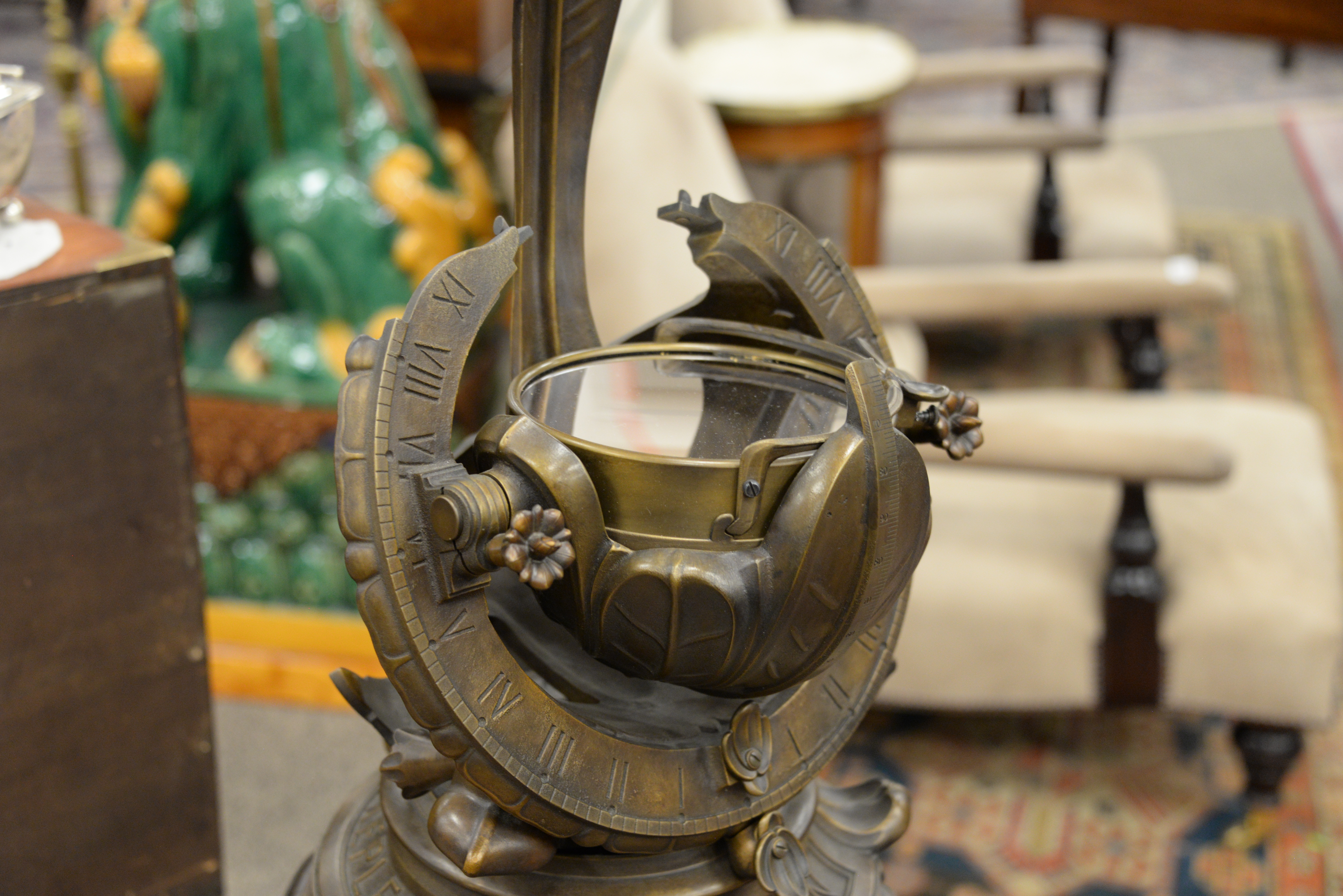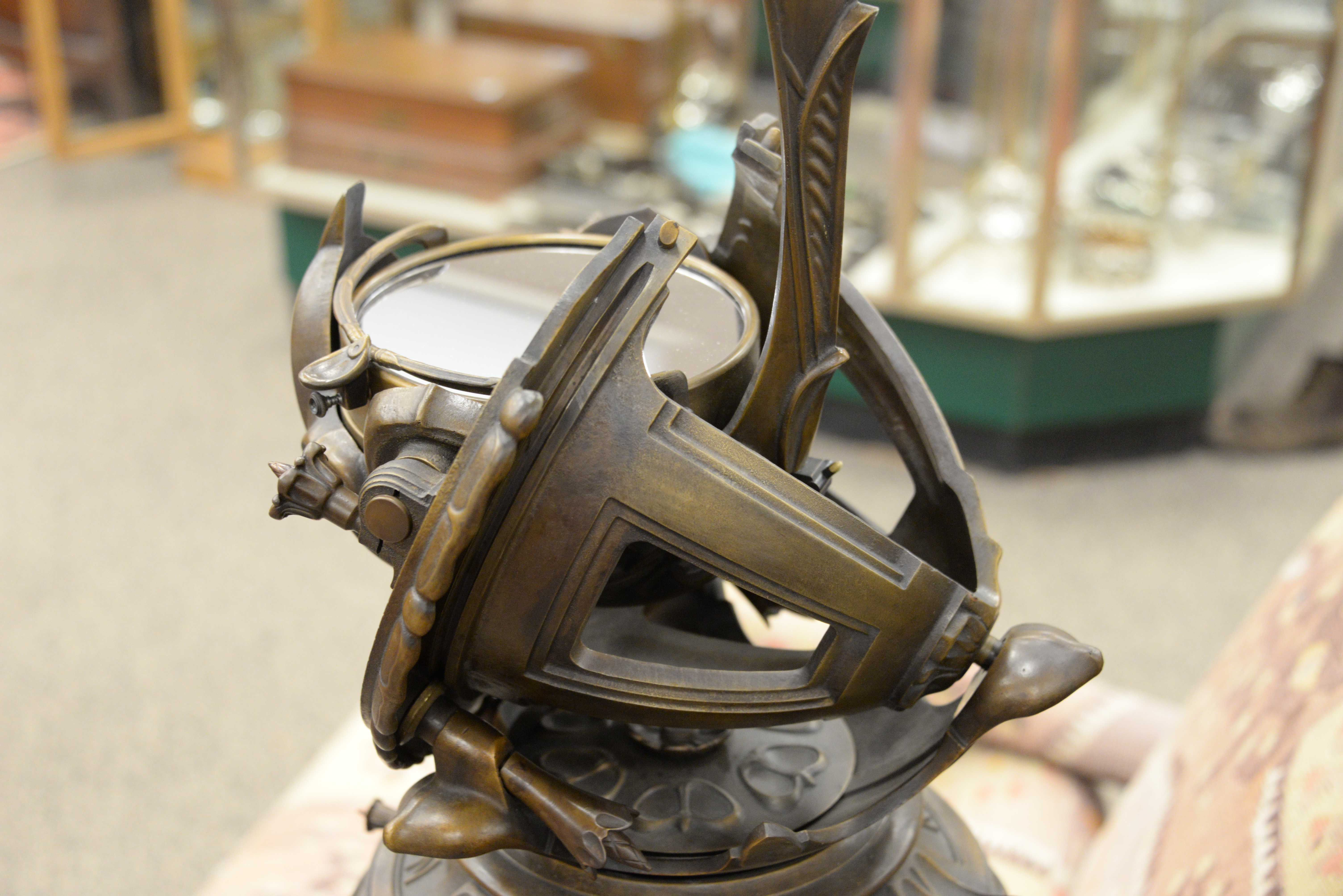 The Porter Garden Telescope, by Telescopes of Vermont, a limited edition authorized exact reproduction of Russel W. Porter’s 1923 telescope, made by The Telescopes of Vermont, cast in bronze, the reflecting telescope was adorned with sculpted lotus petals and curving leaves, optics disguised in overlapping bronze leaves, while the motion controls were hidden in a pair of cylindrical flowers, currently there are only 20 in the world, height 68 inches, width 17 inches, diameter 17 inches.