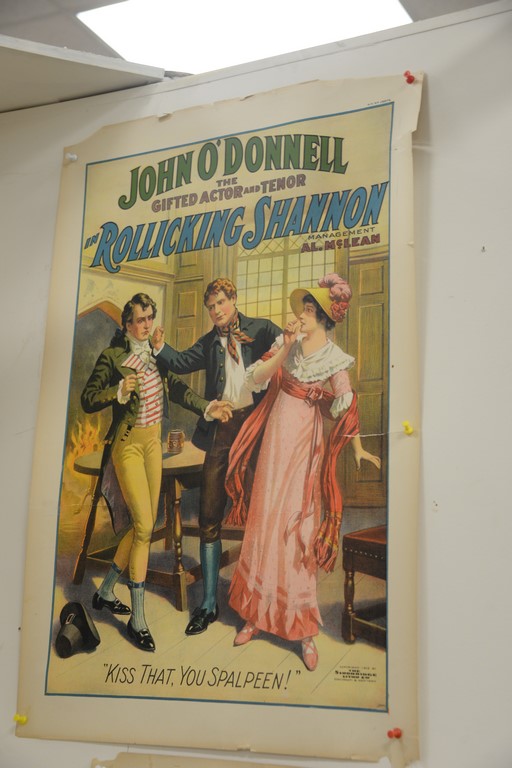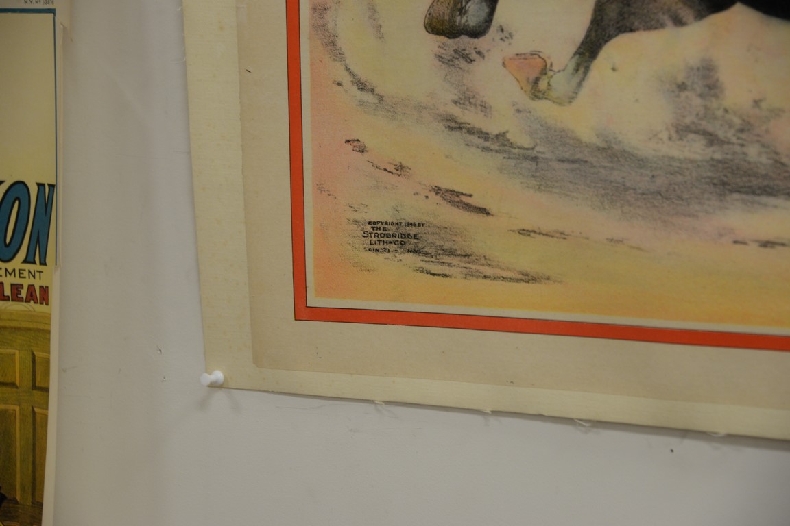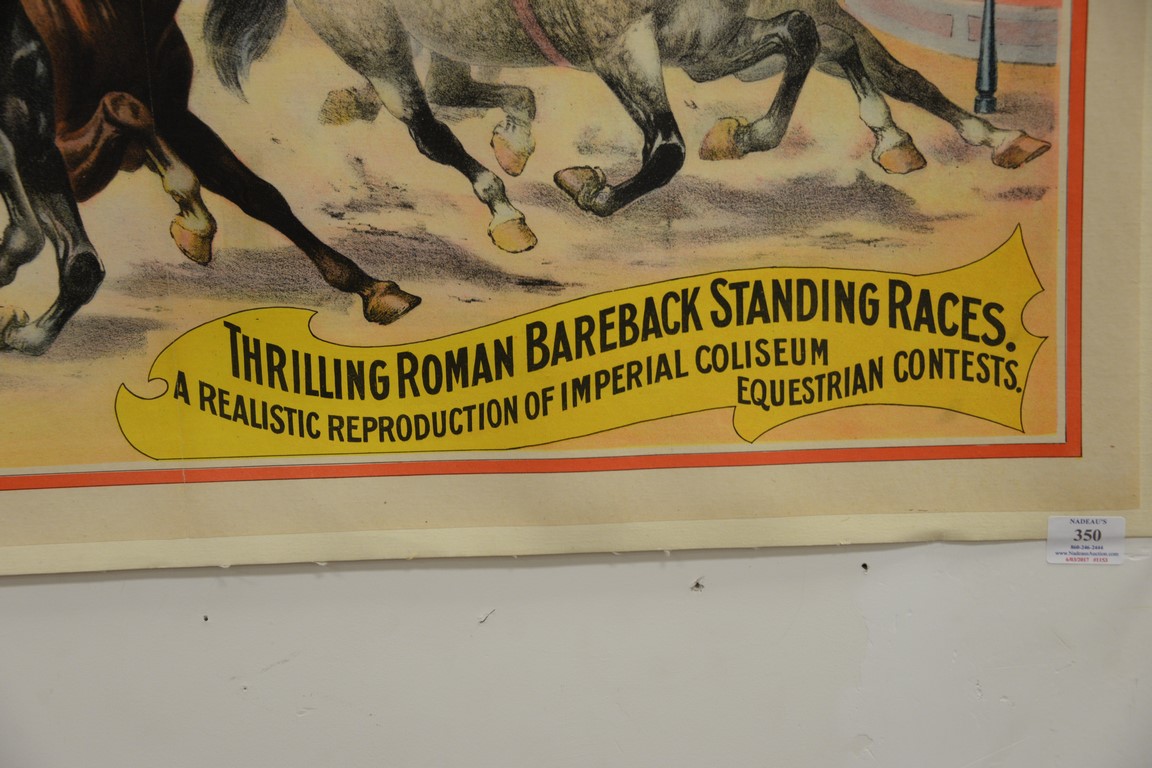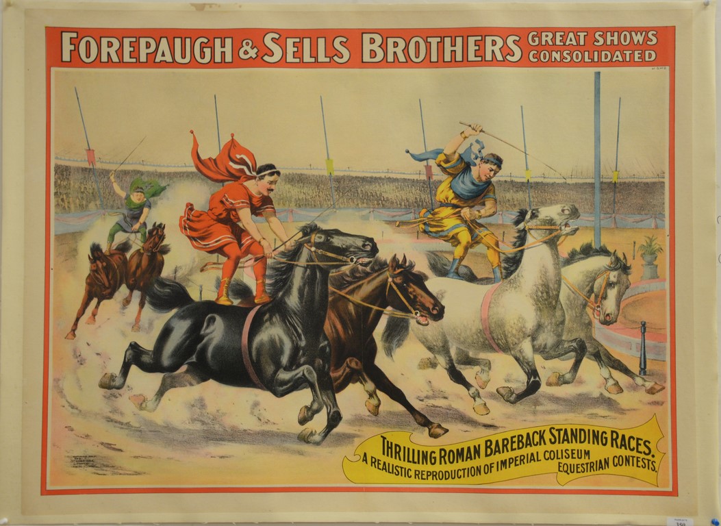 Three posters including Forepaugh and Sells Brothers Great Shows Consolidated original lithograph poster backed on canvas, Thrilling Roman Bareback Standing Races A realistic Reproduction of Imperial Coliseum Equestrian Contests, Copyright 1896 by the Strobridge Lith Co., along with two John O’Donnell posters as is.