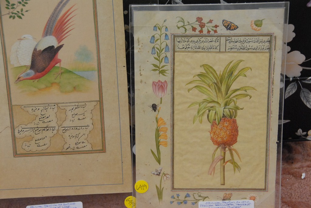 Lot 350: Three small watercolors on paper Persian manuscripts one of monkey and one of fruit and one of birds.