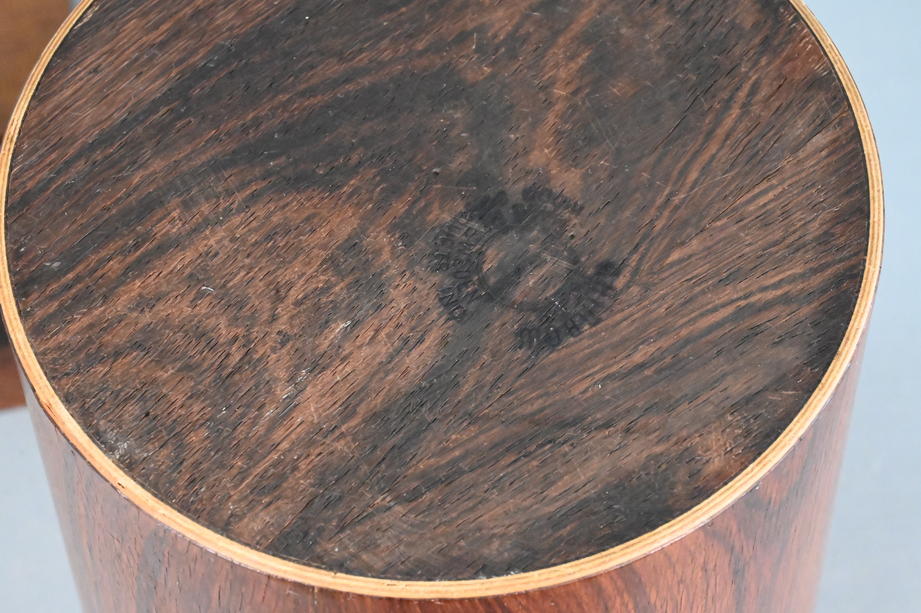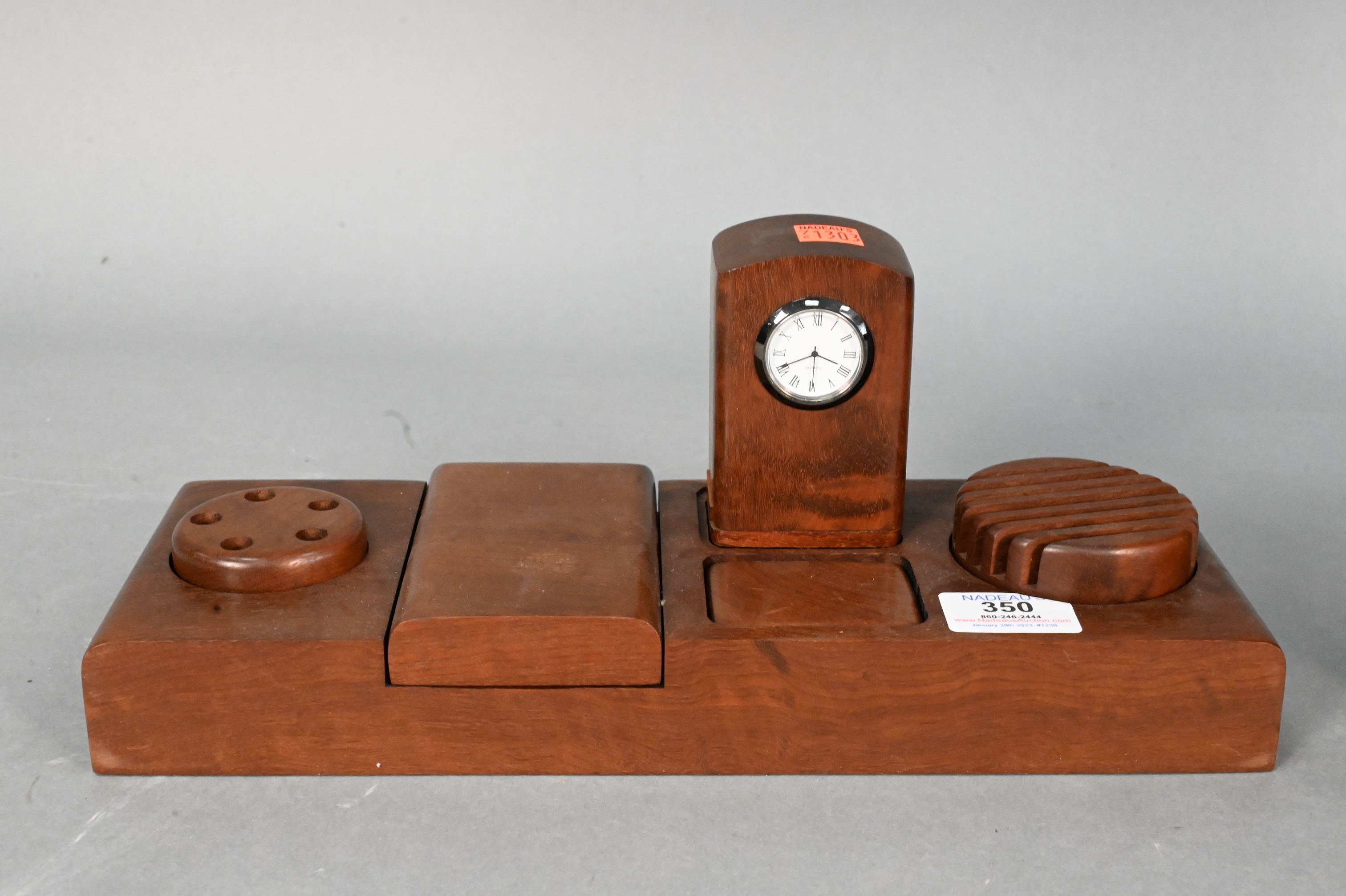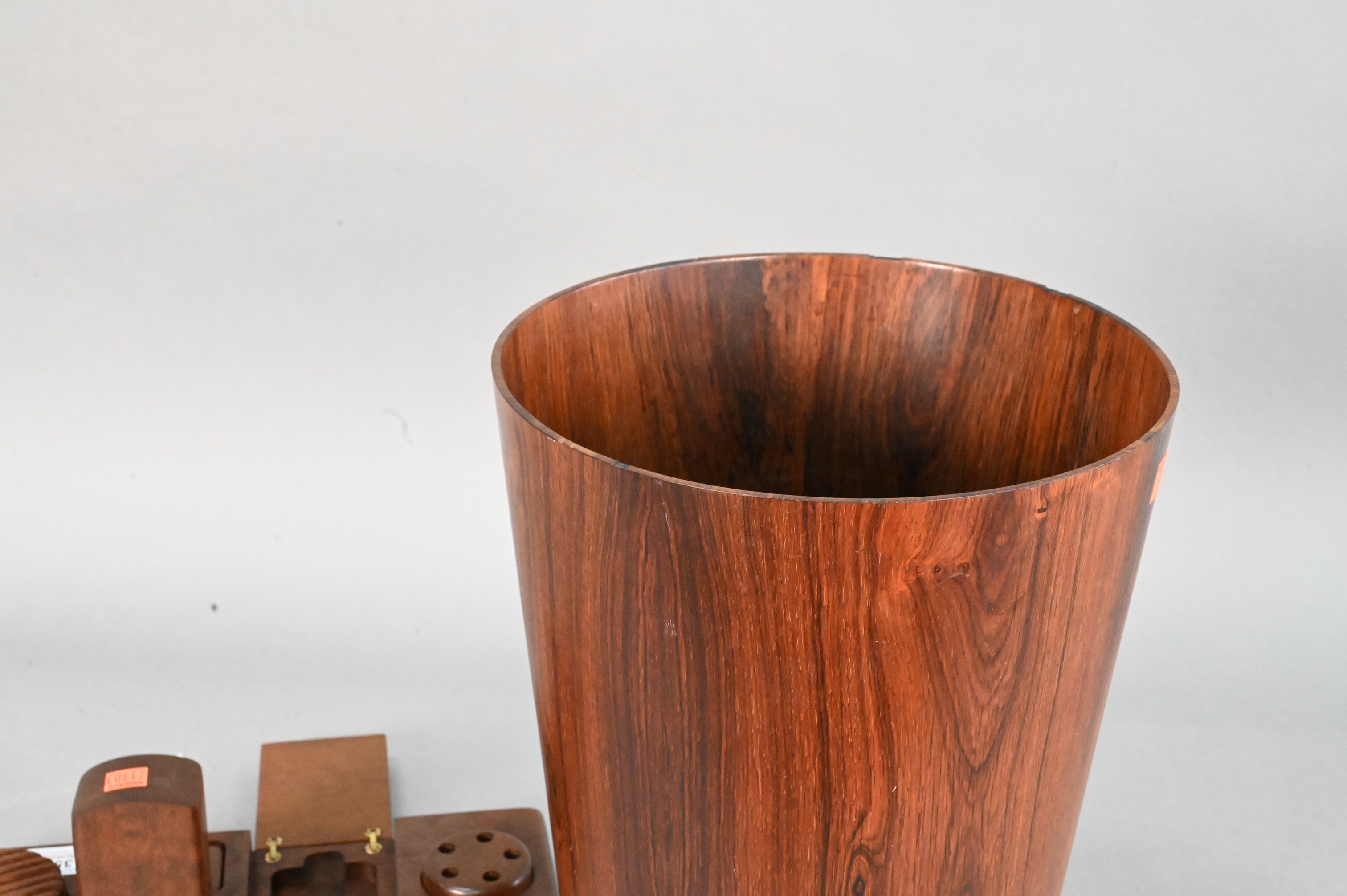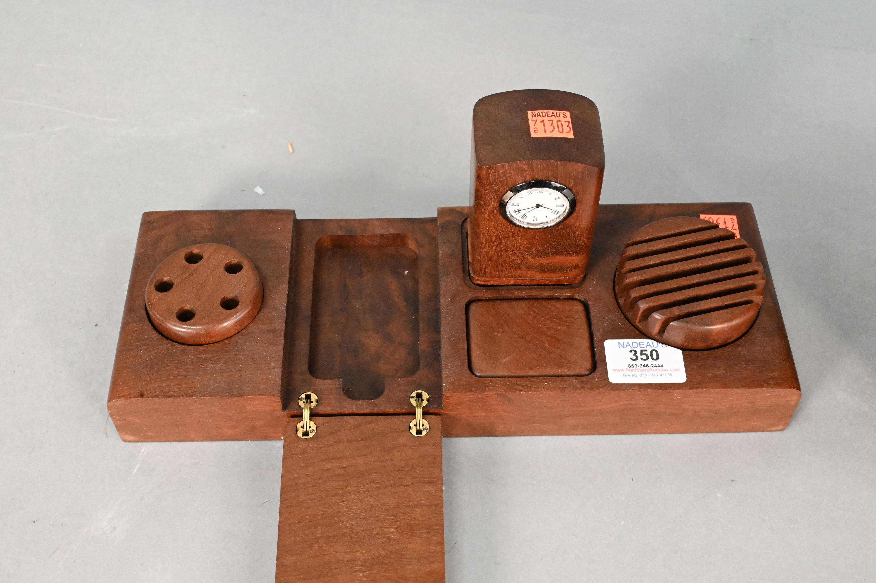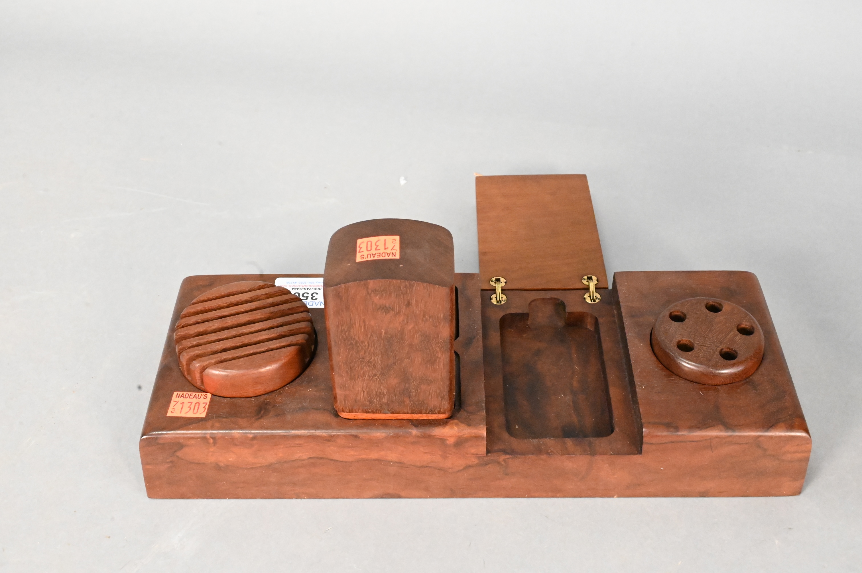 Two Piece Lot, to include a Michel Elkan Studios desk set, signed on base, length 13 1/2 inches; along with a Scandinavian teak waste basket by Rainbow Wood Products, height 15 3/4 inches.
