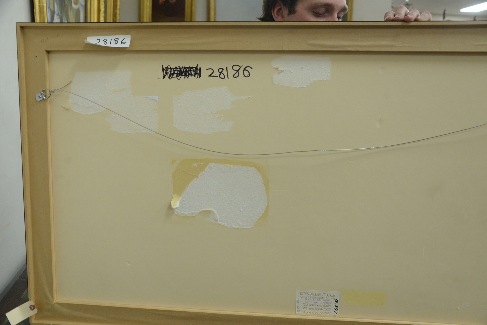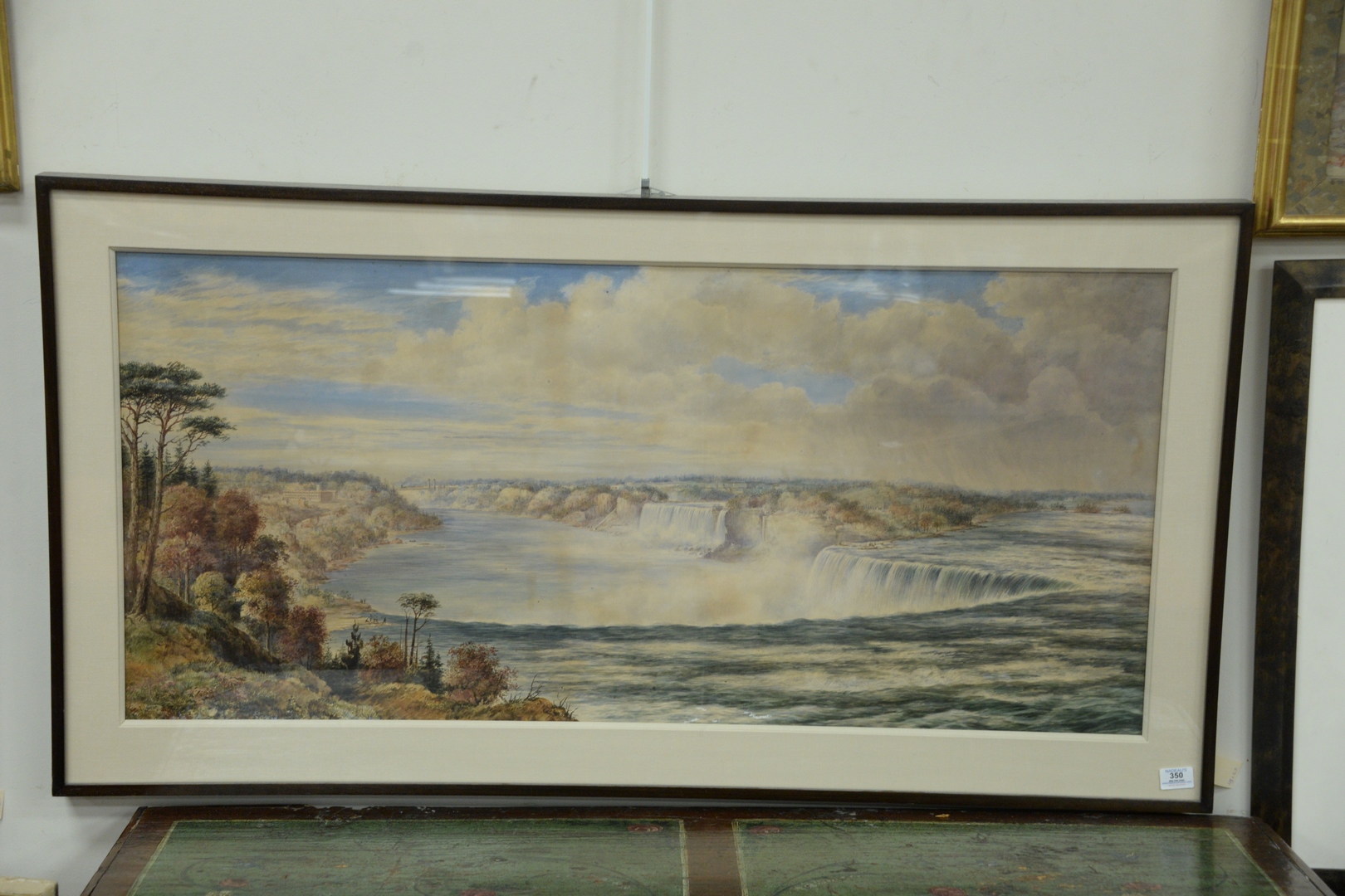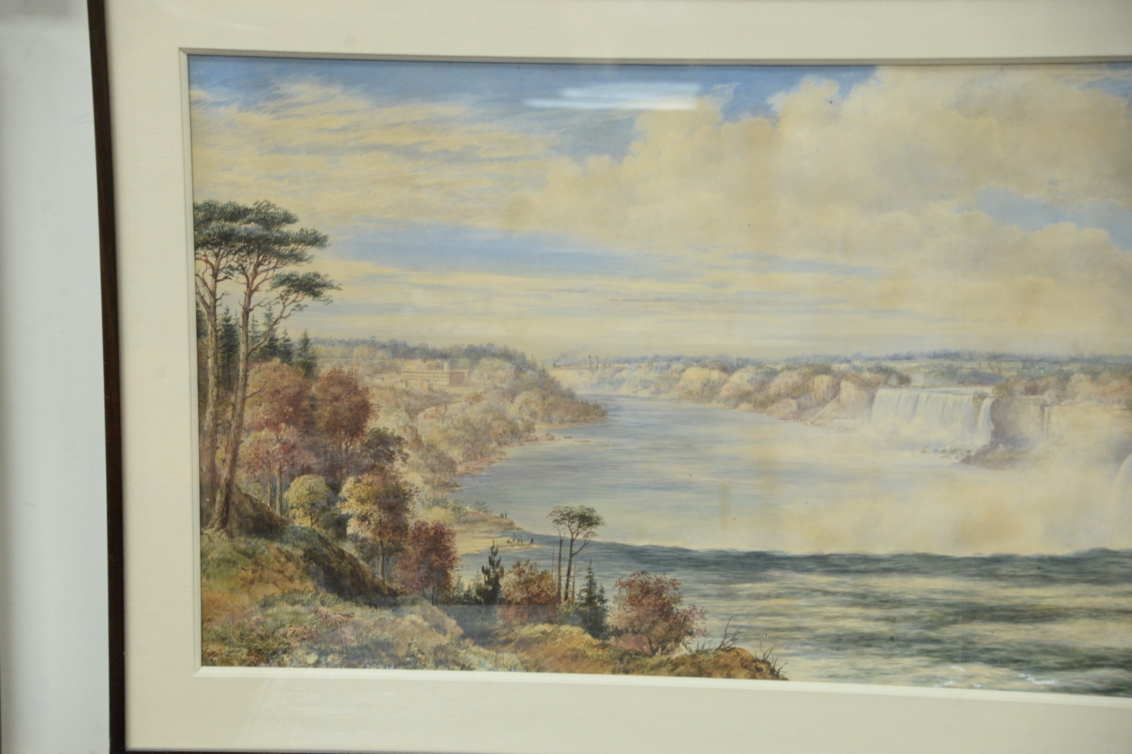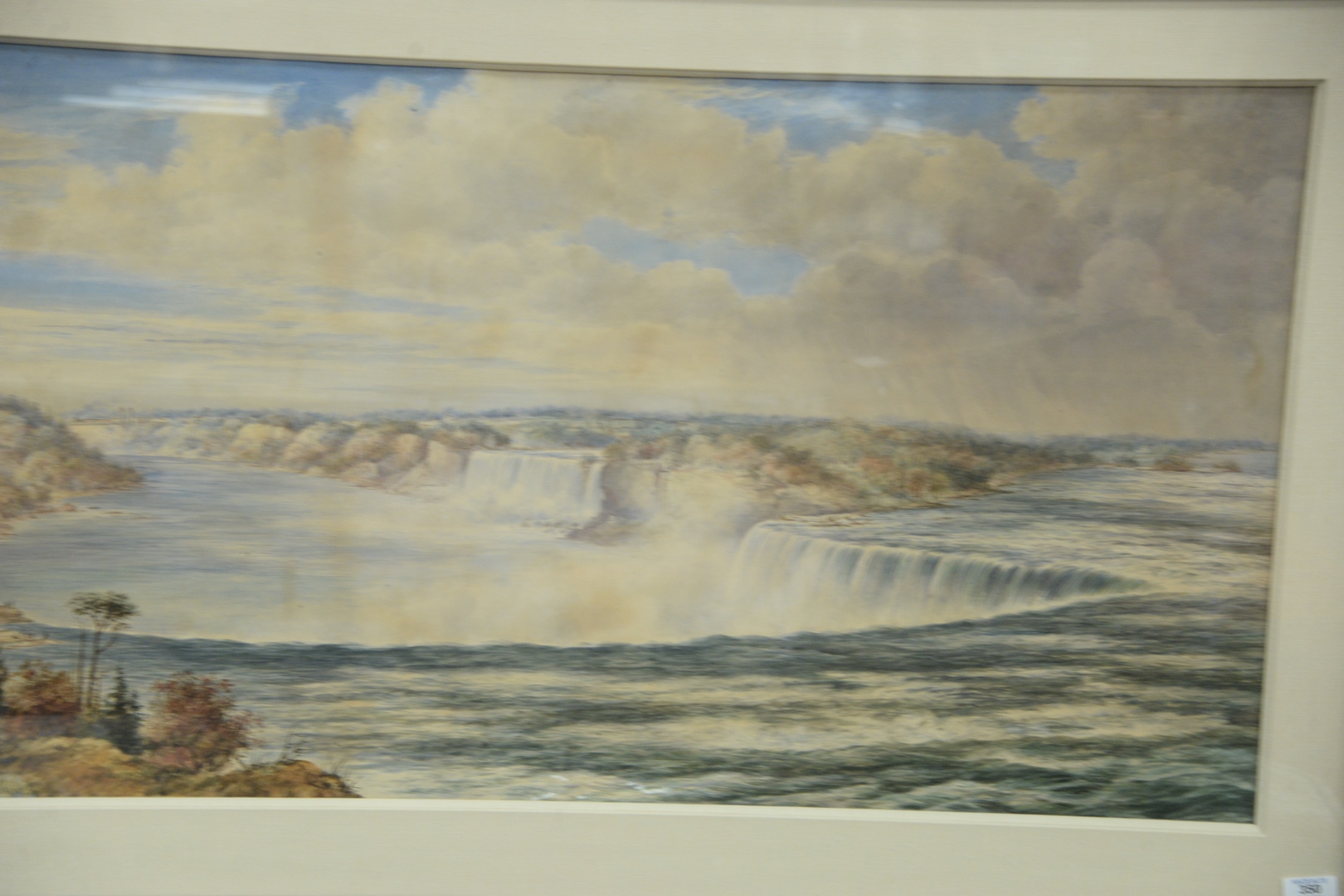 Lot 350: Washington Friend British/American, 1820 – 1886, Niagara Falls From Above with railroad and train on bridge in background, watercolor on paper, possibly signed faintly lower left, sight size 22 1/2 x 47 1/2