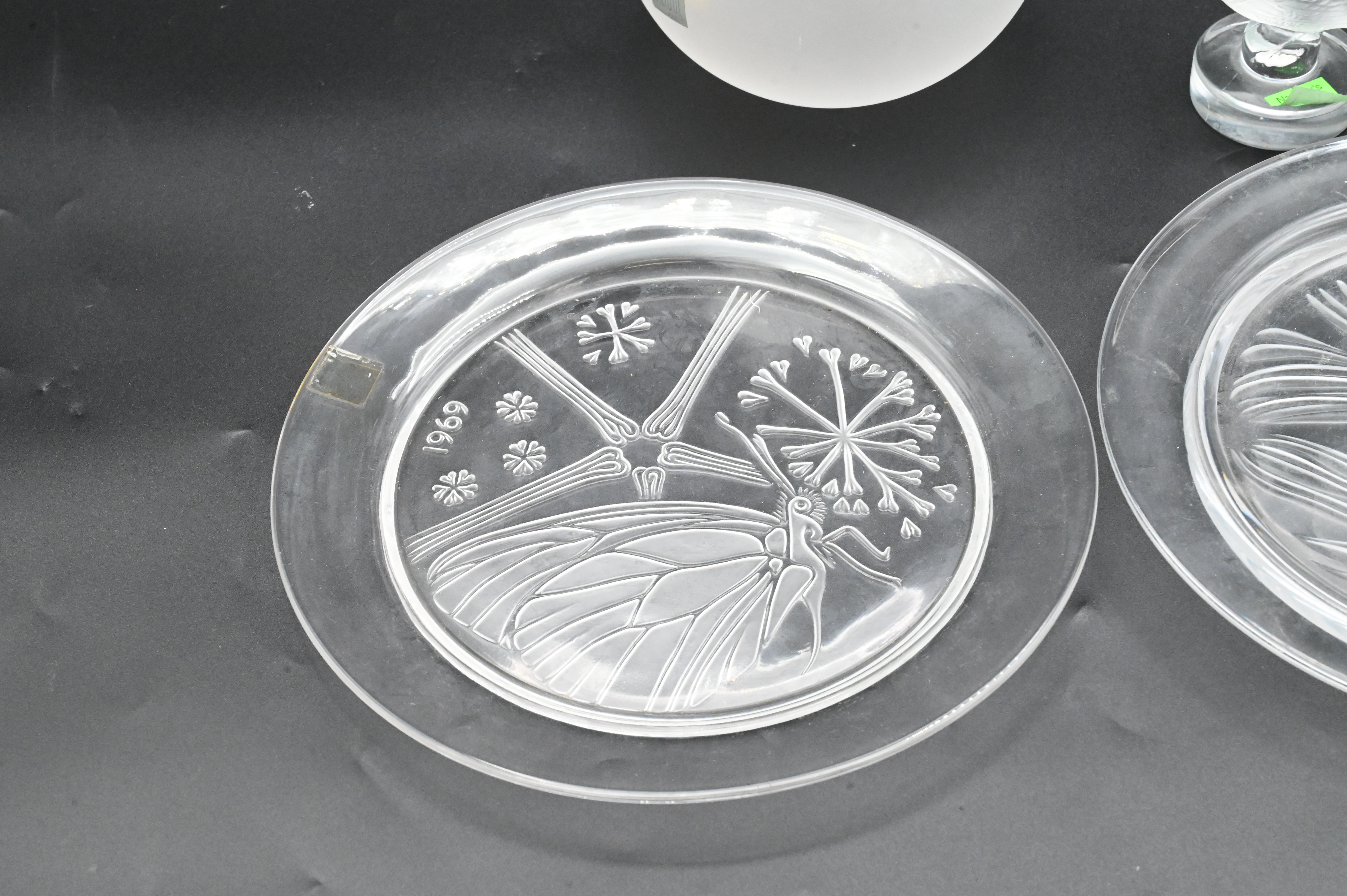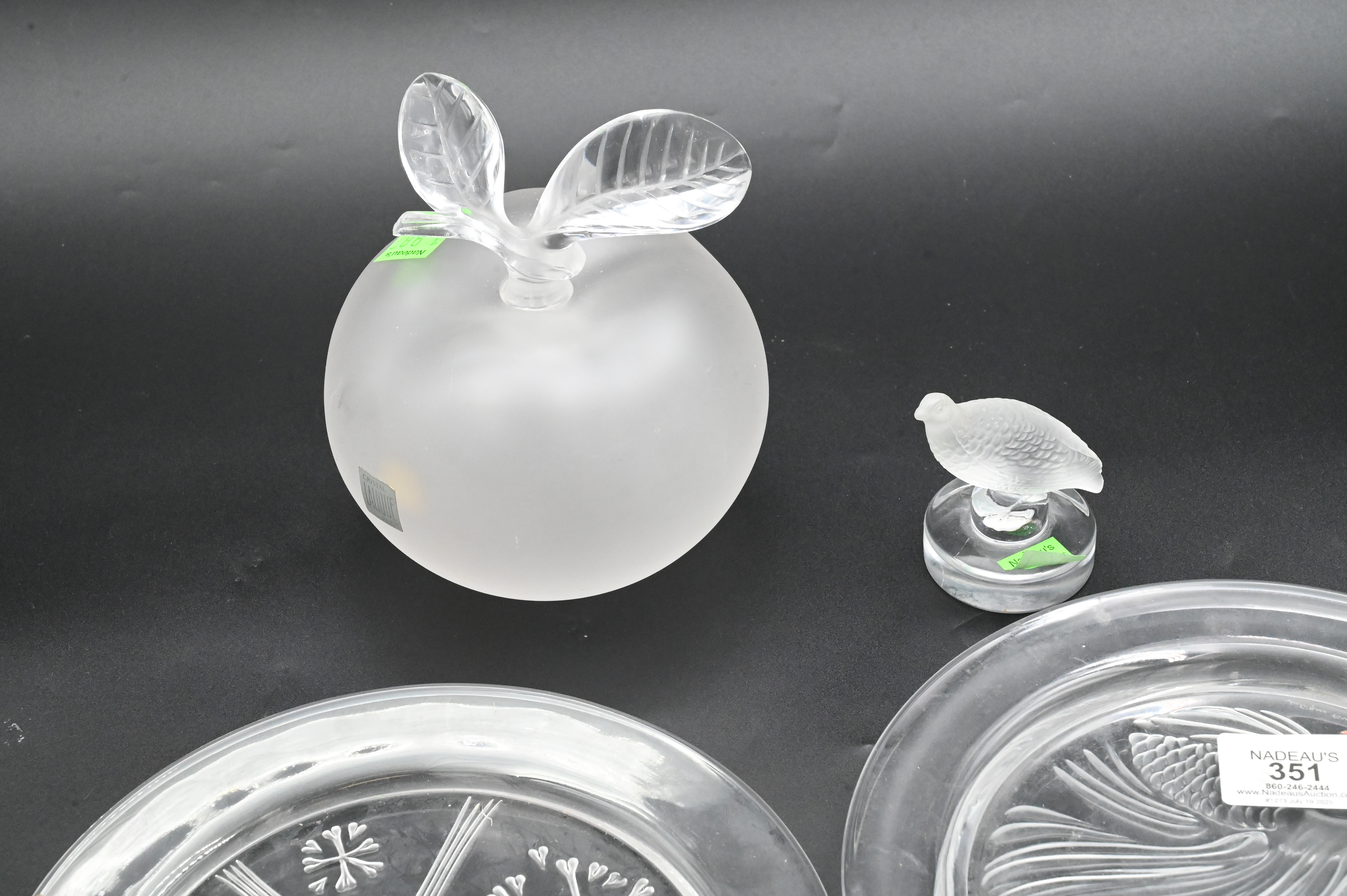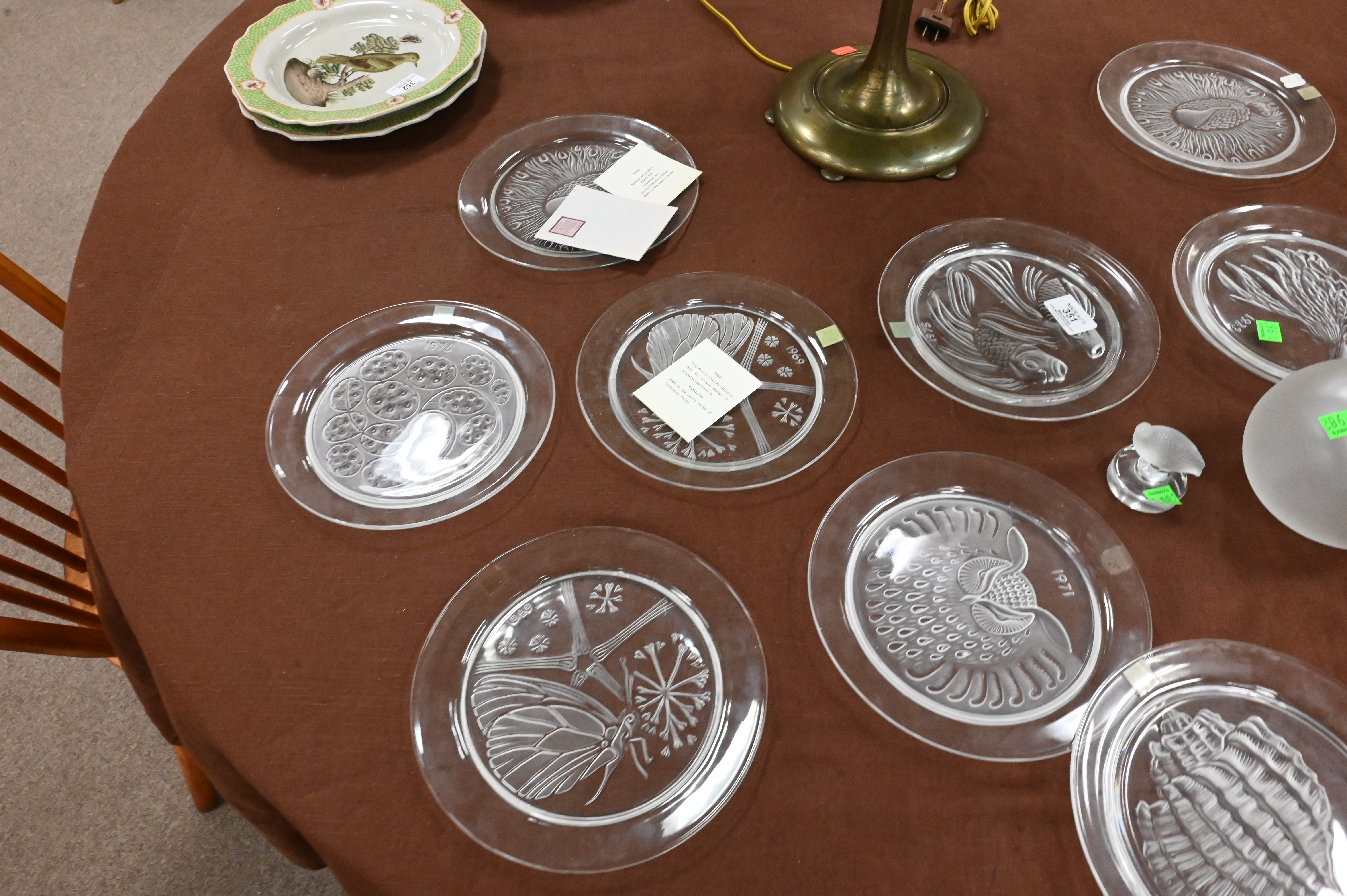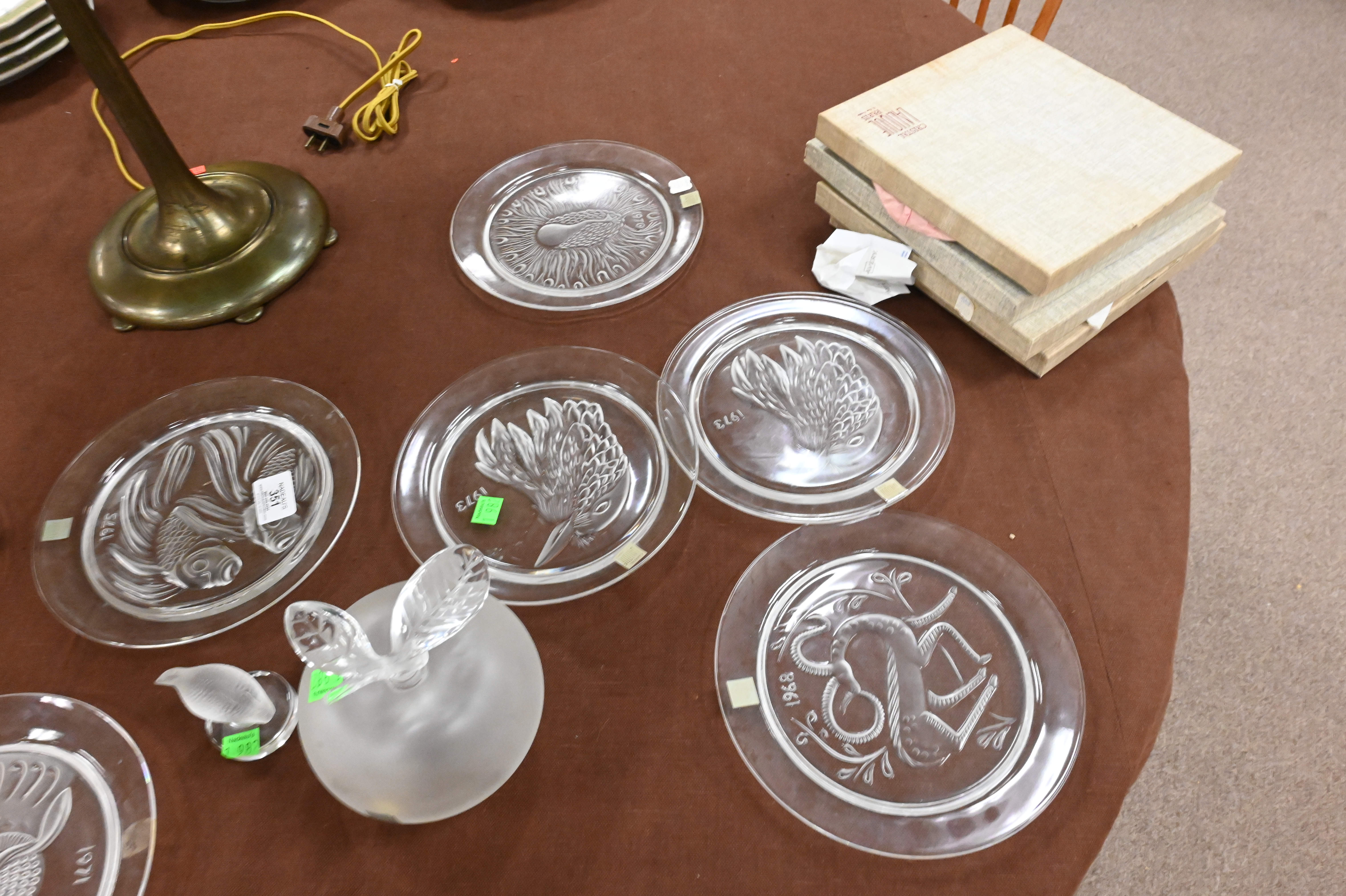 eleven etched crystal annual plates, 1968-1975, having gazelle, bird, butterfly, fish, peacock, owl and shell designs (with original boxes) along with a small quail paperweight and “Grande Pomme” large apple perfume decanter with leaf stopper, each signed in script Lalique France