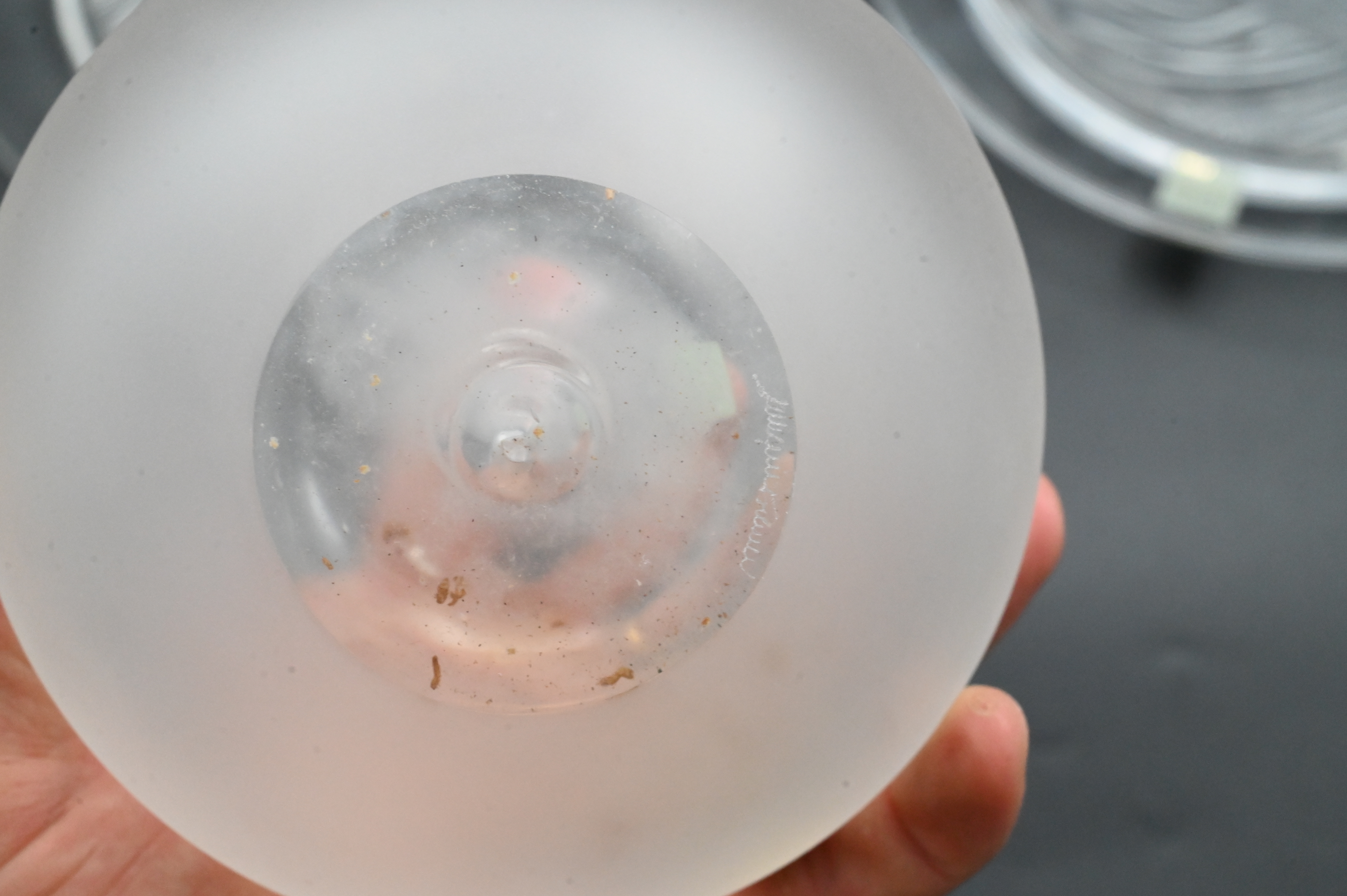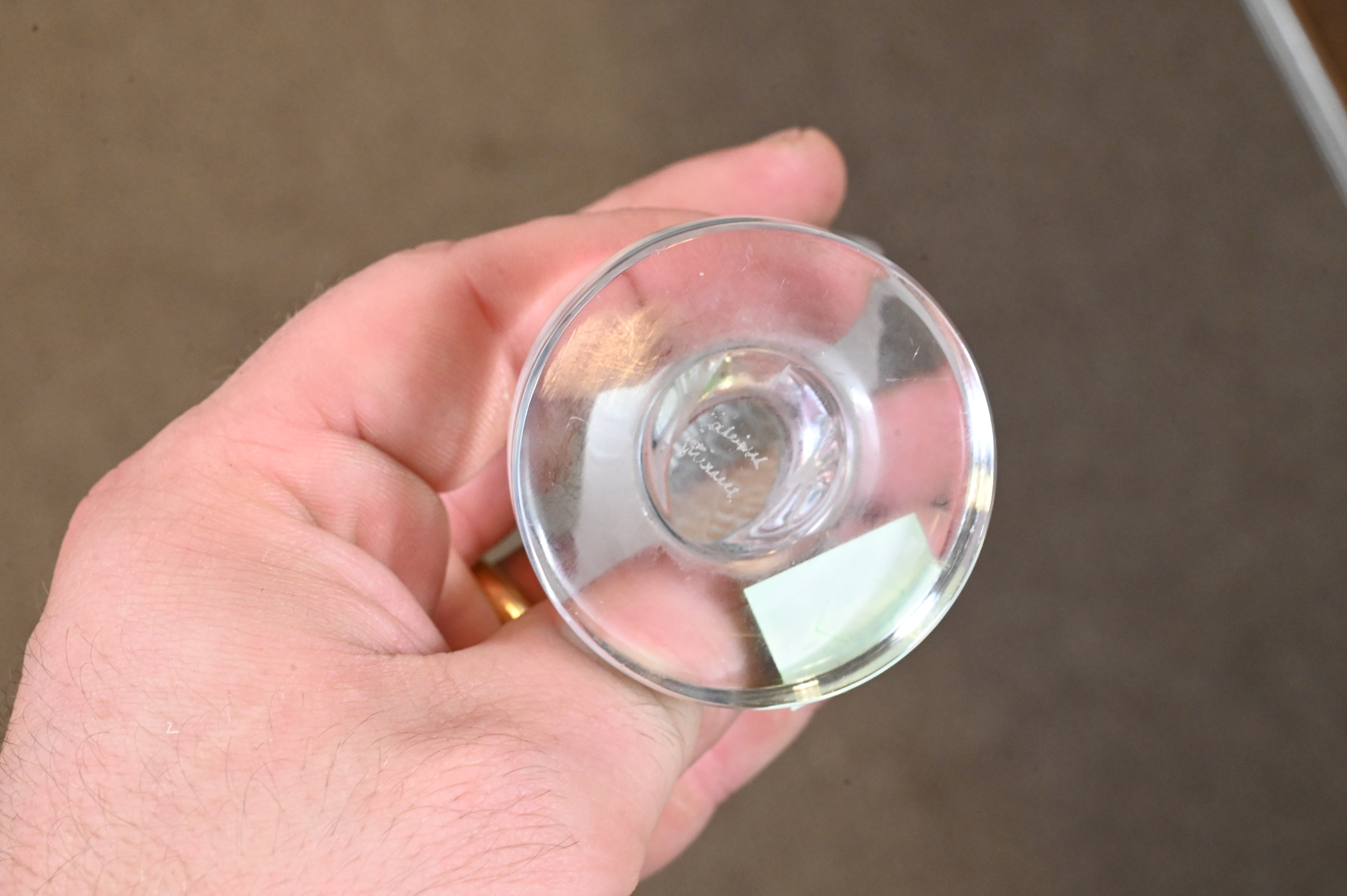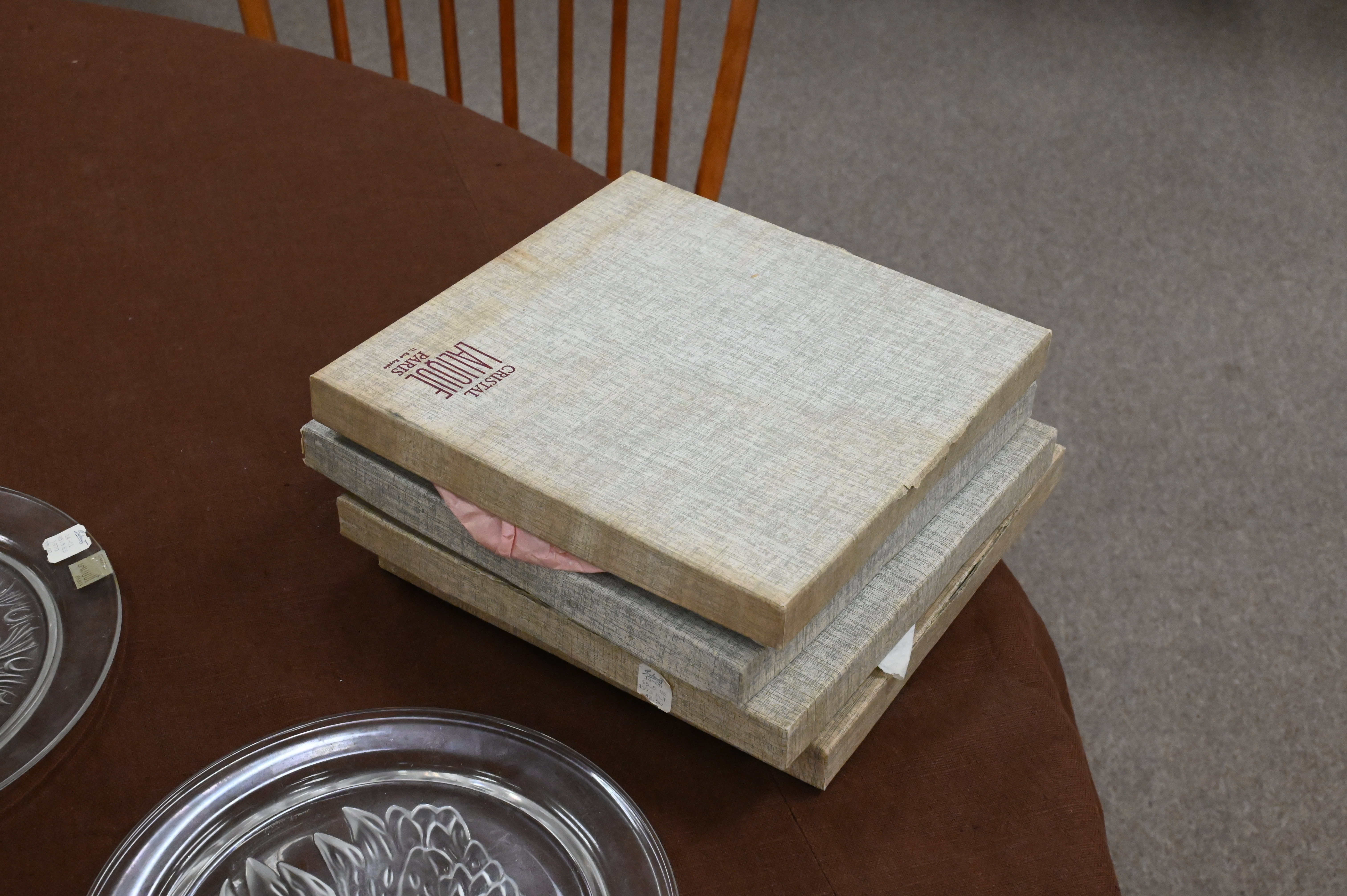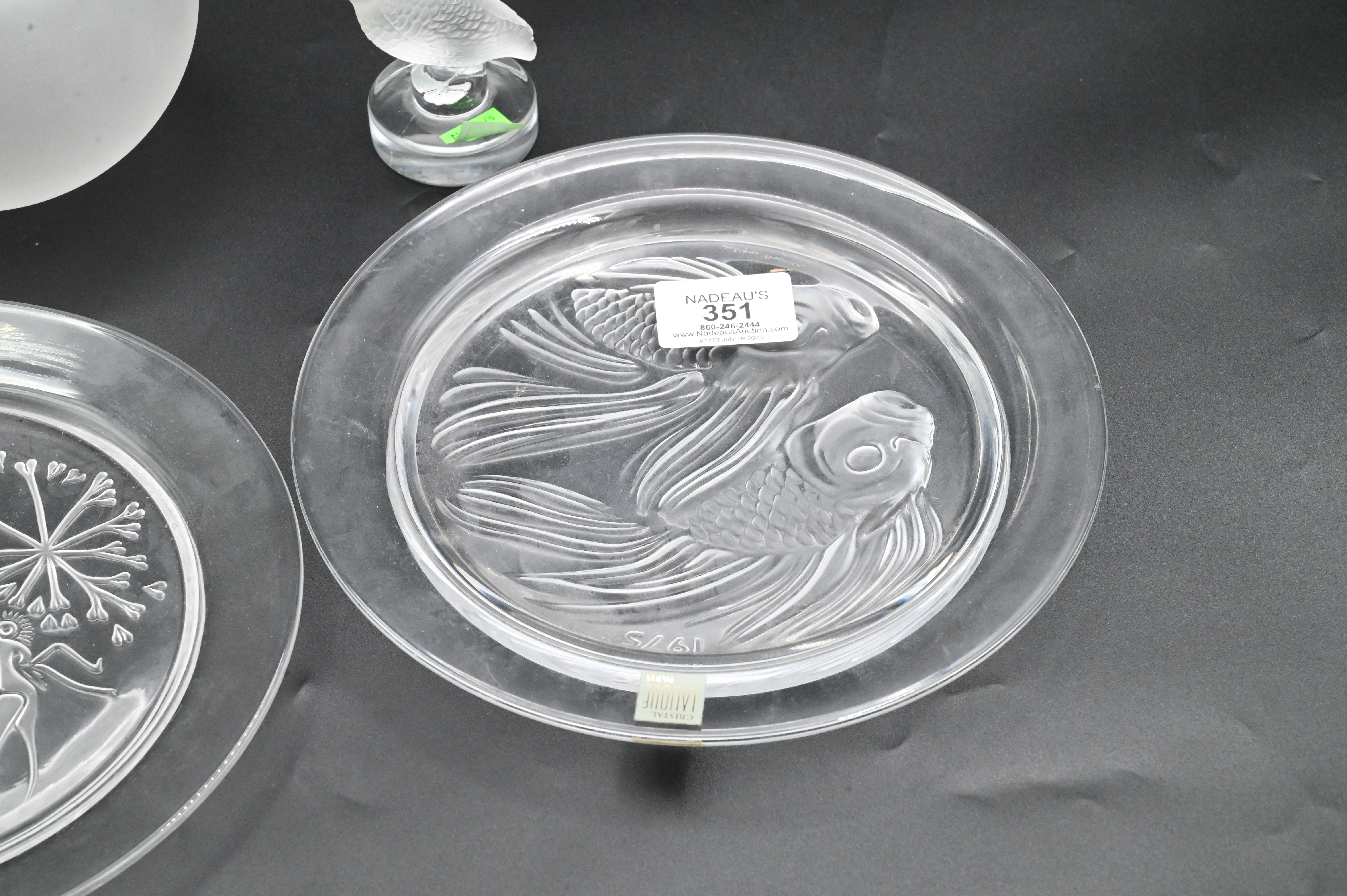 eleven etched crystal annual plates, 1968-1975, having gazelle, bird, butterfly, fish, peacock, owl and shell designs (with original boxes) along with a small quail paperweight and “Grande Pomme” large apple perfume decanter with leaf stopper, each signed in script Lalique France