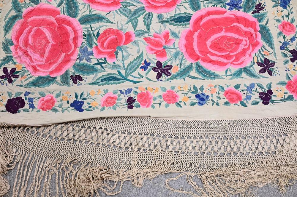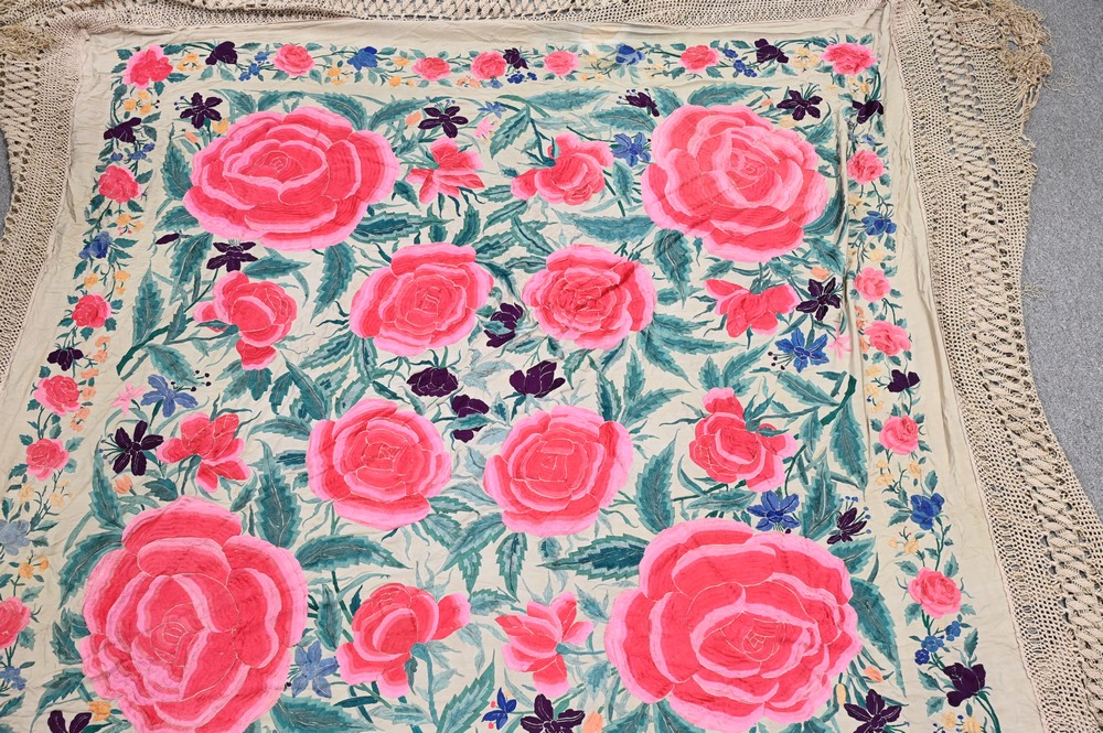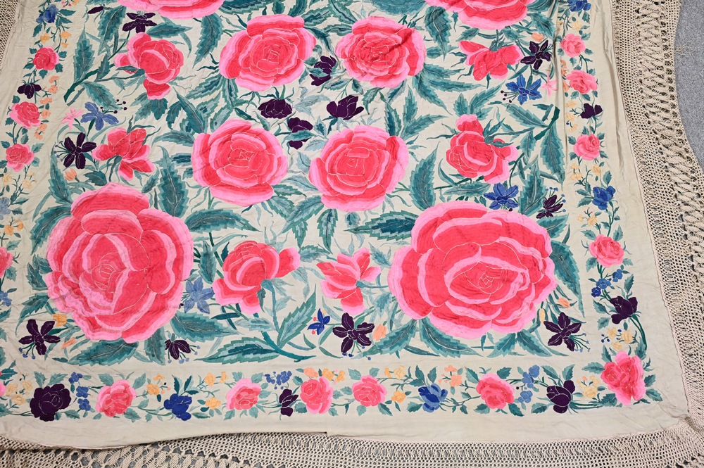 Chinese Silk Embroidered Piano Shawl, approximately 6′ 5″ x 6′ 7″.