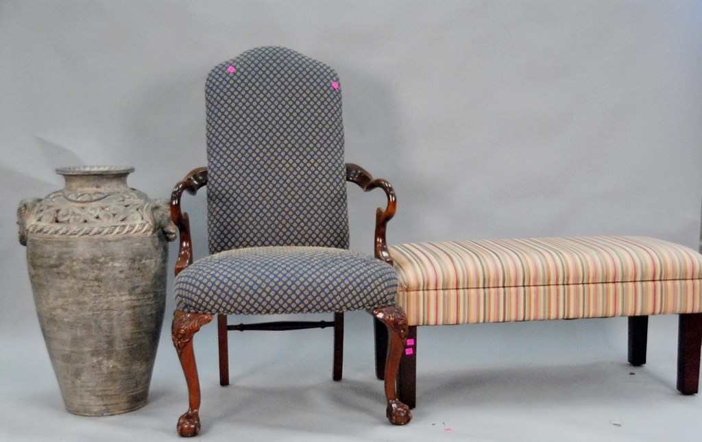 Lot 351: Chippendale style upholstered armchair with ball and claw feet, upholstered top bench, and large urn.