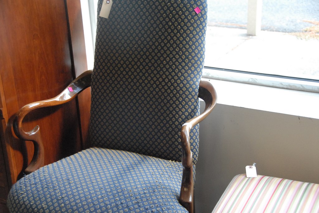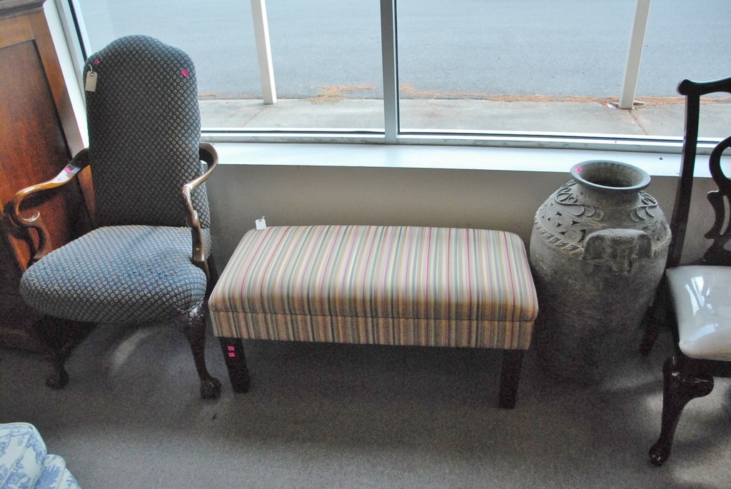 Chippendale style upholstered armchair with ball and claw feet, upholstered top bench, and large urn.