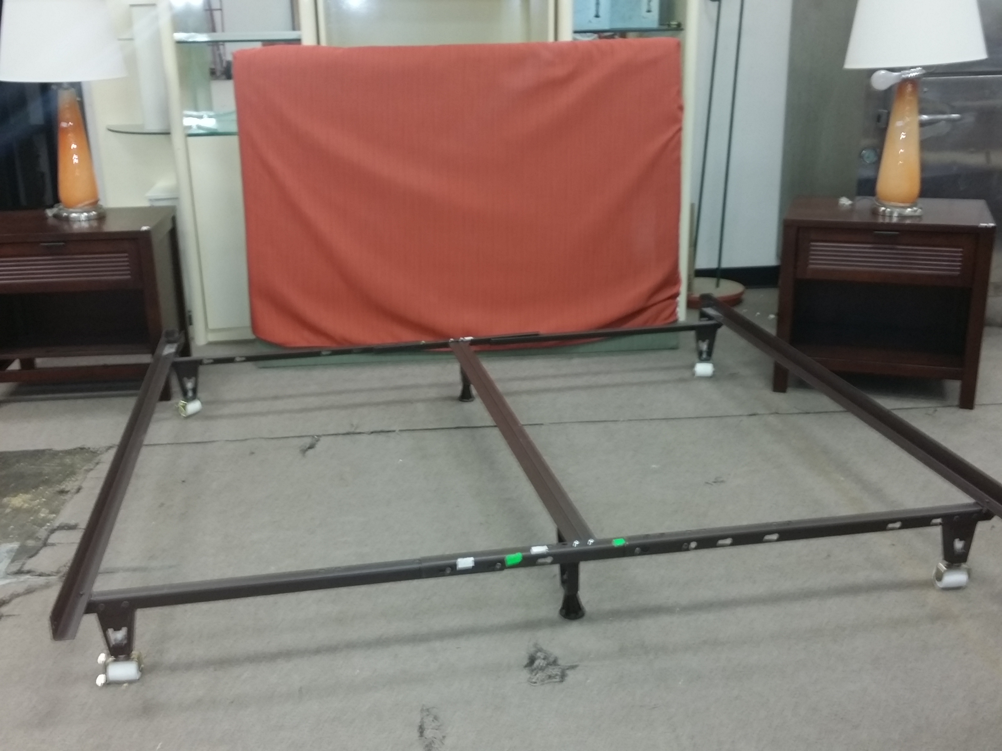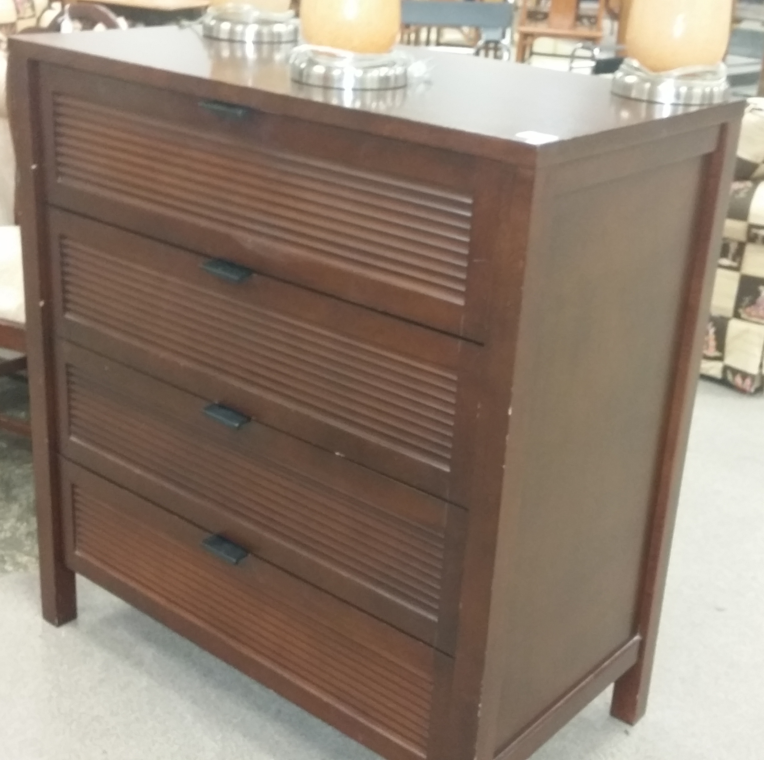Four piece Crate & Barrel bedroom set including tall chest, two night stands, and headboard with frame.