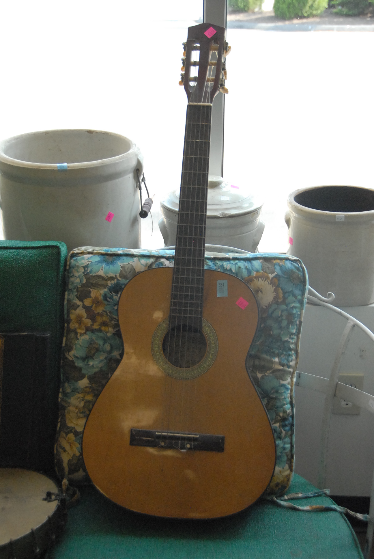 Lot 351: Group of instruments to include Castilla guitar, Antonio Stradivari violin, banjo, and small harp.