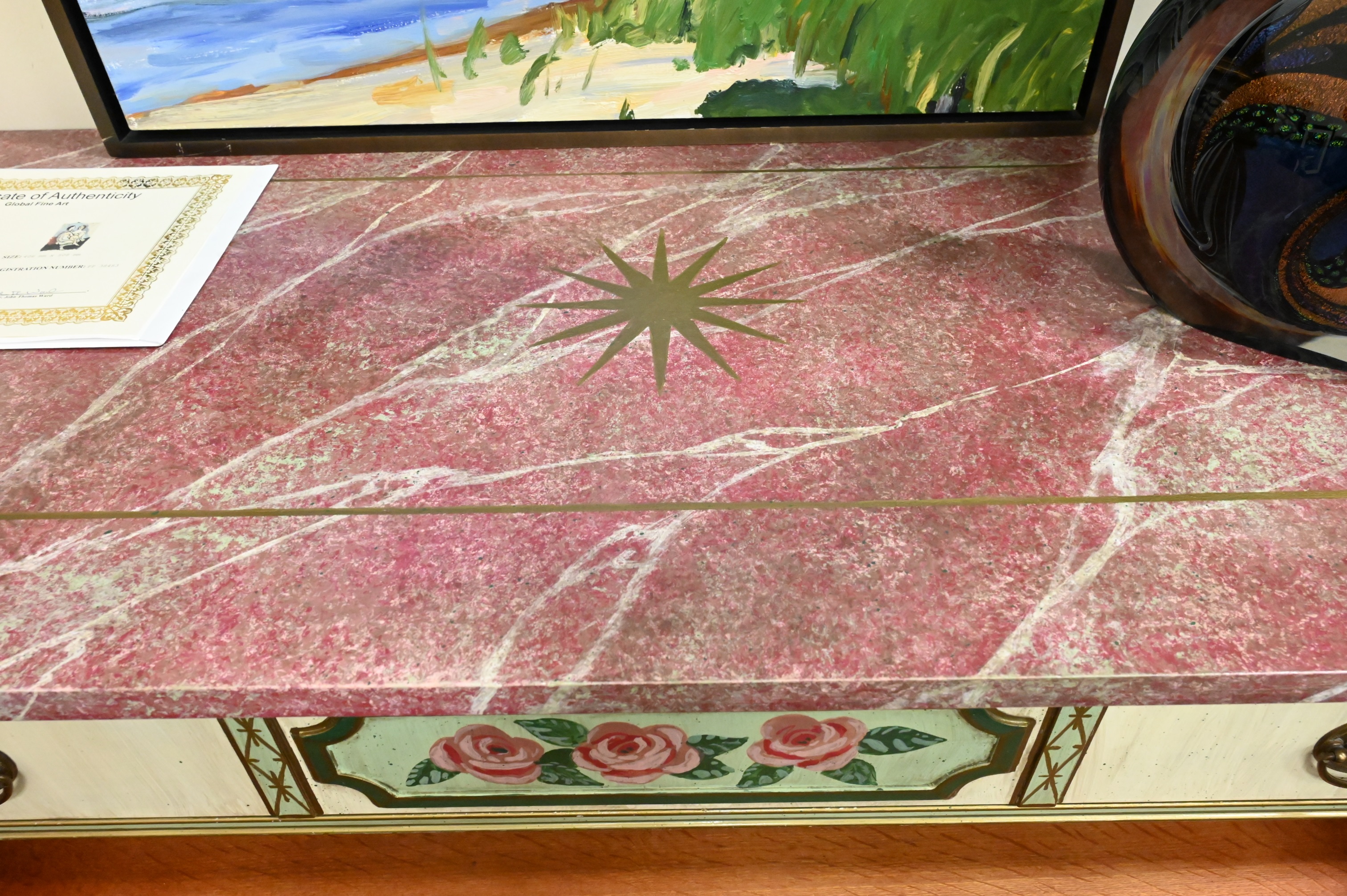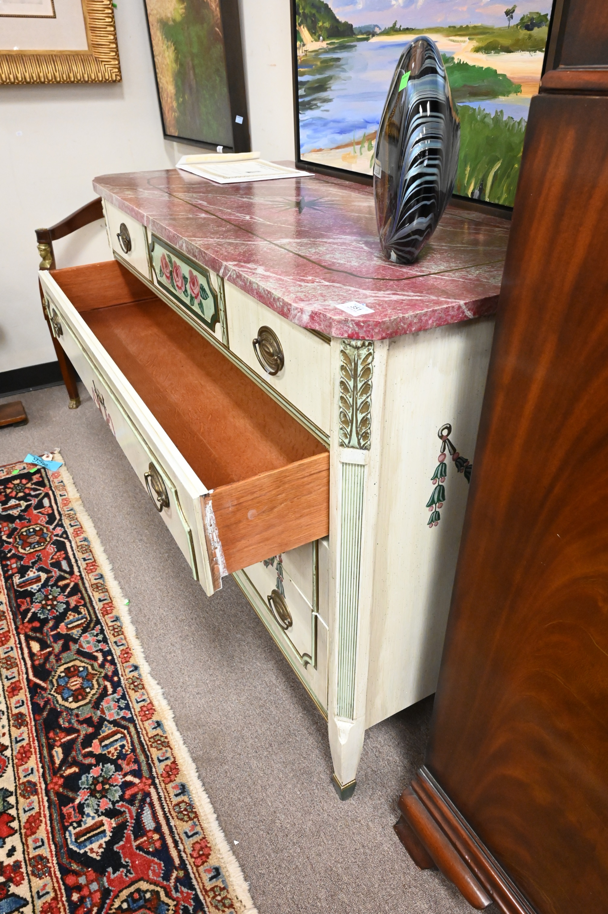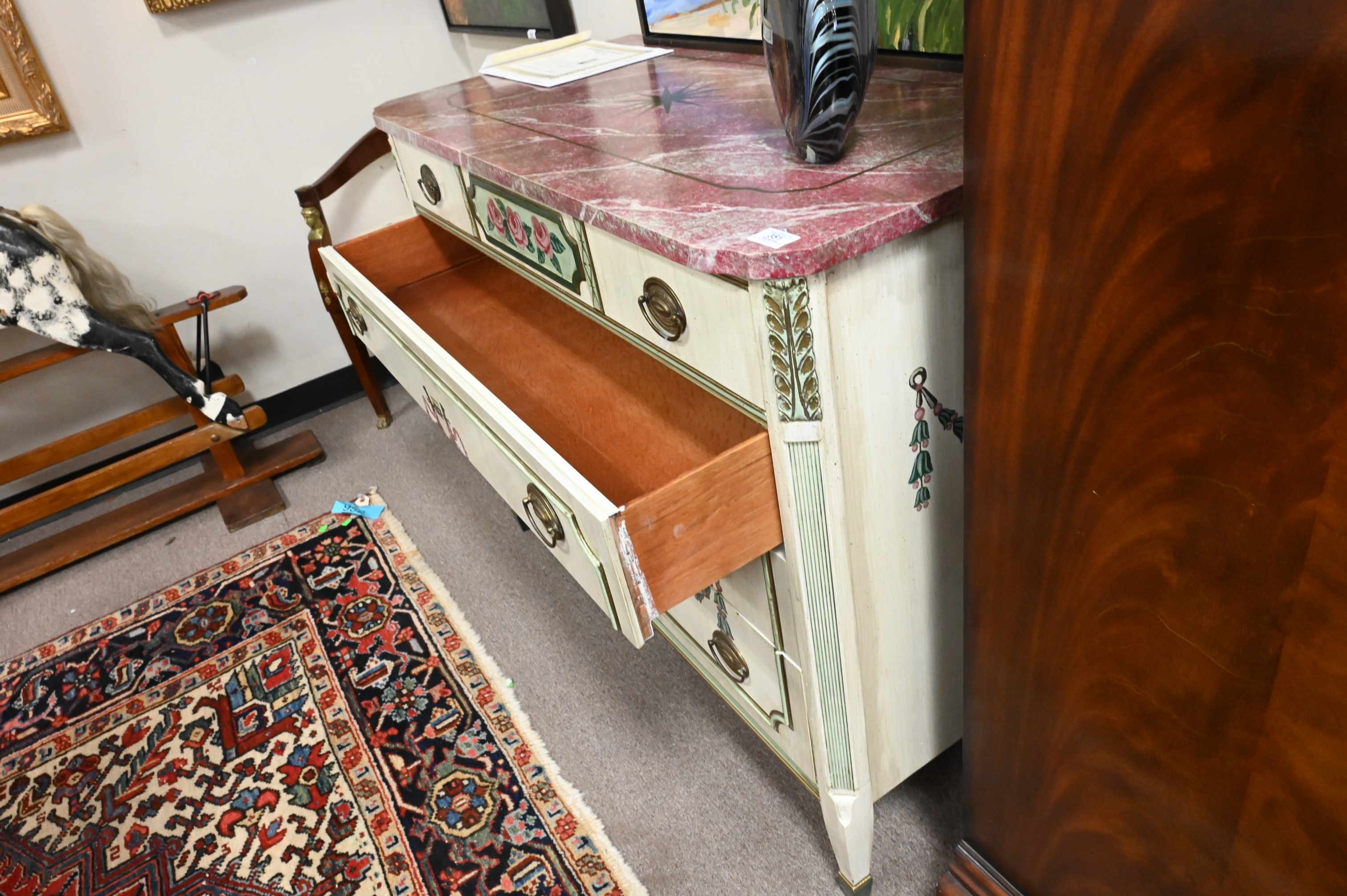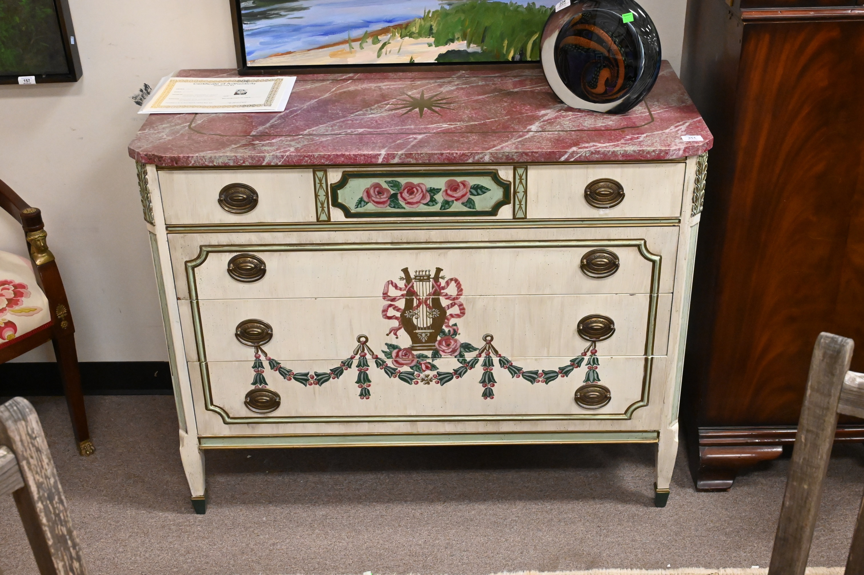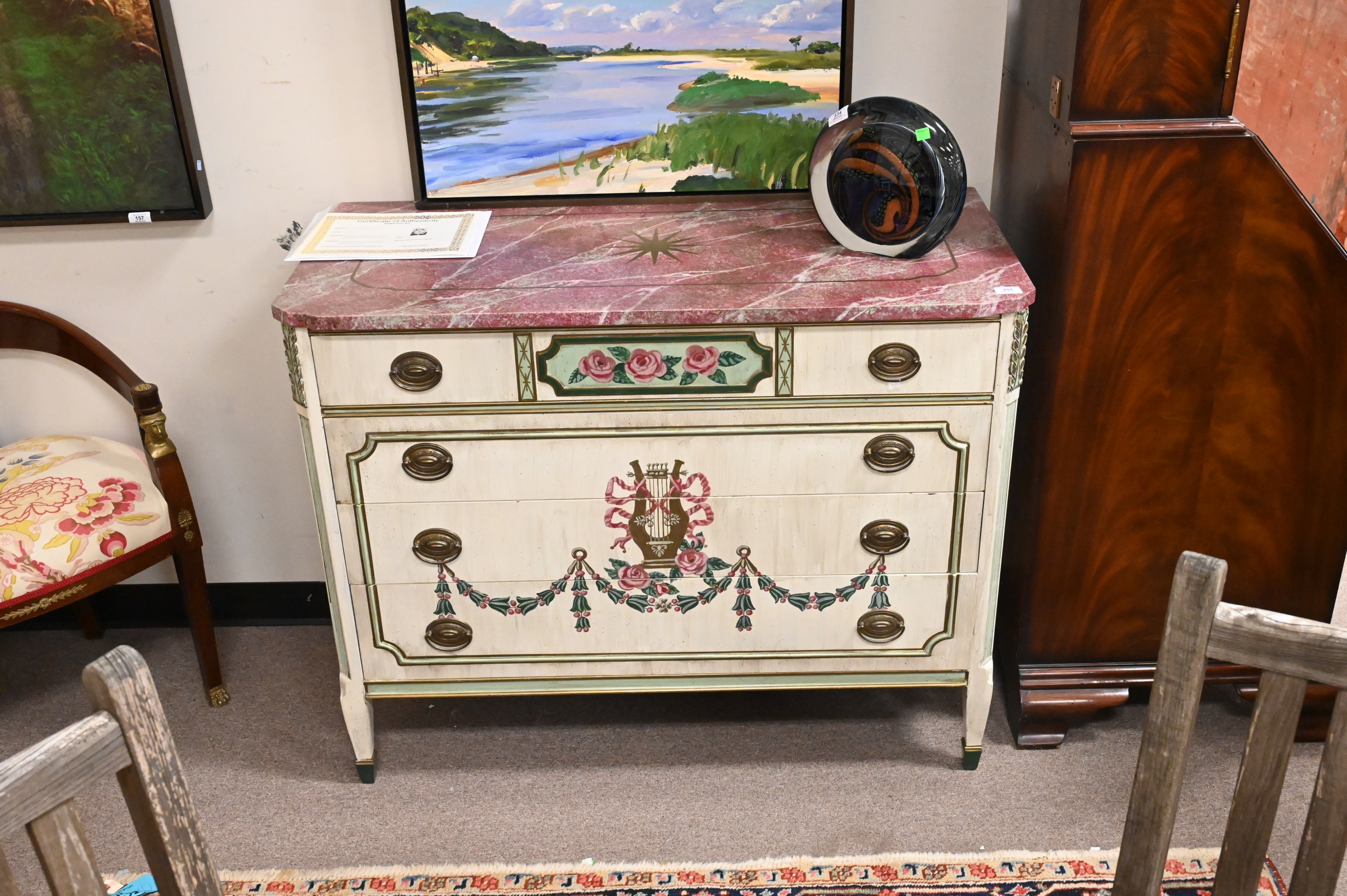 Hand Painted Four Drawer Chest, having faux marble top, height 35 3/4 inches, width 44 1/2 inches, depth 21 inches.