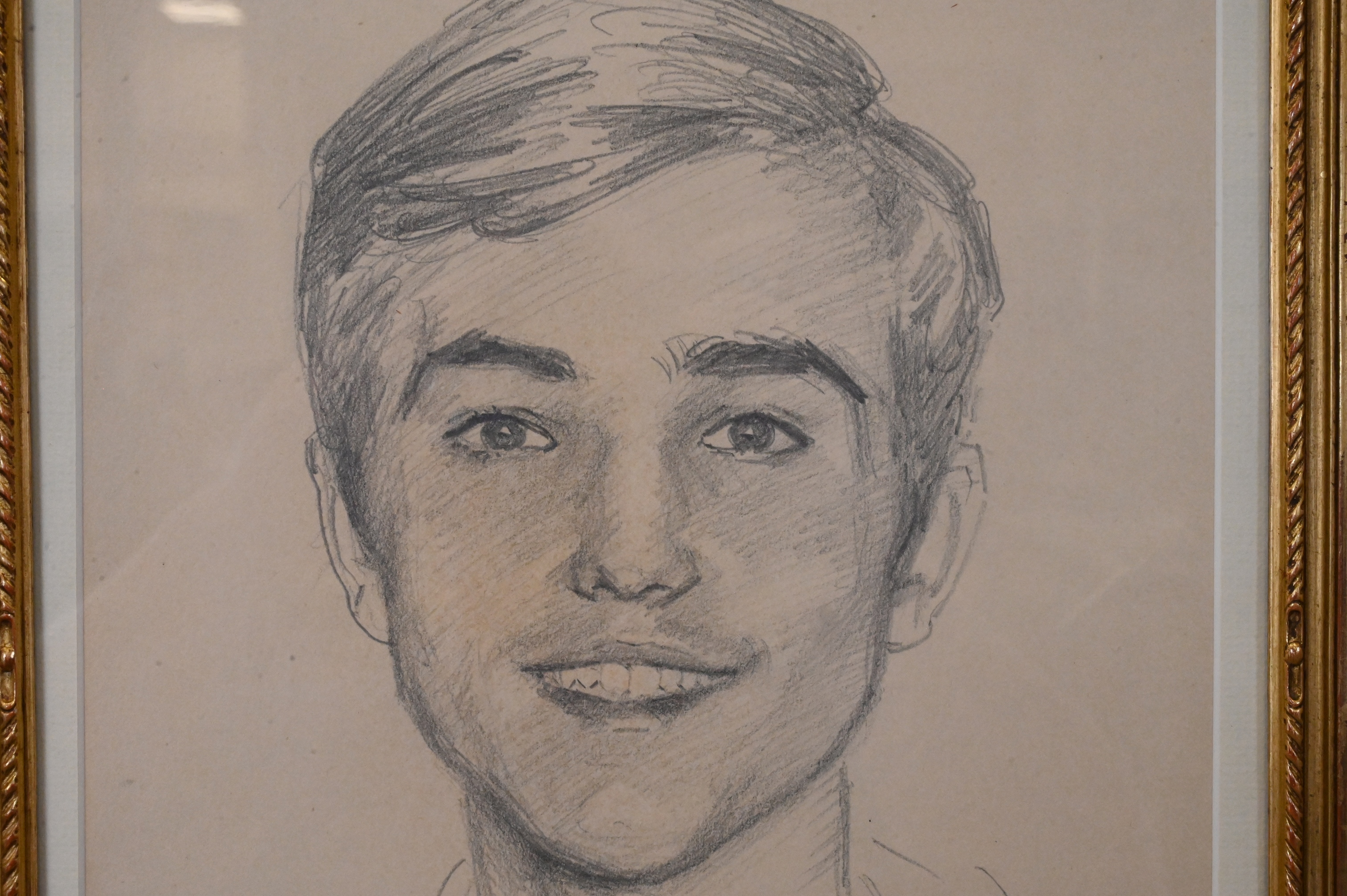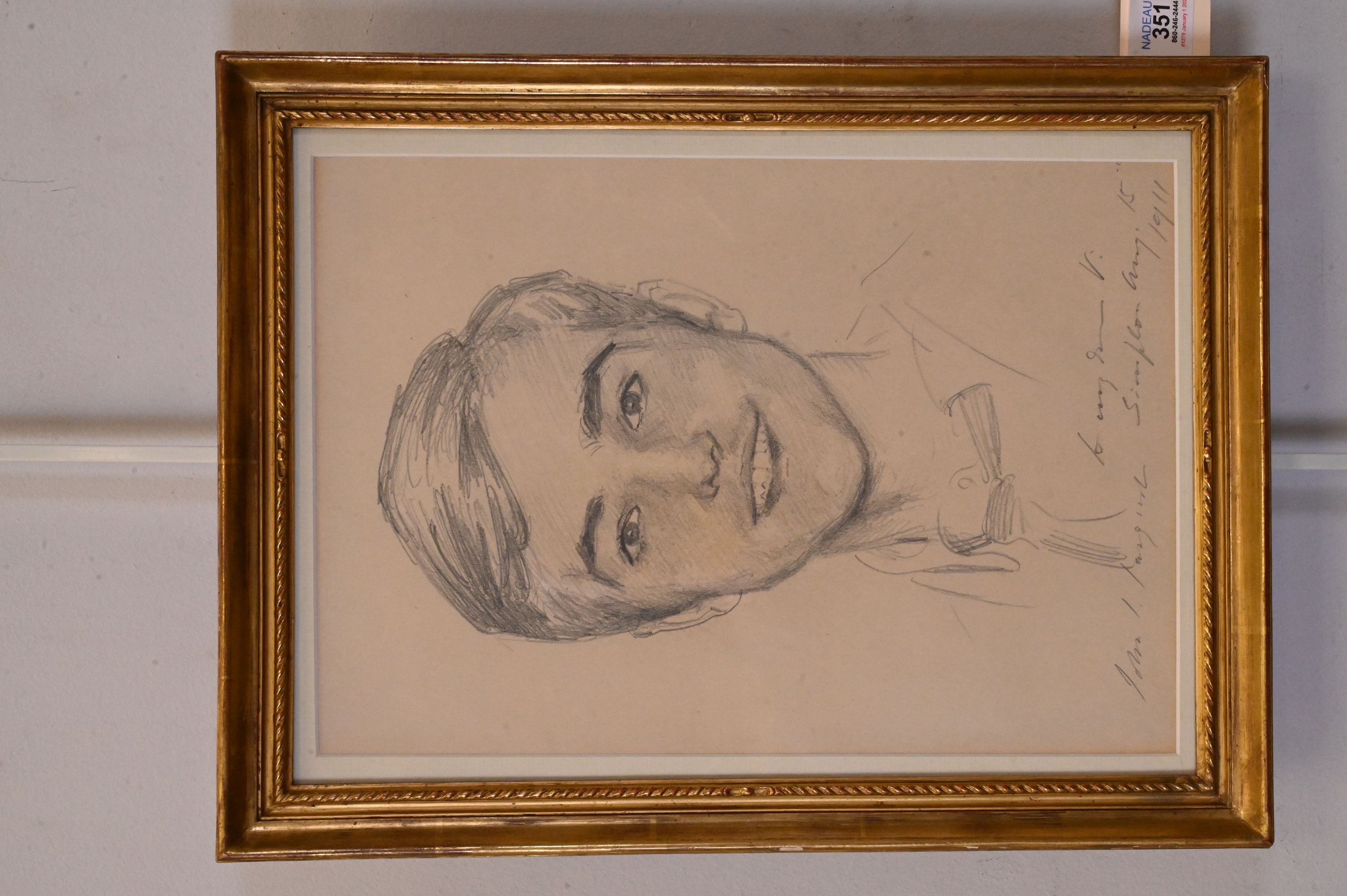 Finely rendered pencil portrait of a young man, sensitively drawn with Sargent’s characteristic economy of line and subtle tonal modeling, the sitter, identified in estate notes as Jean Louis, is shown smiling in a three-quarter frontal pose, wearing a loosely knotted bow tie; the drawing bears a dated inscription along the lower edge and displays the assured draftsmanship associated with Sargent’s late works