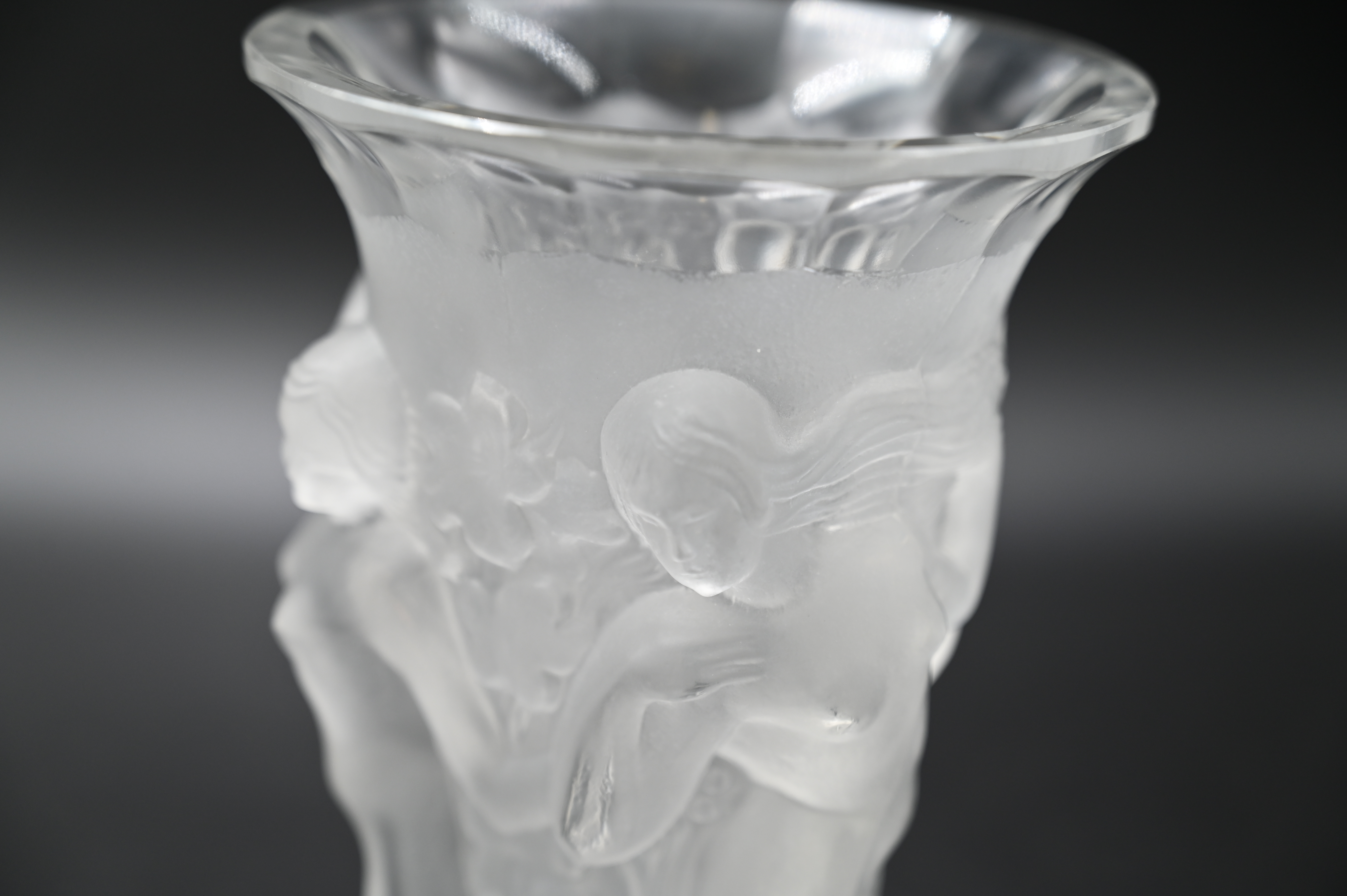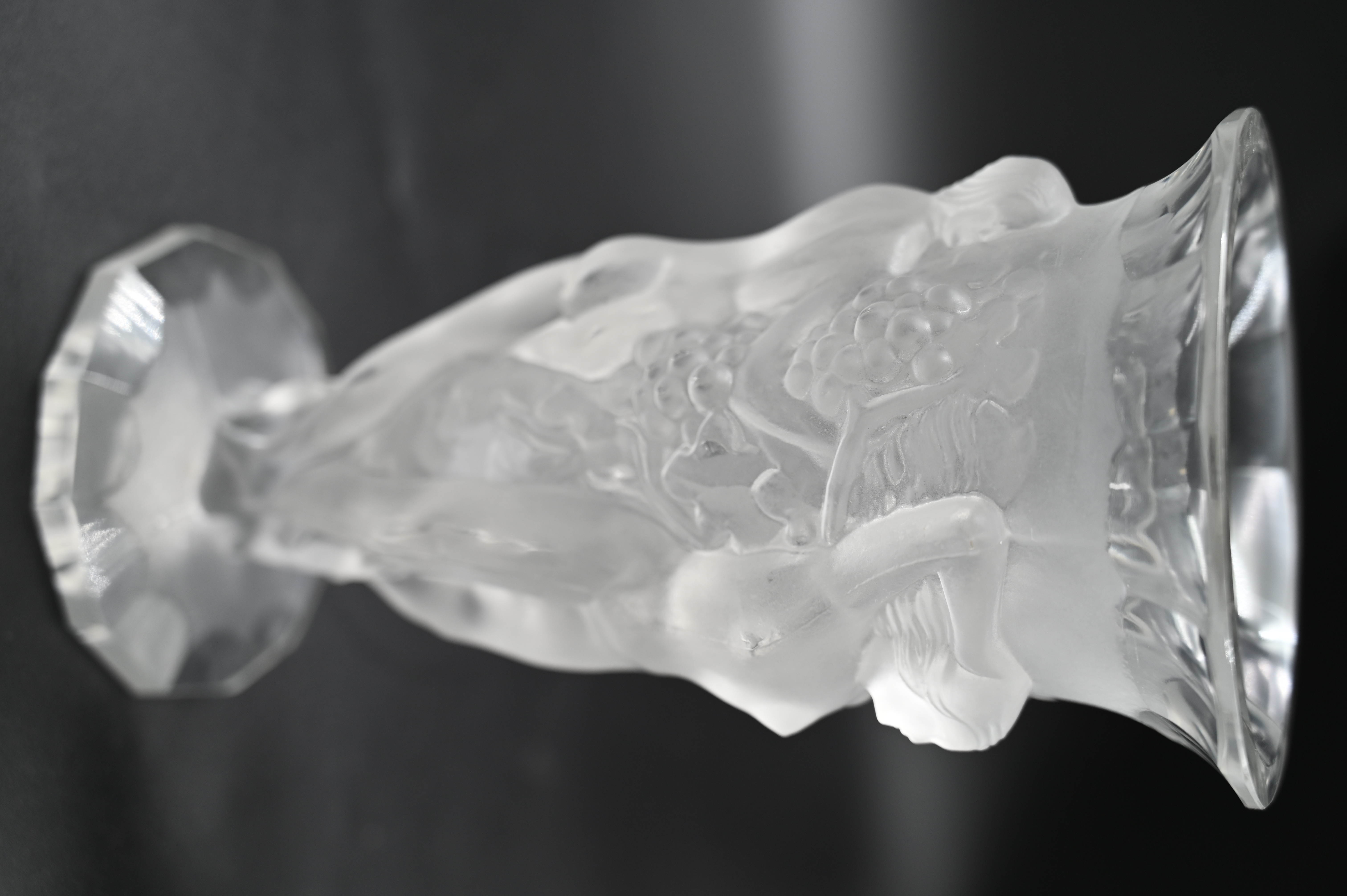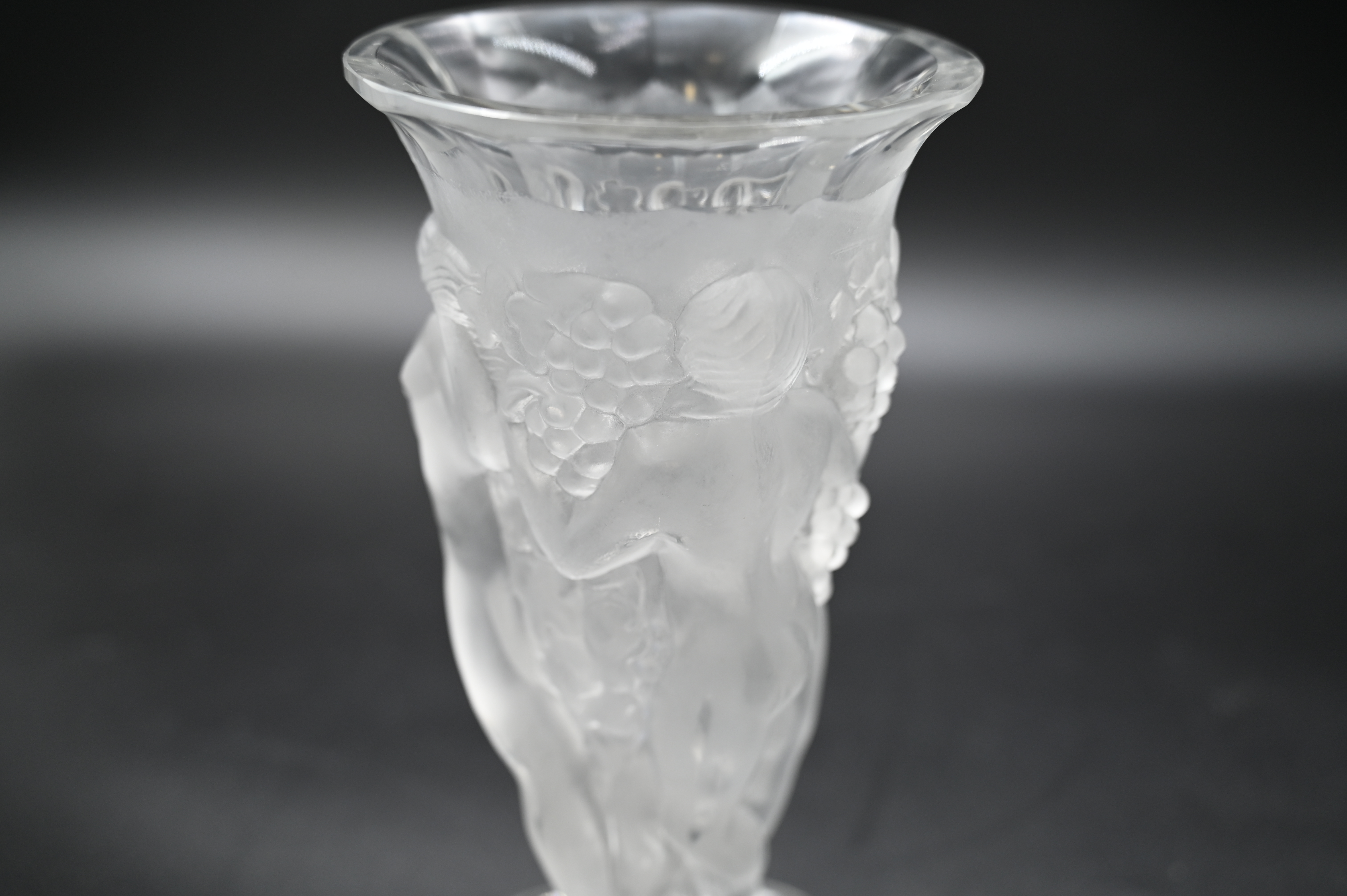 footed vase depicting three nude women (Bacchantes) and grape bunches of tapering form, etched signature Lalique France