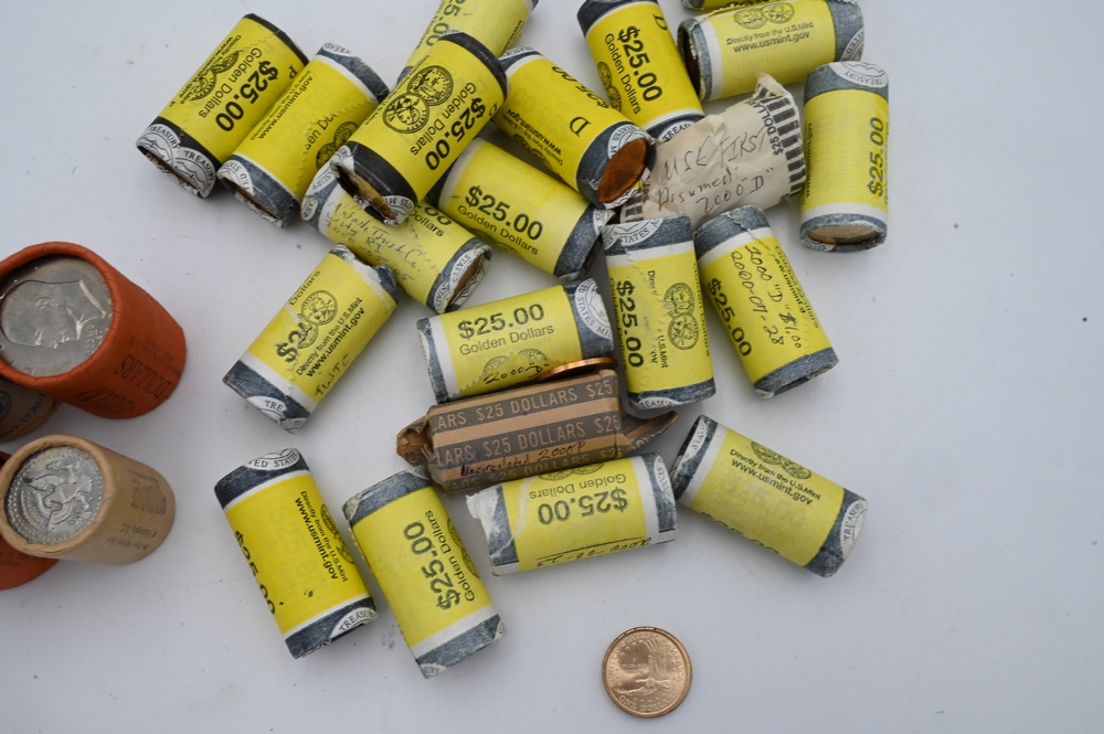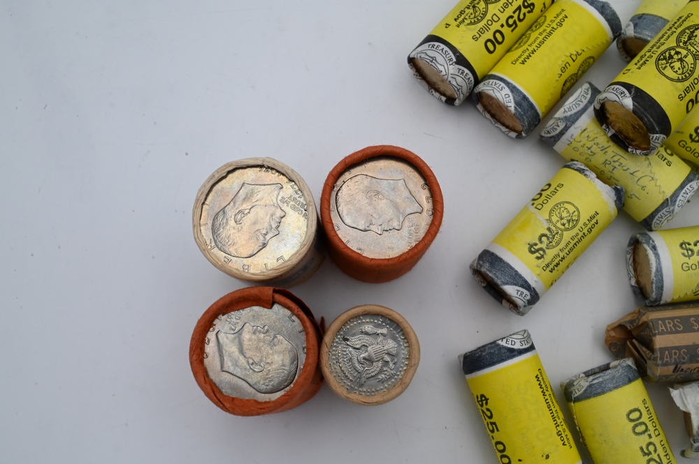 Large Lot of Coins, to include 22 uncirculated rolls of Sacagawea $1 coins, $550 face value; 3 rolls of Ike dollars; along with 1 roll of Kennedy 1974; total face value $620.