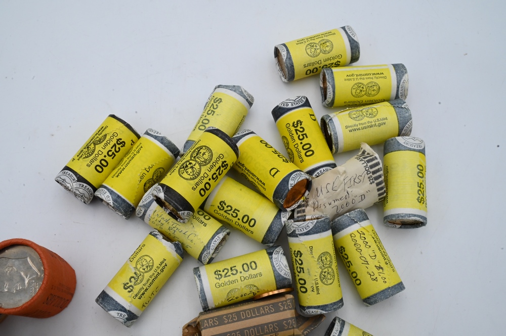 Lot 351: Large Lot of Coins, to include 22 uncirculated rolls of Sacagawea $1 coins, $550 face value; 3 rolls of Ike dollars; along with 1 ro…
