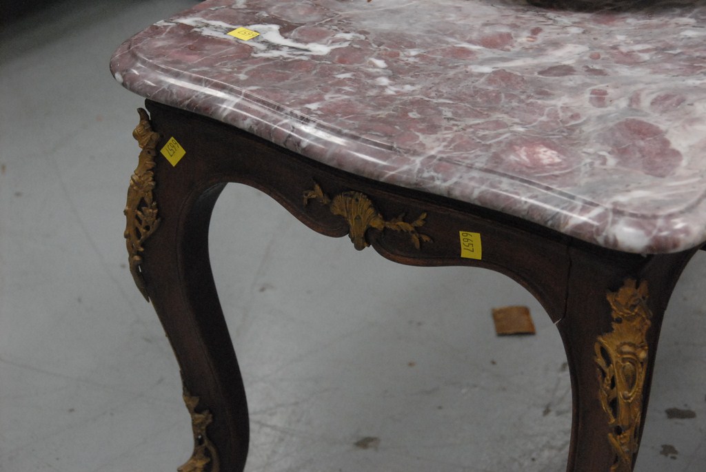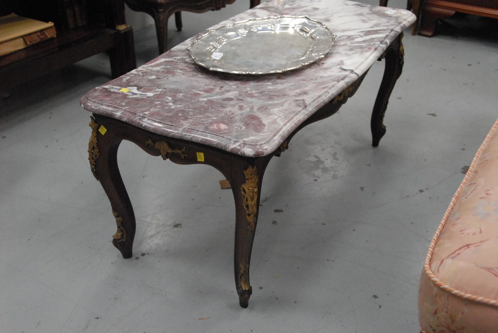 Lot 351: Louis XV style coffee table with shaped marble top, marble of lavender, white, and black all on cabriole legs with brass mounts. ht….
