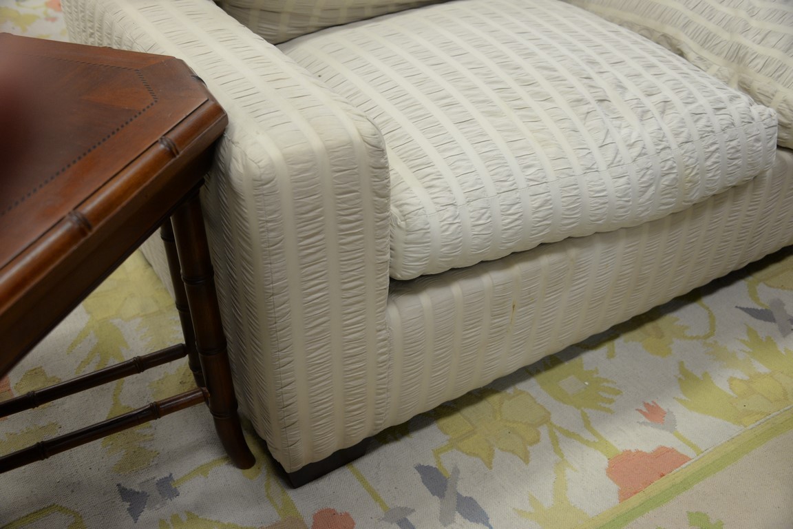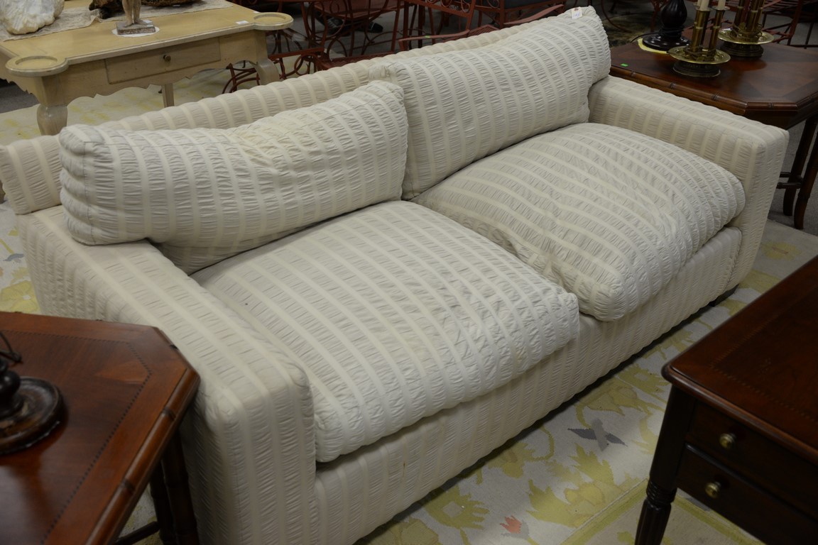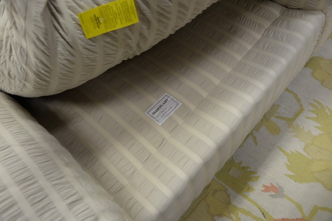 Lot 351: Mason-Art custom linen upholstered loveseat having down filled cushions, marked Mason-Art New York Custom Made. lg. 77in.