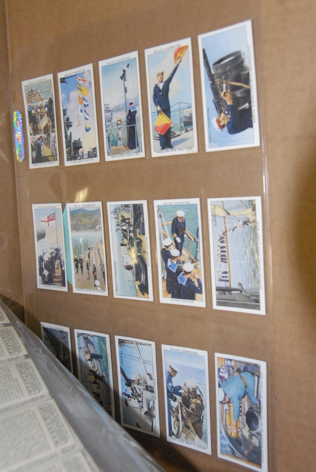 Nine sheets of cigarette cards to include Life in the Royal Navy, military head dress, and merchant ships of the world