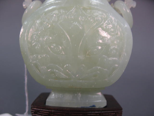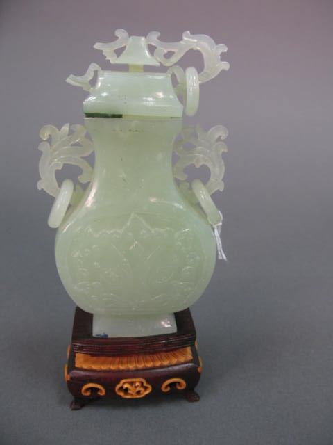 Pair of celadon jade foo-dogs and carved jade vase and cover, pale celadon stone with incised panel in front and back having ring handles and ring handles on cover cover as is with stand.