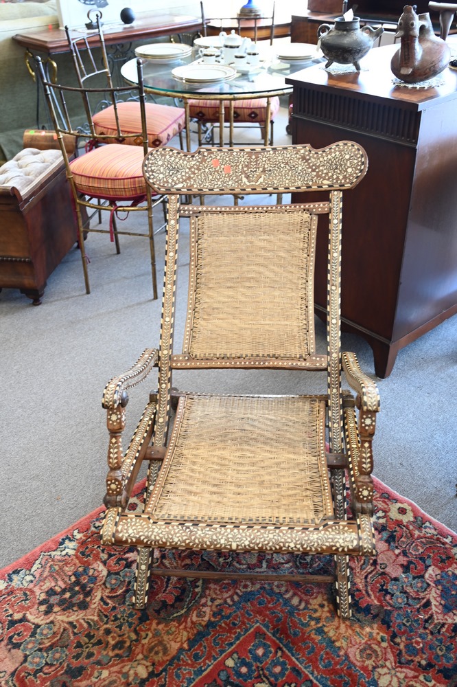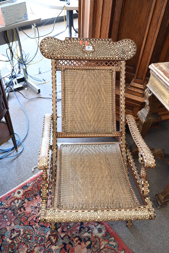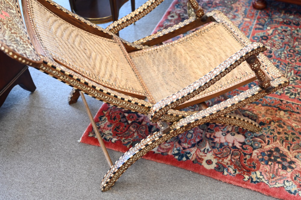 Lot 351: Pair of Moroccan Mother of Pearl Inlaid Folding Chairs, having woven seats and backs, height 32 inches, width 21 inches.