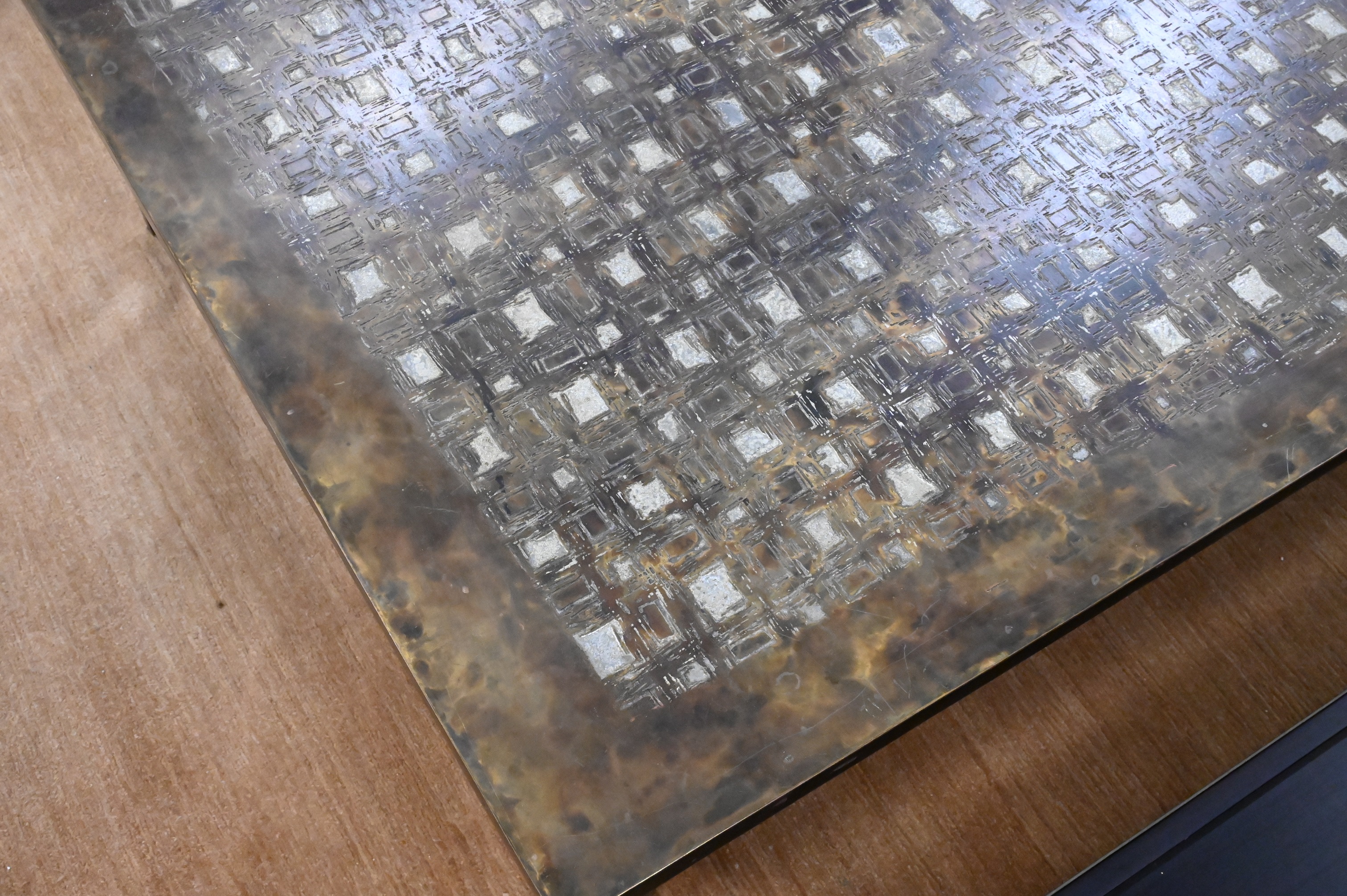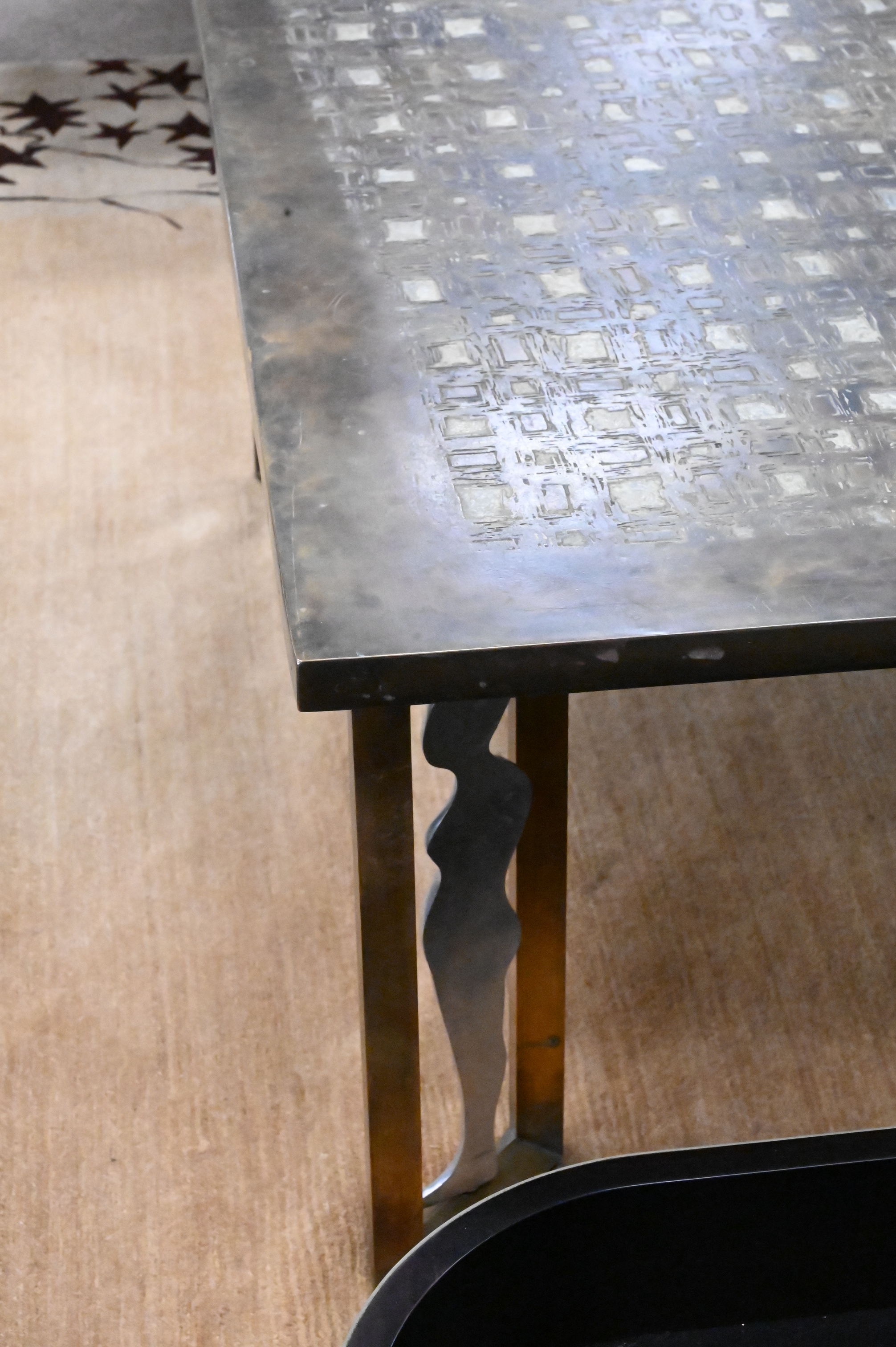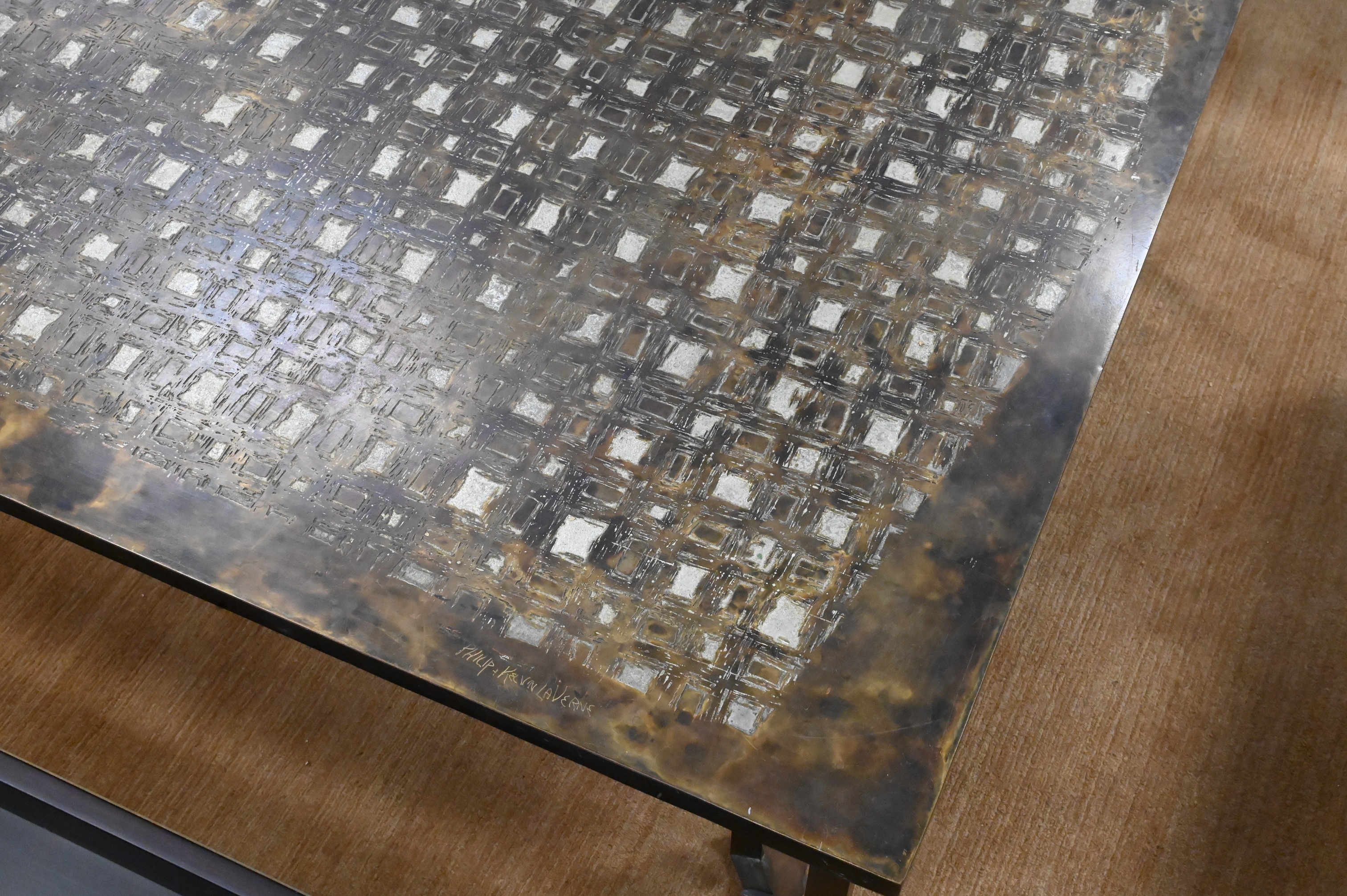 Philip (1908 – 1988) and Kelvin (b. 1936) Laverne “Les Femmes” Coffee Cocktail Table, patinated bronze and pewter, having nude female figural legs, signed Philip and Kelvin Laverne, height 16 1/2 inches, top 35″ x 47″.