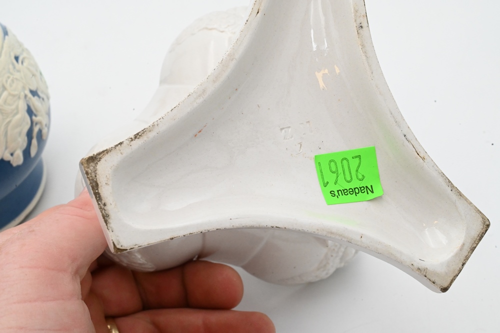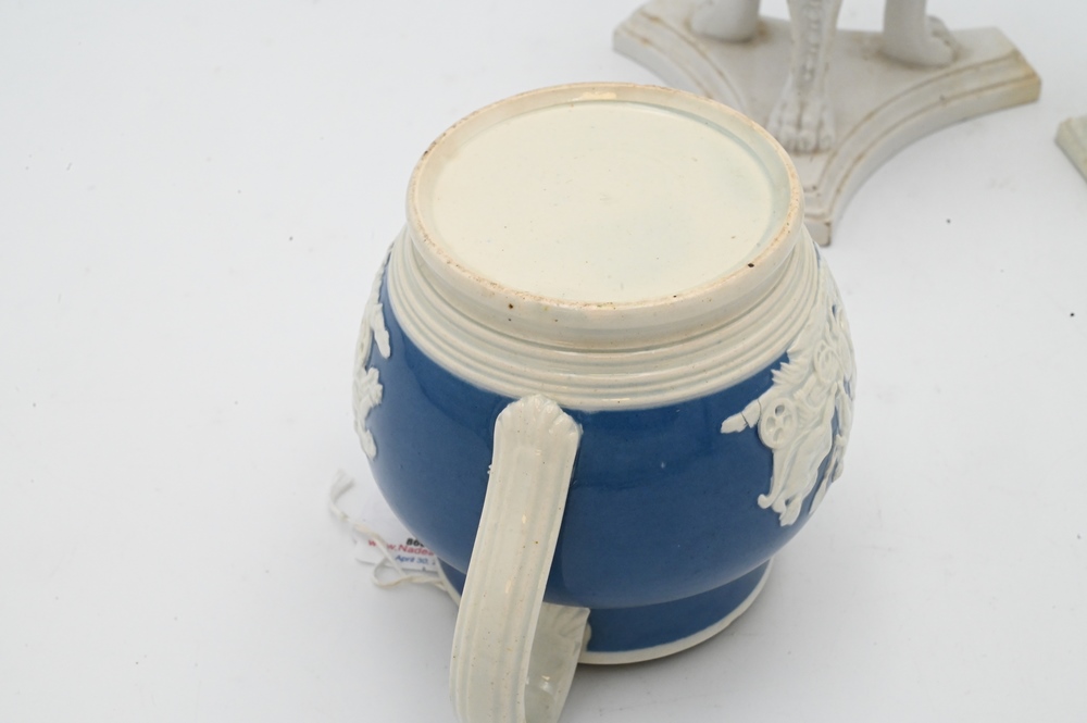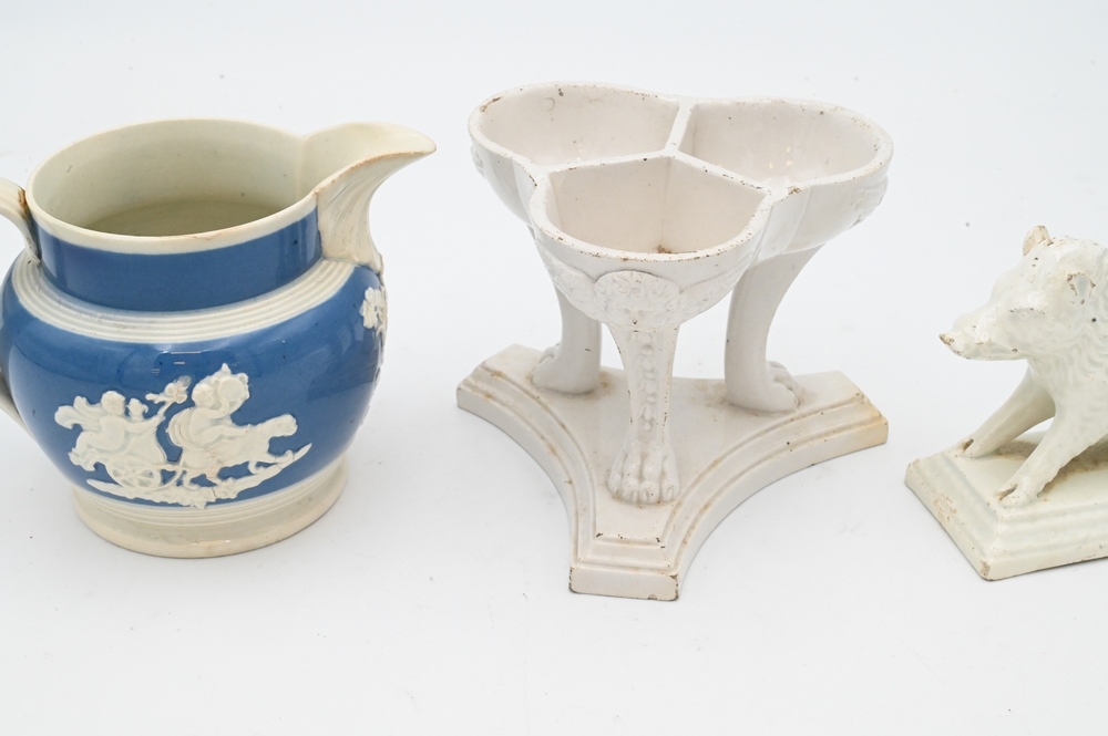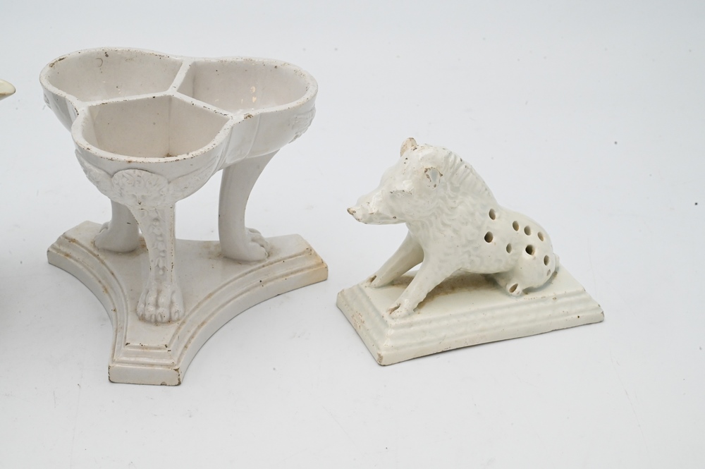 Lot 351: Three Piece Creamware Lot, having boar, three section compote and creamer, (boar ear chipped/creamer with hairline), heights 3 1/4 – 4 inches.