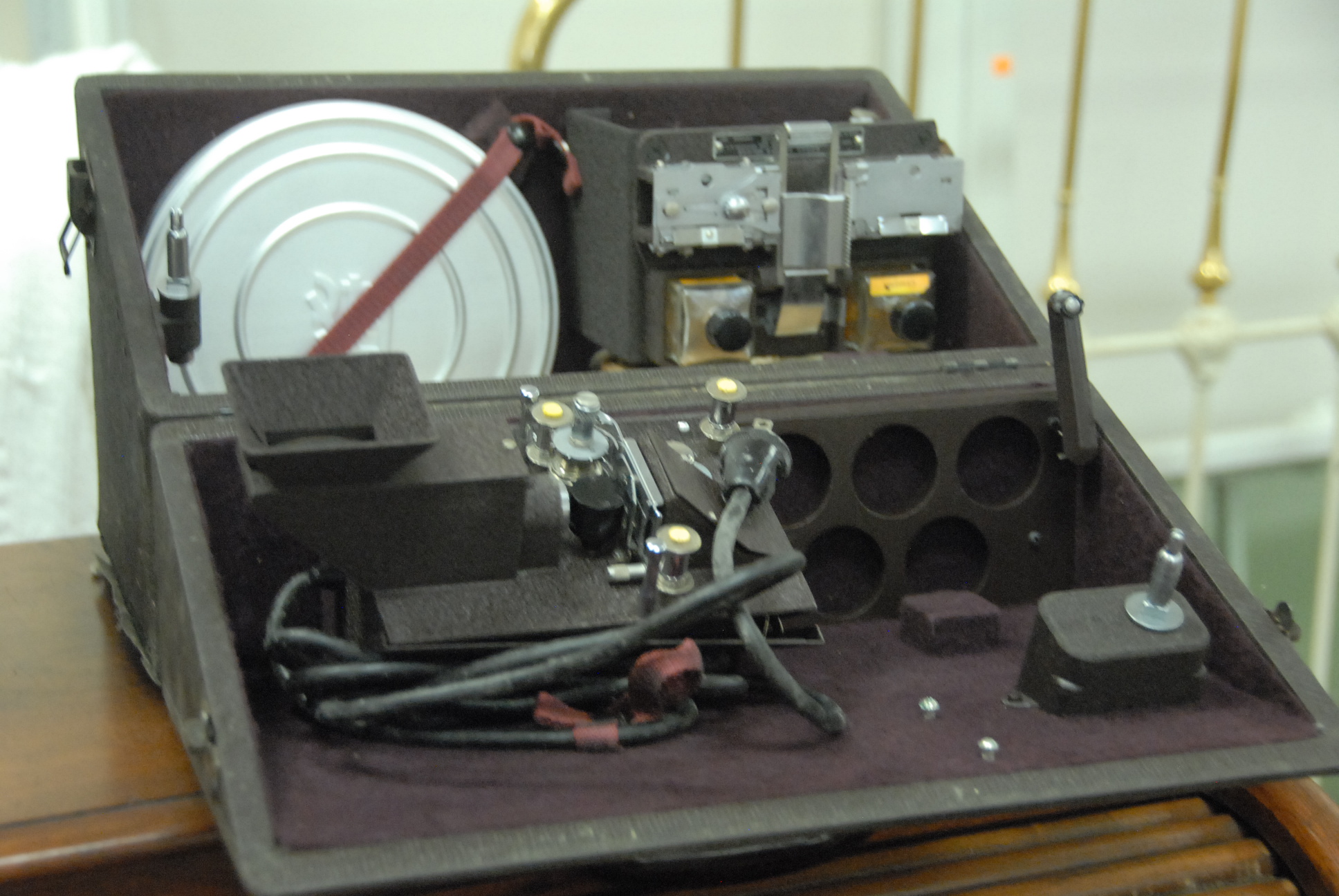 Lot 351: Three piece lot to include brass samovar, Bell Howell Filmo Diplomat projector with parts, and 23CII Beseler Photo Enlarger.