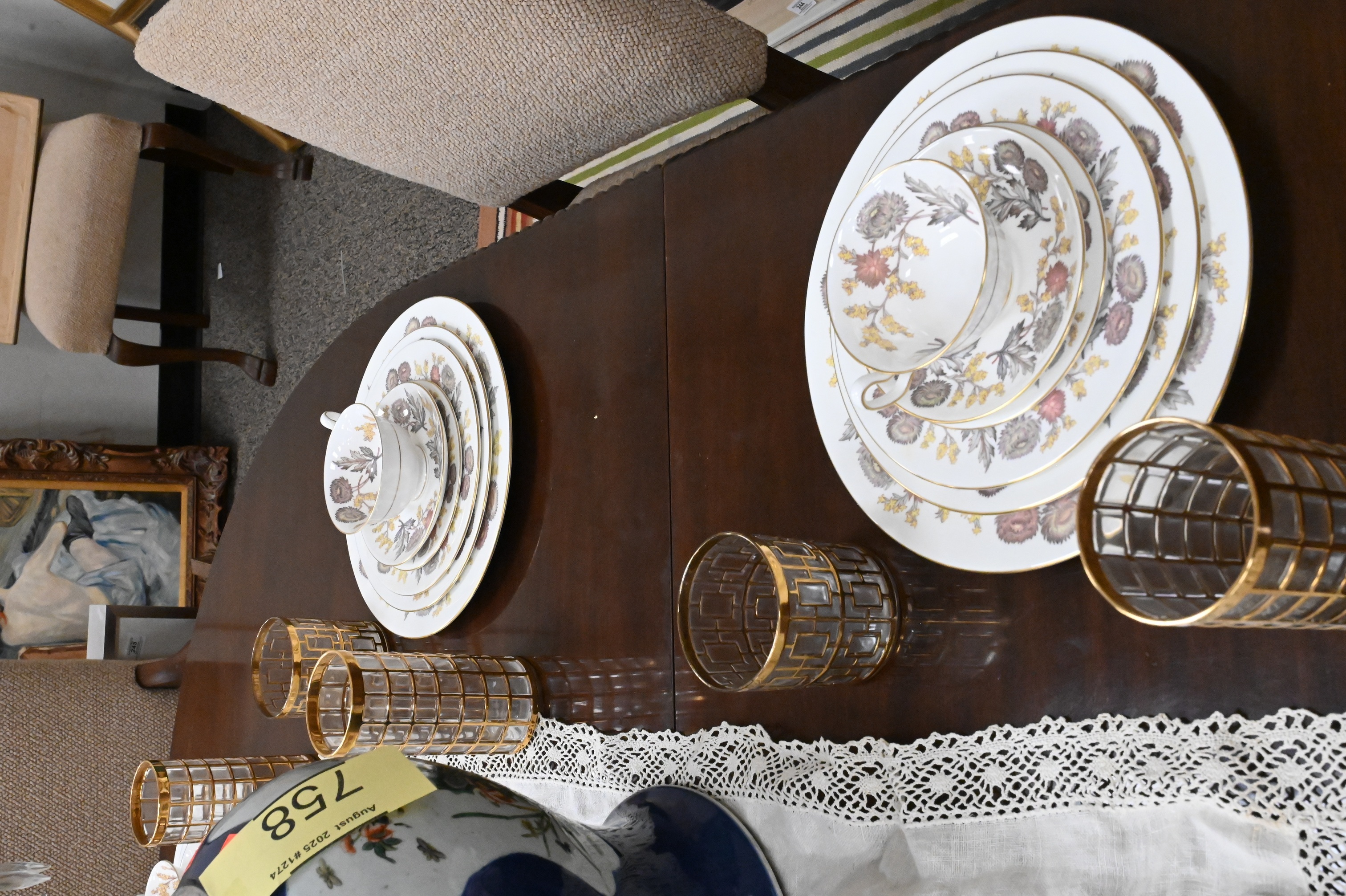 to include 12 dinner plates, 12 luncheon plates, 12 salad plates, 12 bread plates, 12 tea cups, 12 saucers, 1 creamer, and 1 sugar bowl