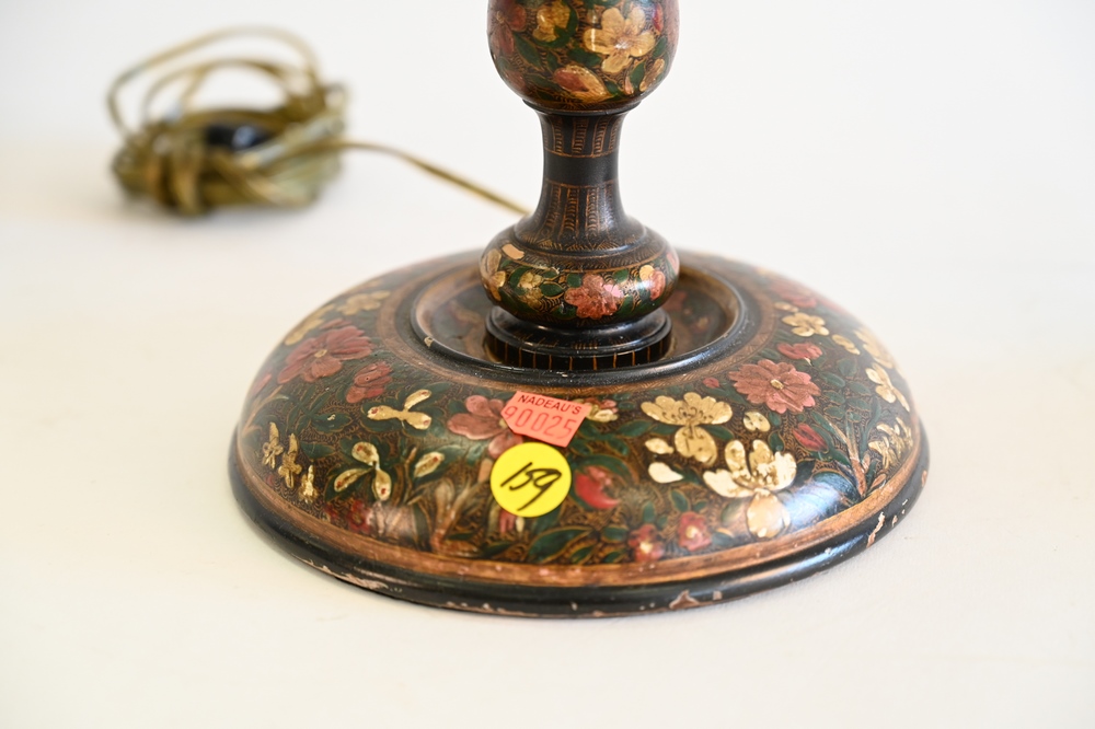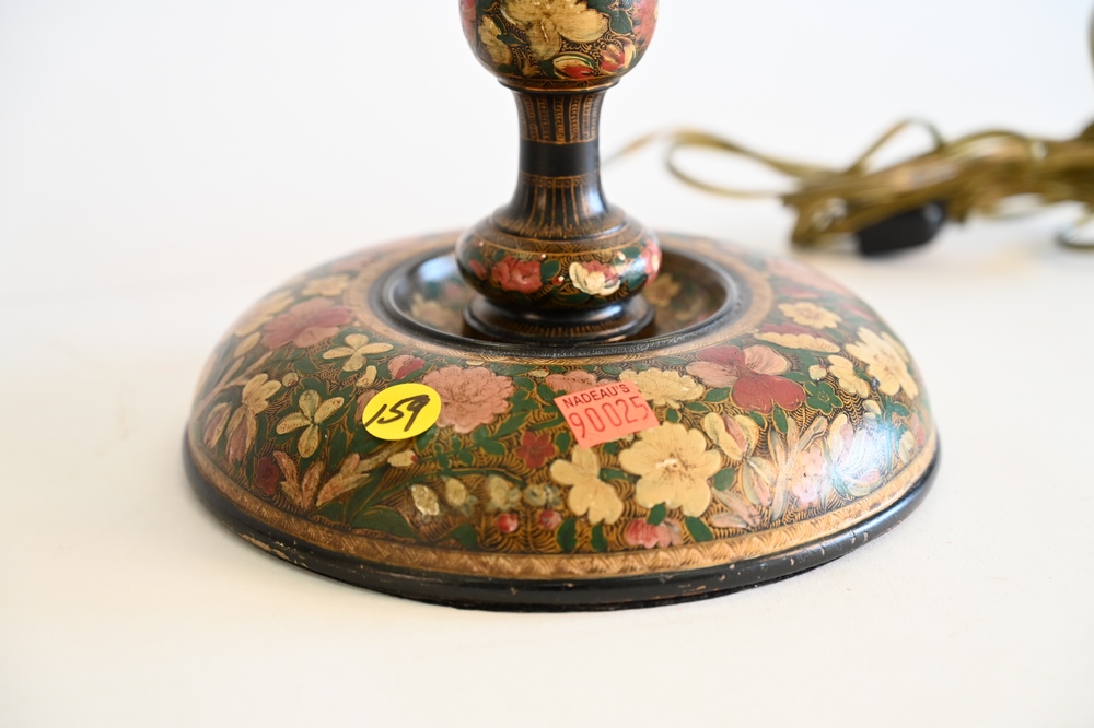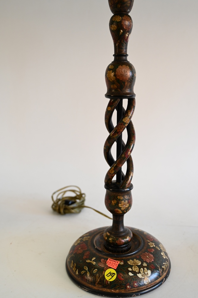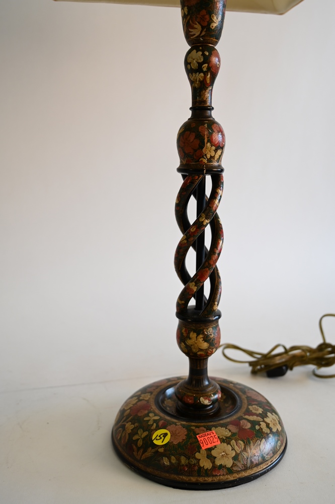 Lot 352: A Pair of Carved Wood Candlestick Lamps, having floral decoupage paint decoration twists, and two lights each, overall height 29 3/4 inches.