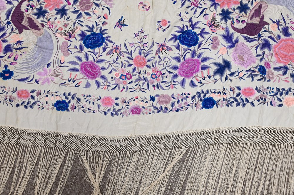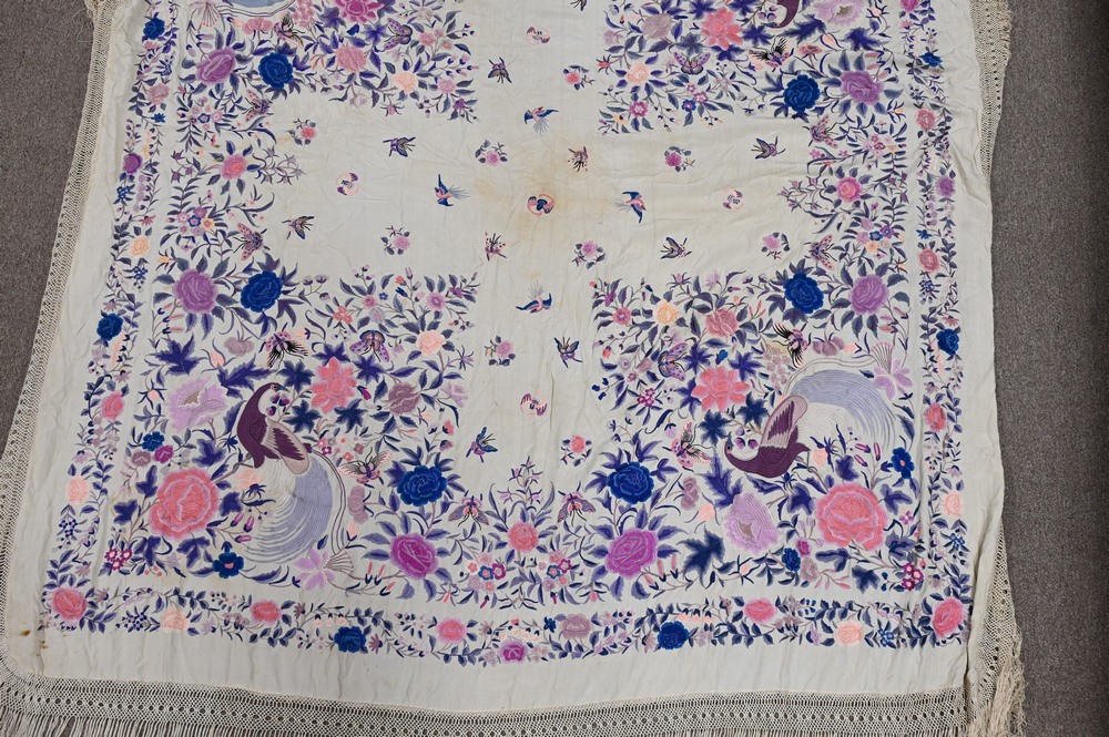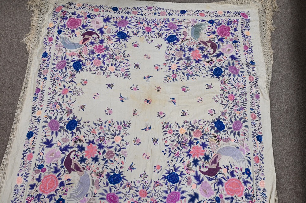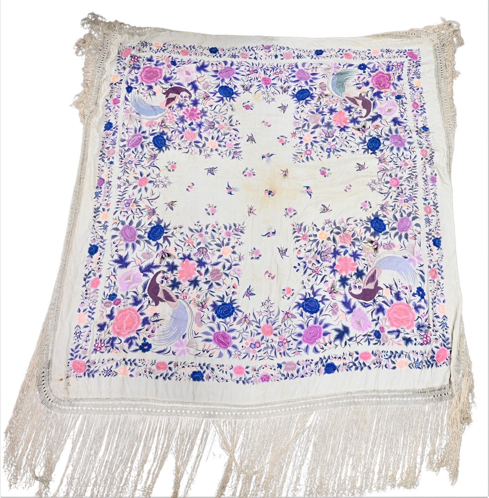 Lot 352: Chinese Silk Embroidered Piano Shawl, having birds, butterflies, and bats, approximately 5′ 2″ x 6′ 3″.