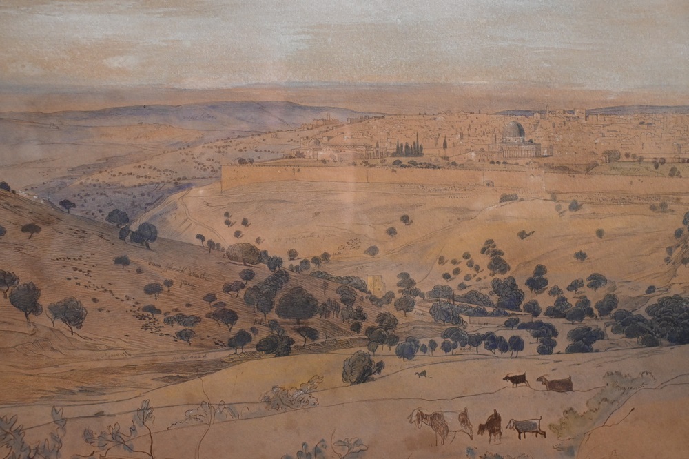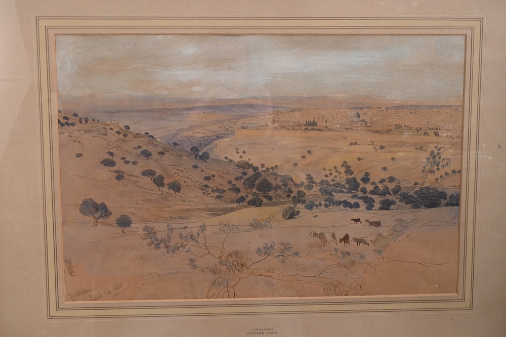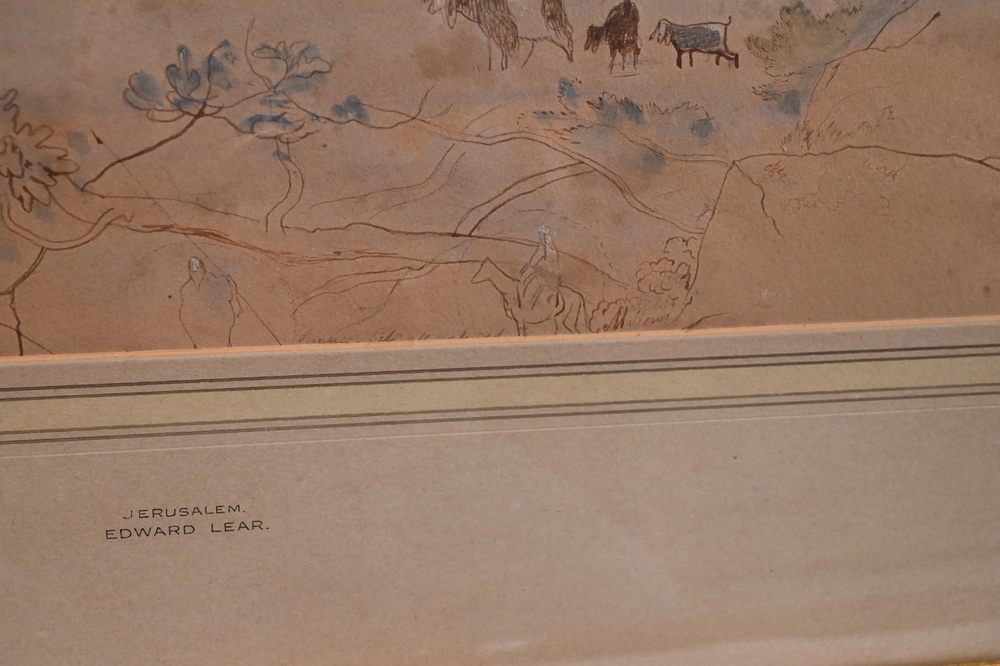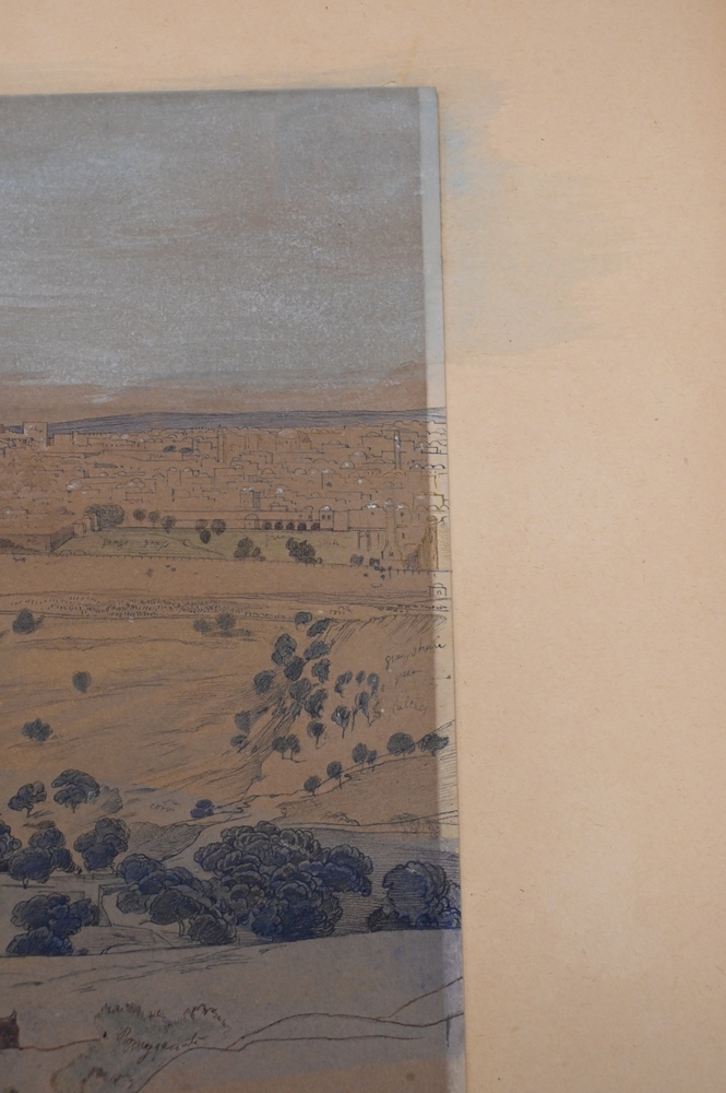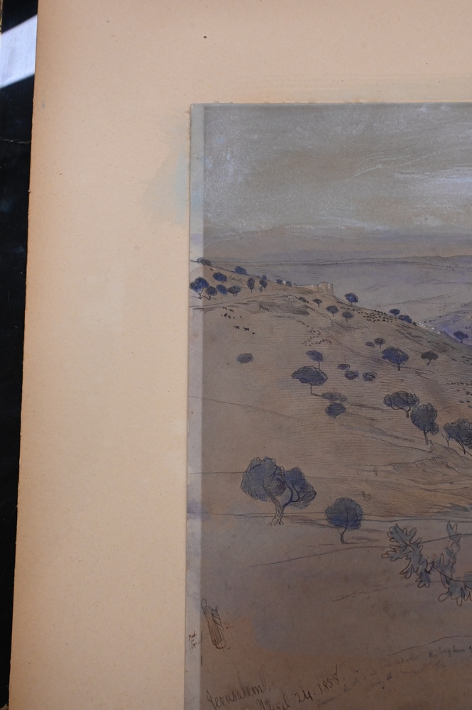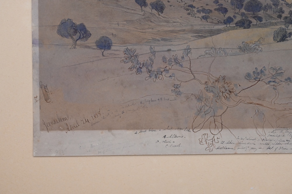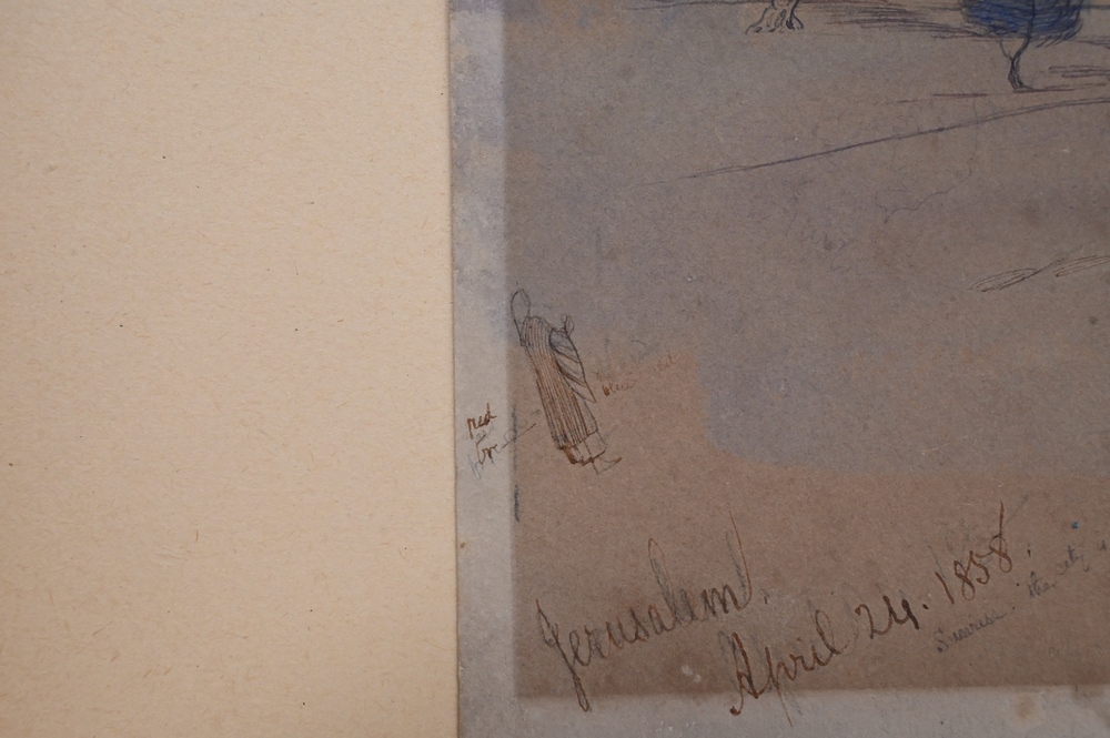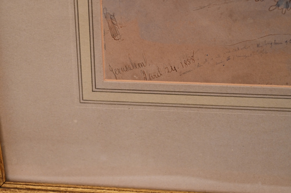 Edward Lear (1812 – 1888), Jerusalem, April 24, 1858, watercolor and pencil on paper, sketch with writing or notes, sight size 13″ x 19 1/2″, sheet size 14 1/8″ x 20 1/8″. Pitt and Scott London, Ltd. label on back.