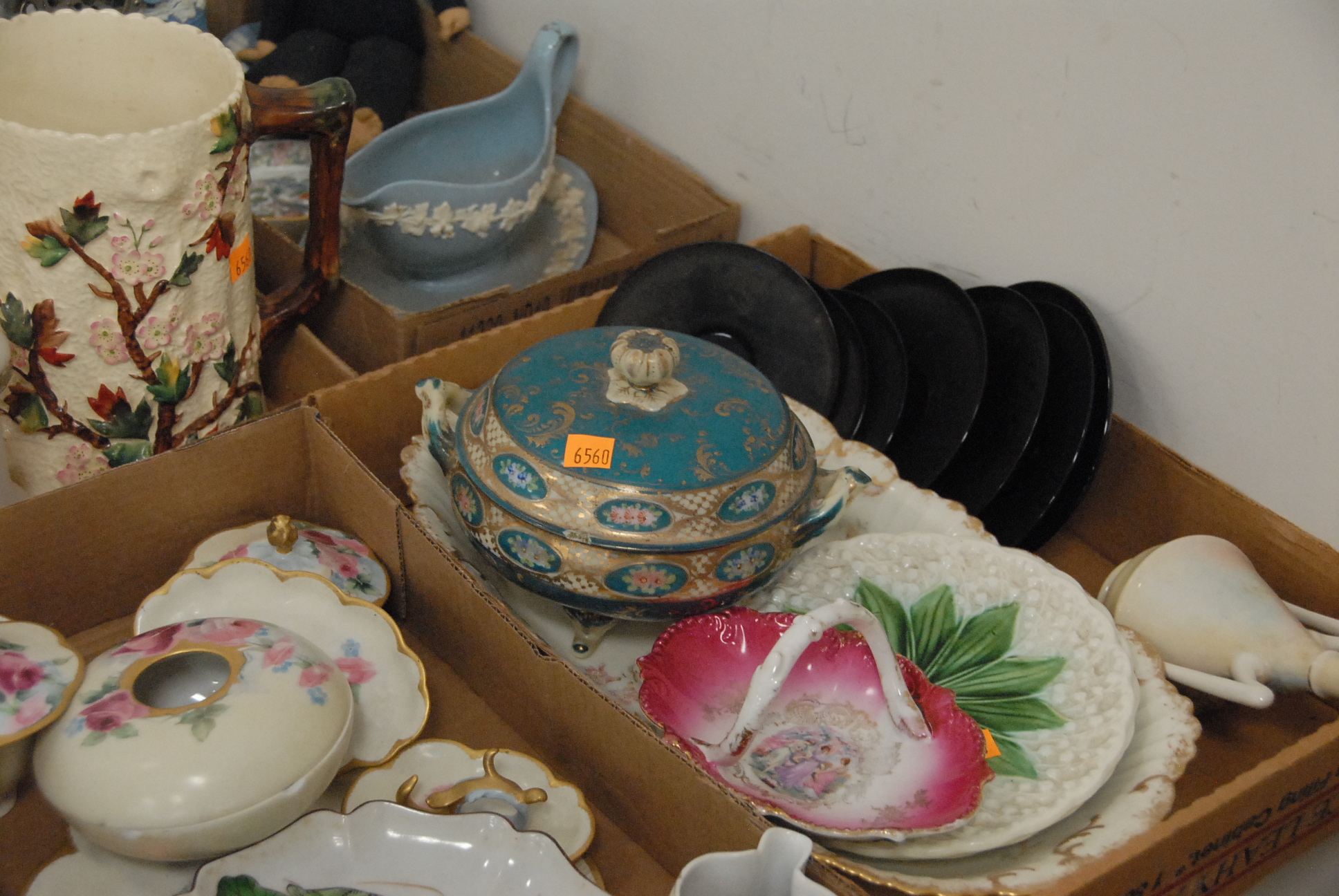 Five box lots of china and glassware including miniature decoy signed Dick Robinson Maryland.