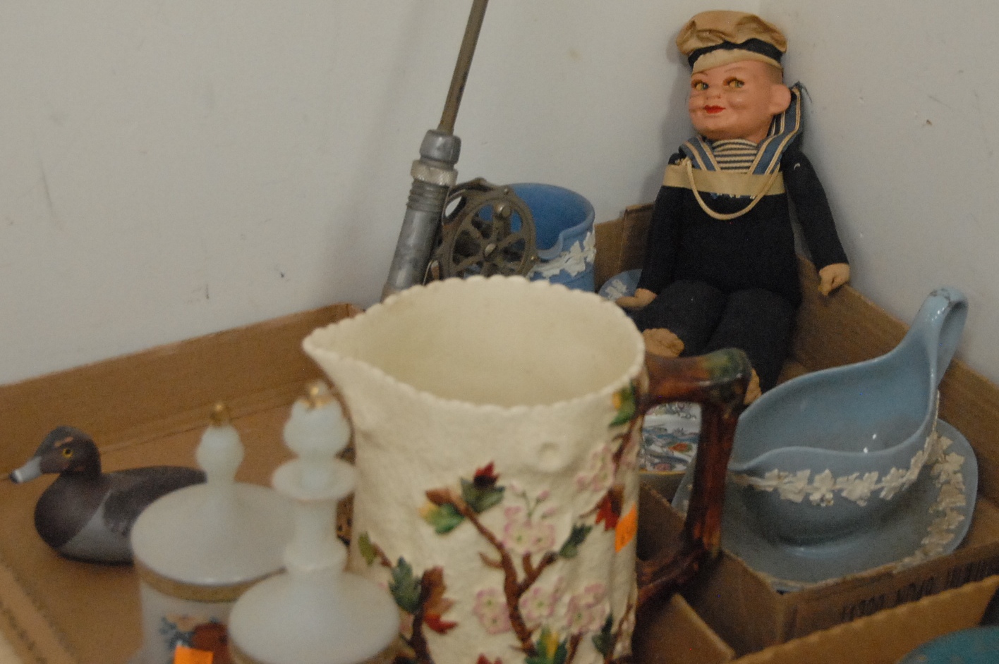Lot 352: Five box lots of china and glassware including miniature decoy signed Dick Robinson Maryland.