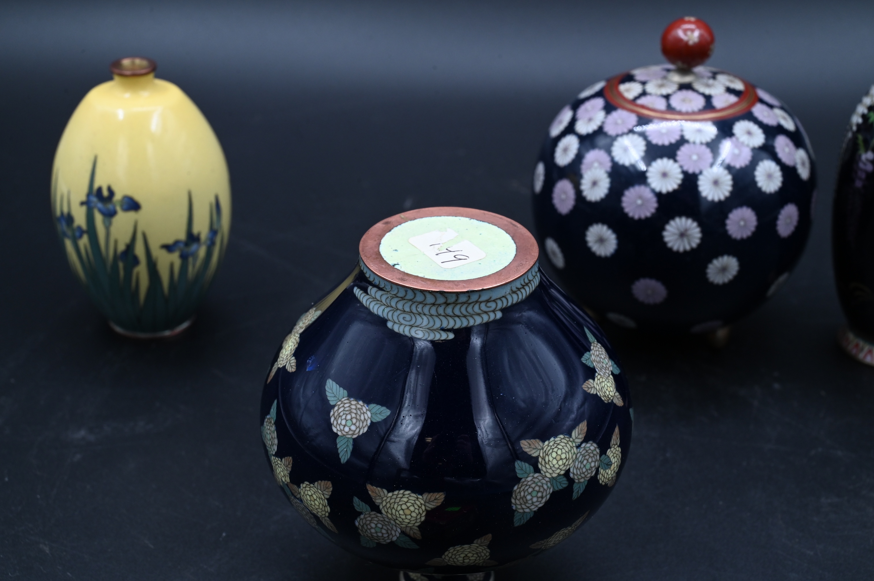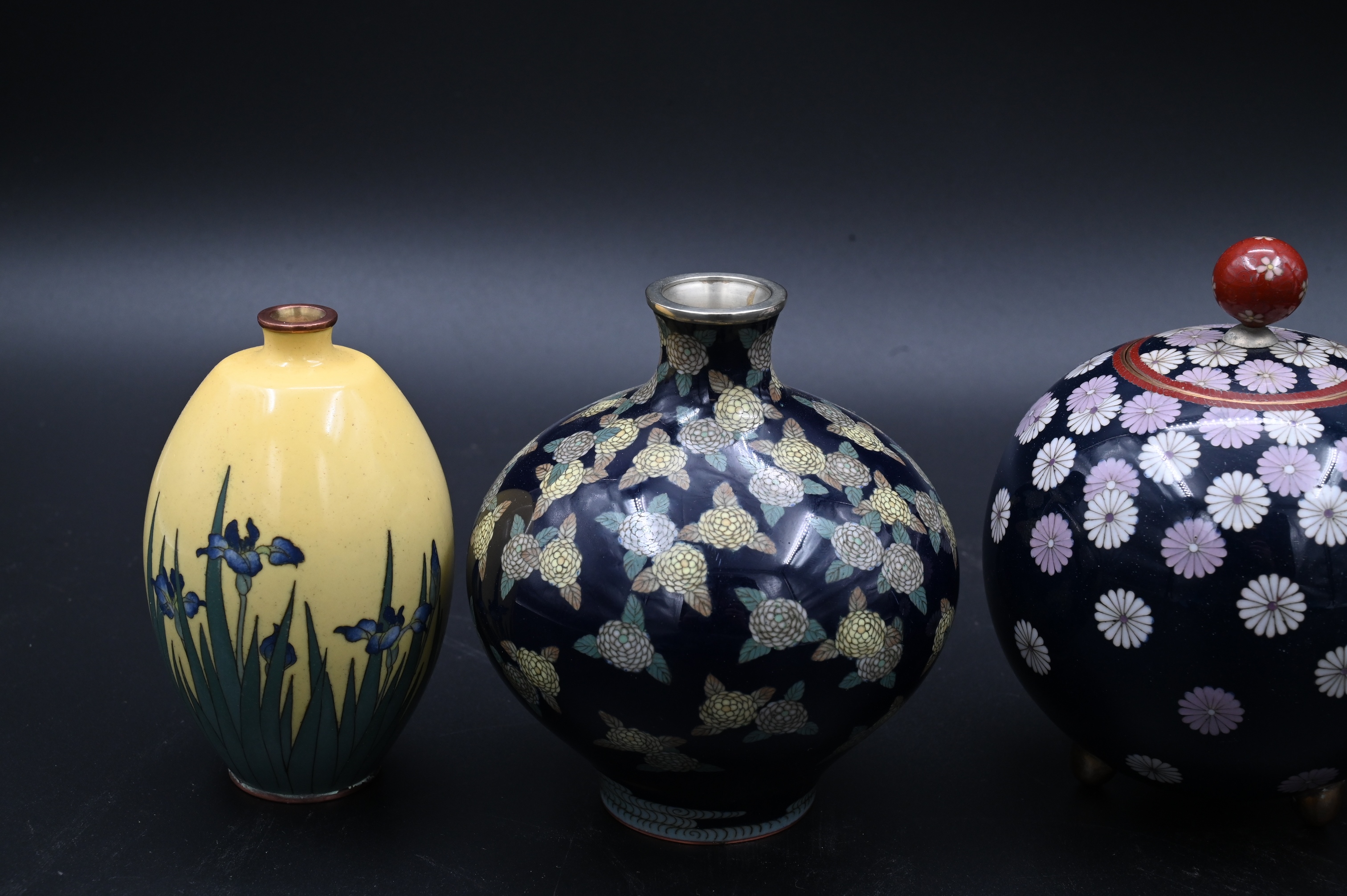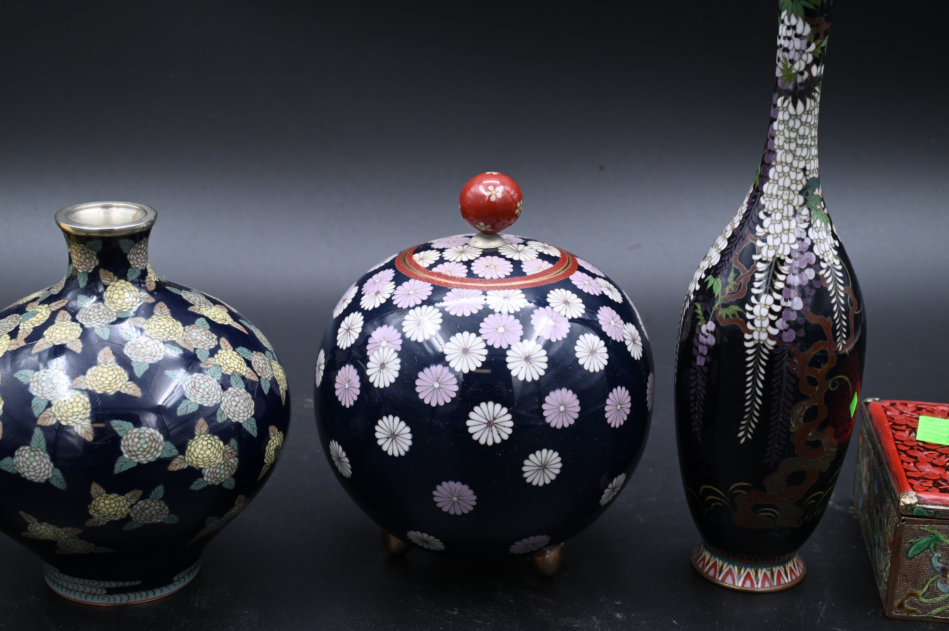 to include Amphora shaped vase having wisteria motif signed on base height 7 inches, pale yellow vase having iris motif signed on base, squat globular vase having hydrangea motif, globular covered jar set on three legs having floral motif, along with enameled box having double cinnabar lacquer covers with enamel handles