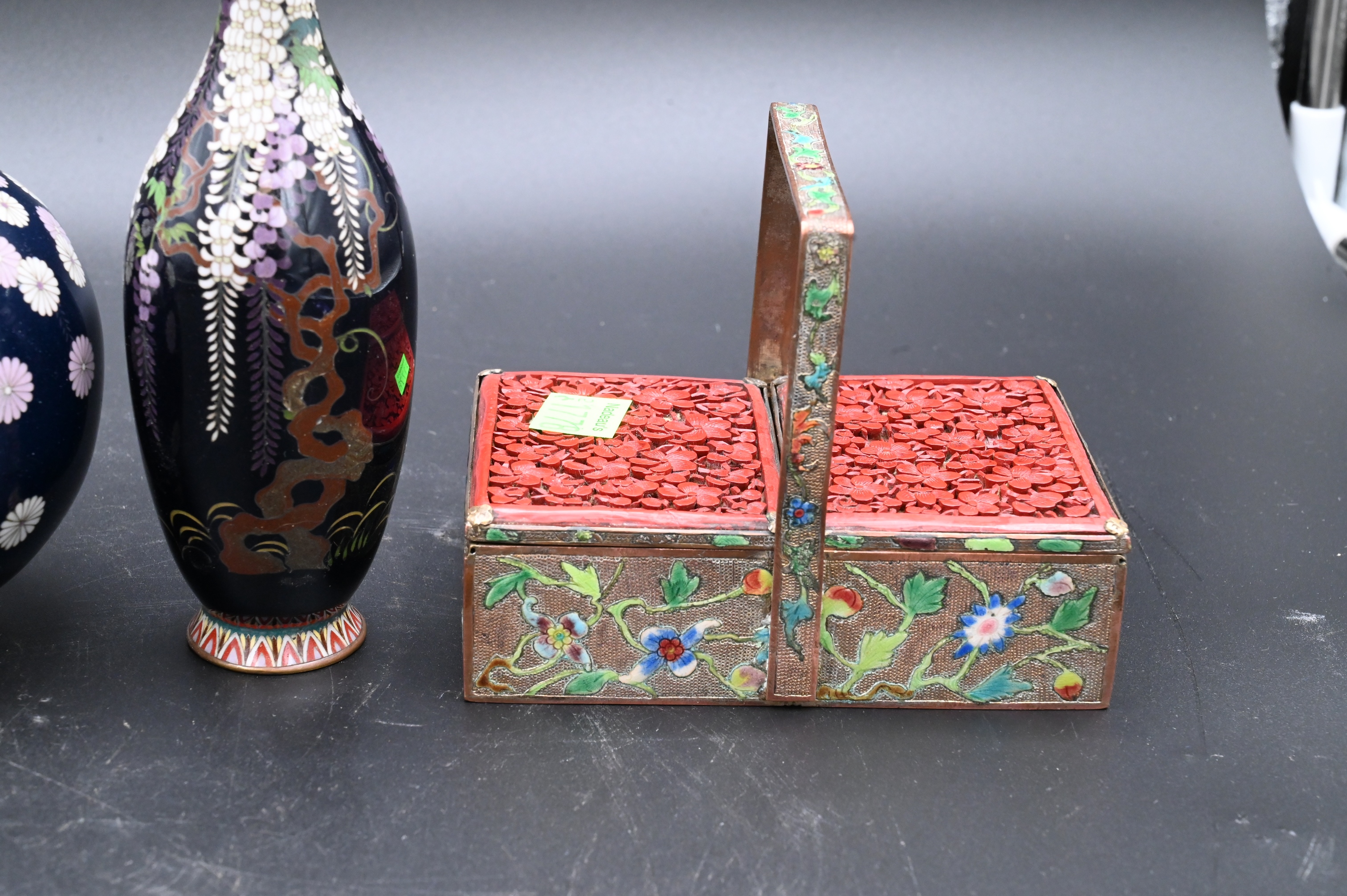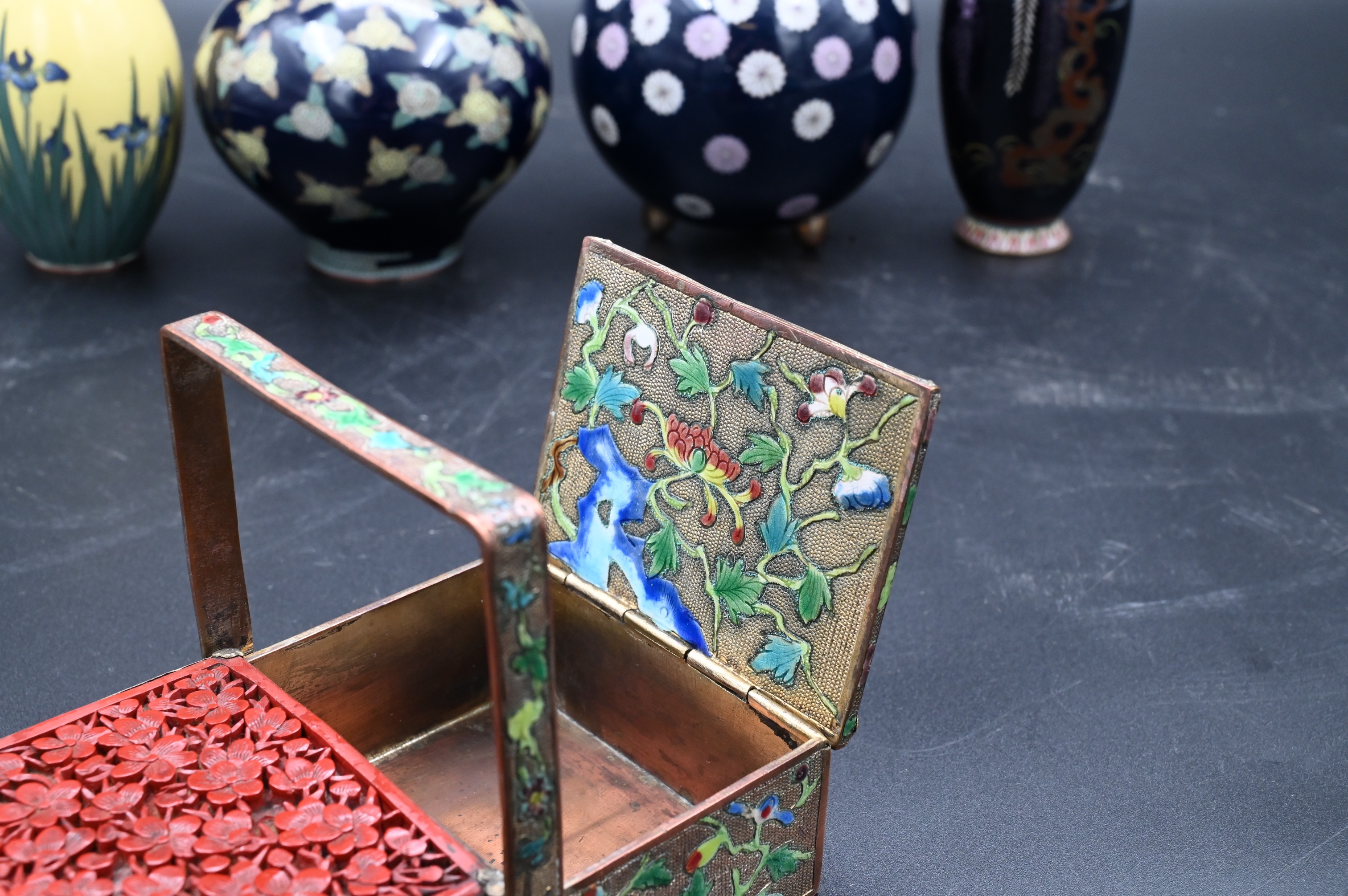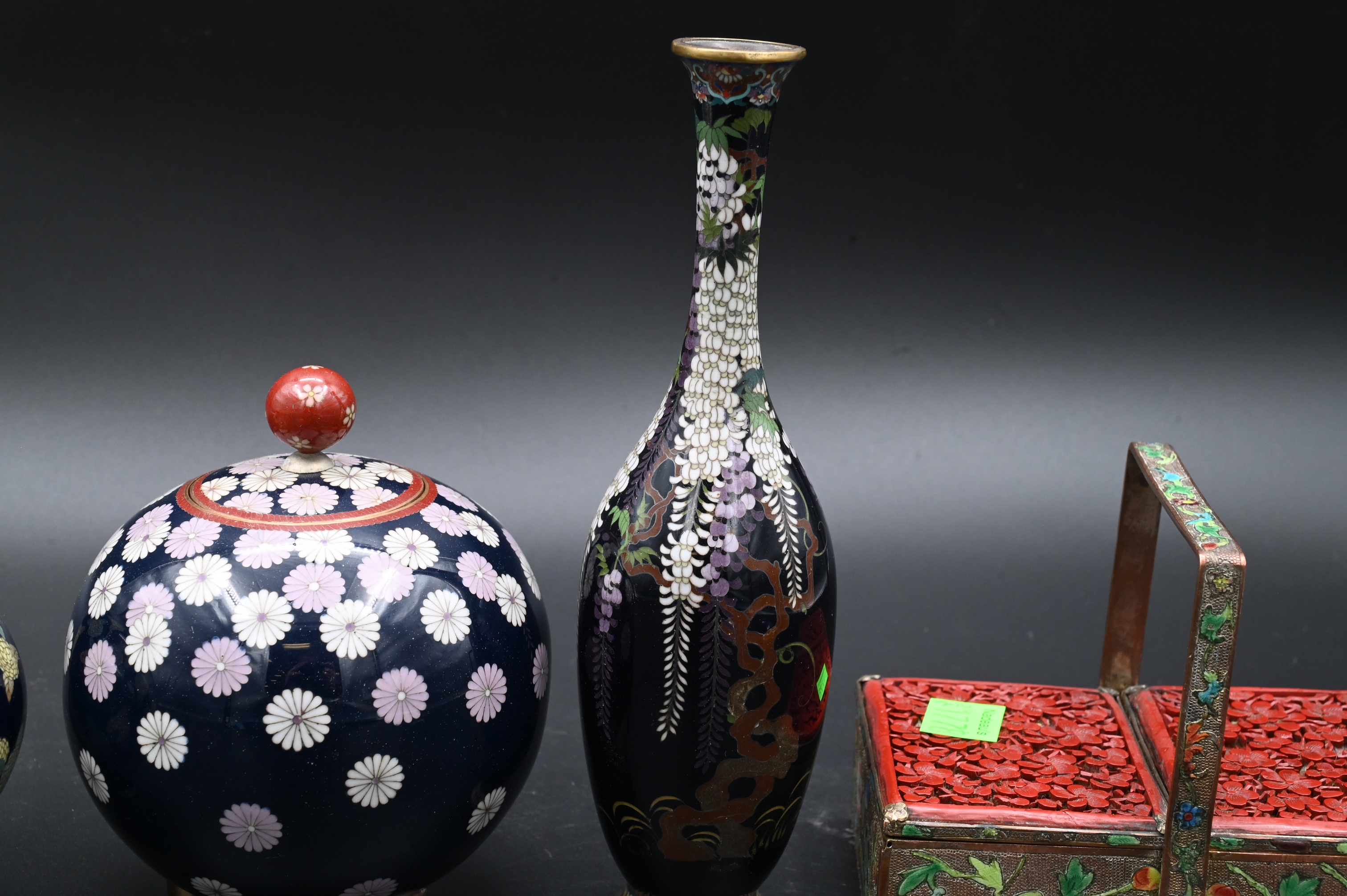 to include Amphora shaped vase having wisteria motif signed on base height 7 inches, pale yellow vase having iris motif signed on base, squat globular vase having hydrangea motif, globular covered jar set on three legs having floral motif, along with enameled box having double cinnabar lacquer covers with enamel handles