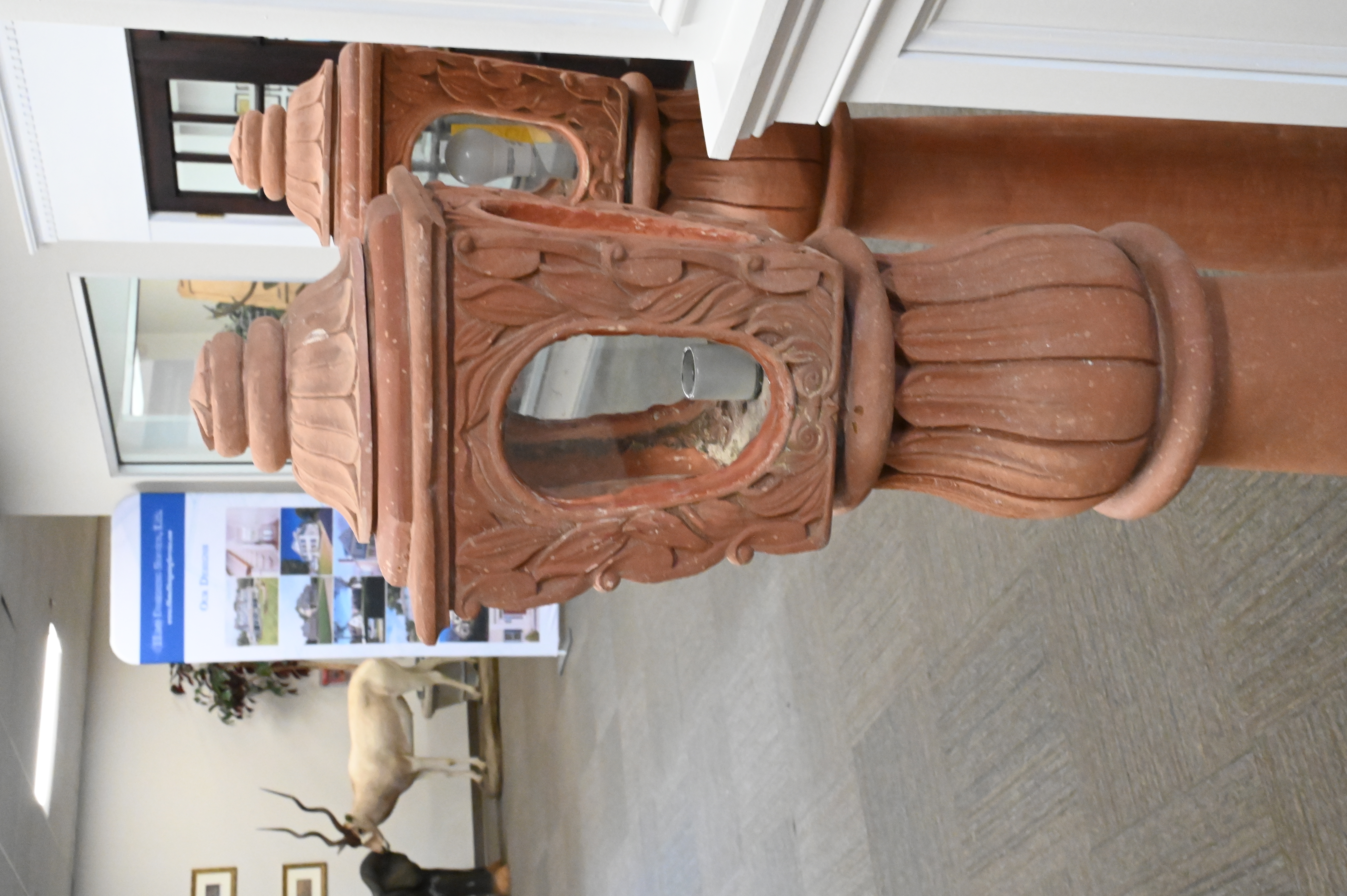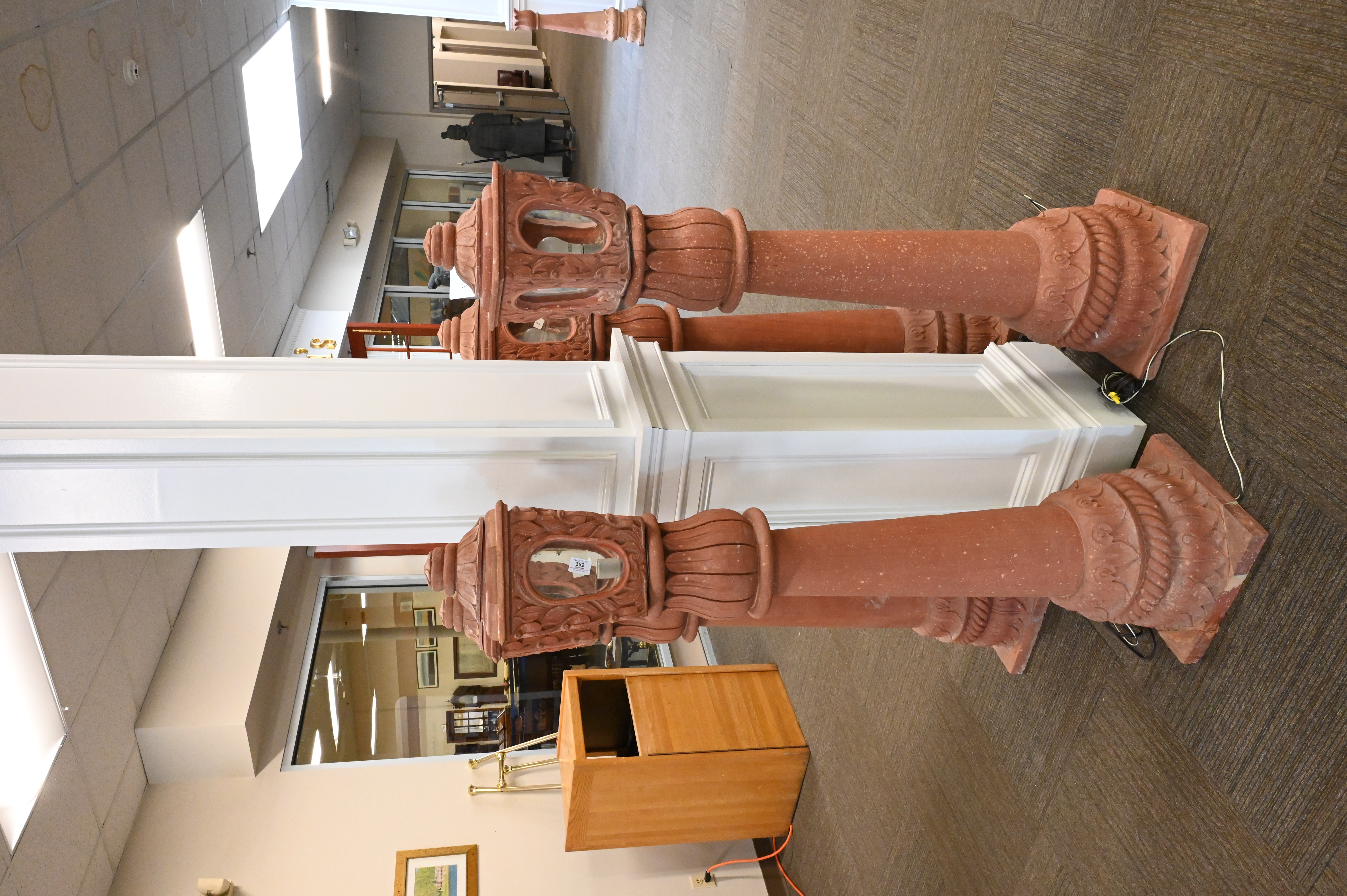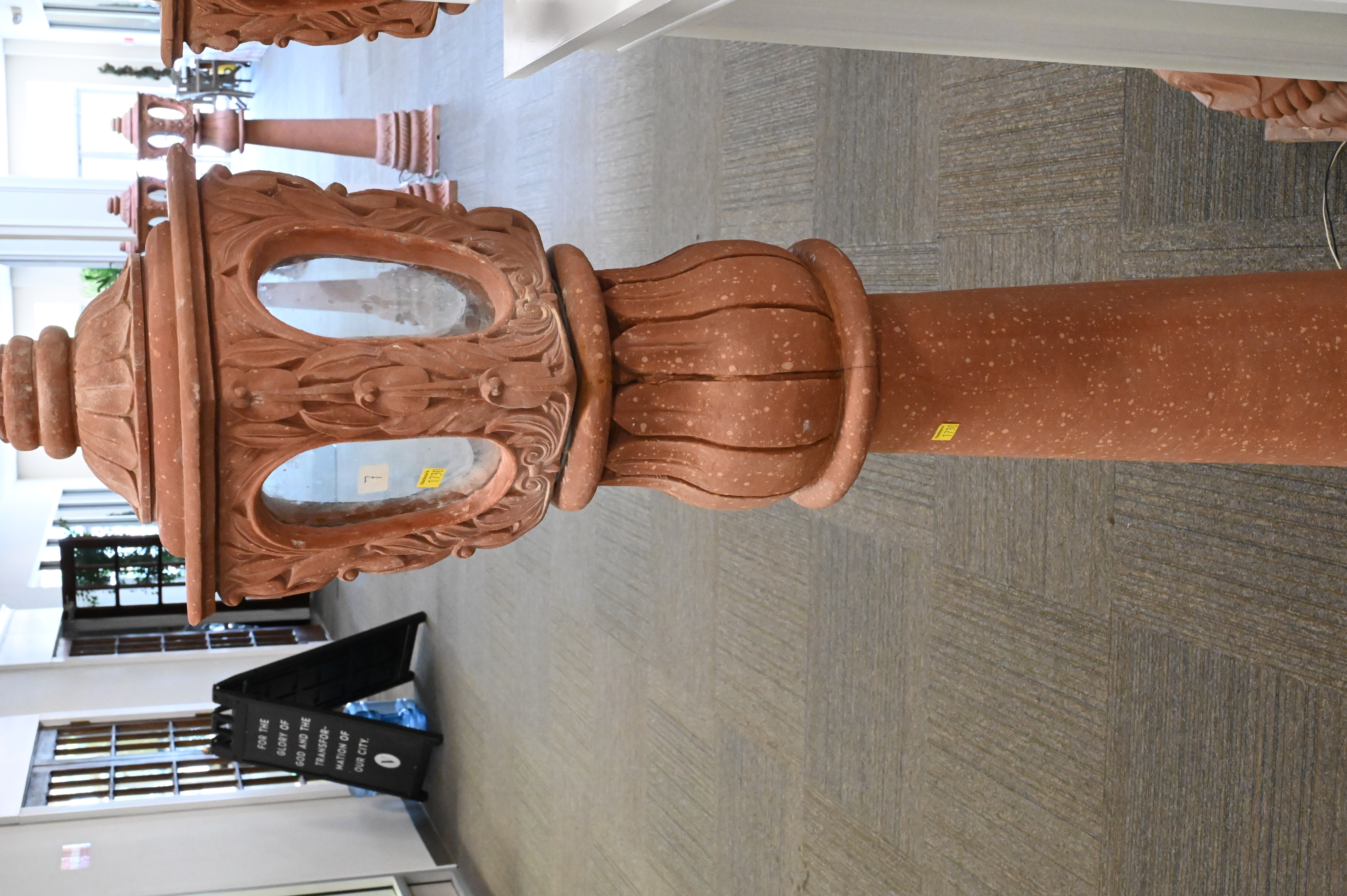 Set of Four Earthenware Outdoor Lanterns, each having shaped top with four oval window panes, set on pillar bases, electrified, minor loss, height 61 inches.