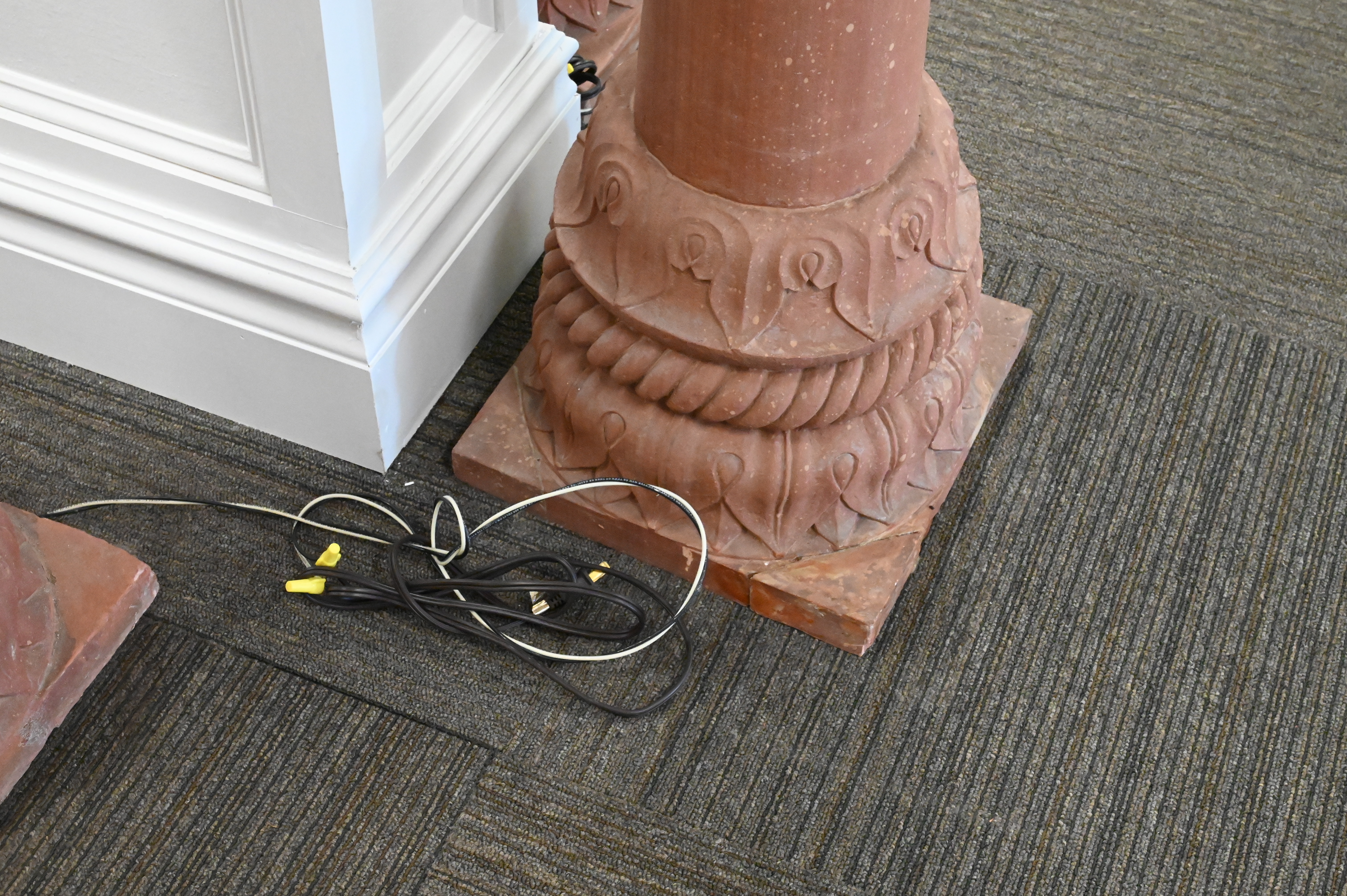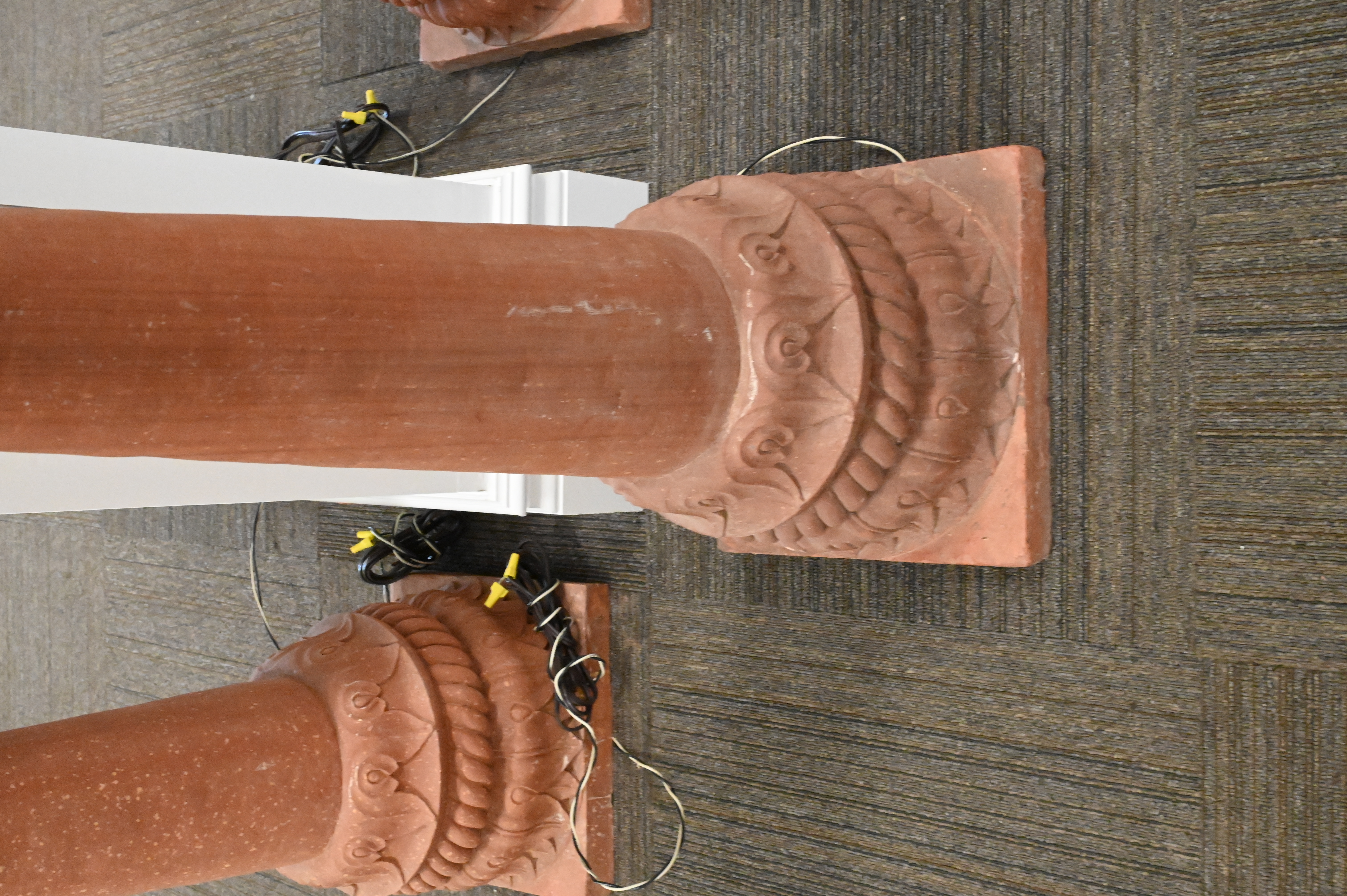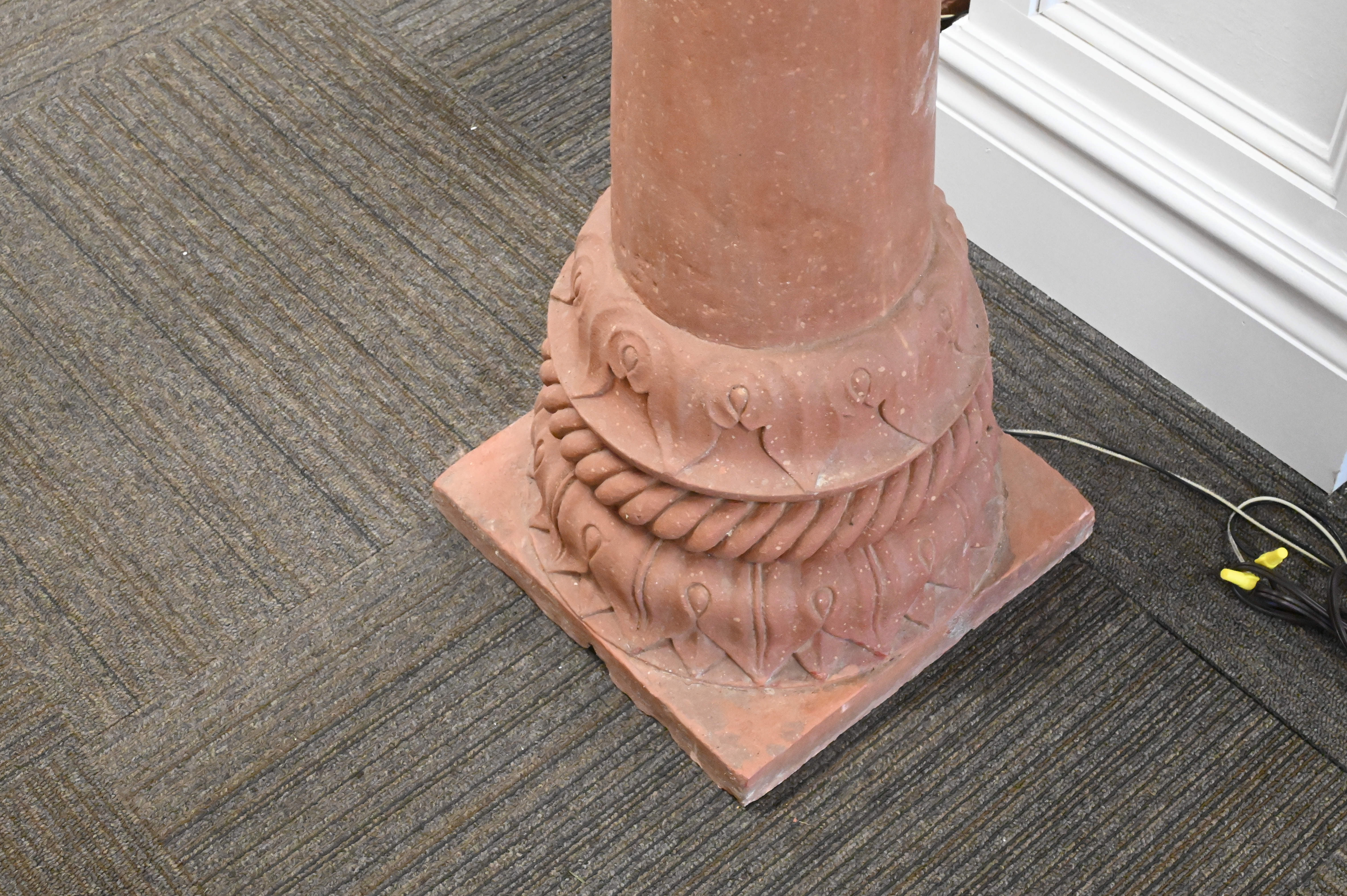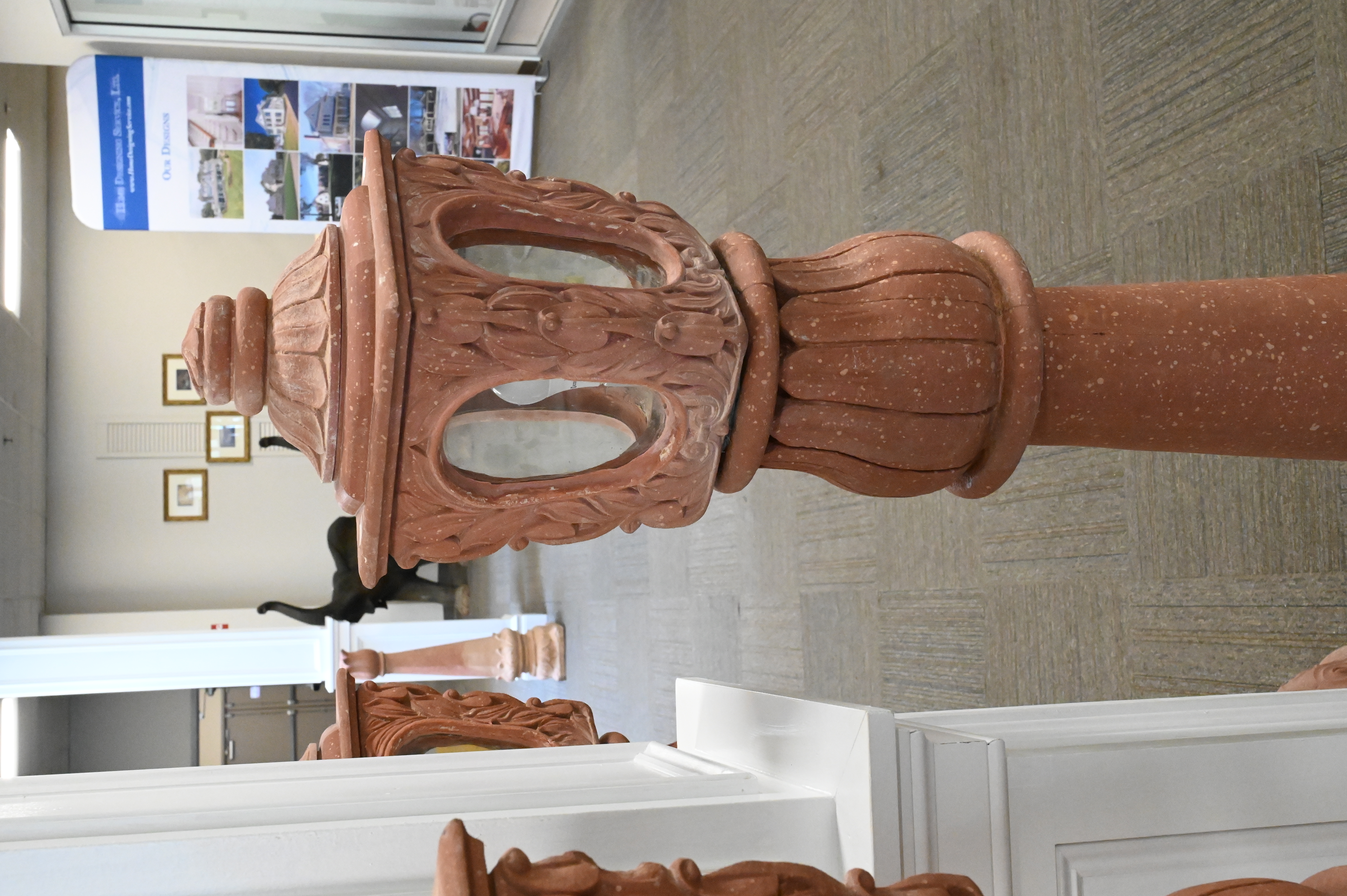 Set of Four Earthenware Outdoor Lanterns, each having shaped top with four oval window panes, set on pillar bases, electrified, minor loss, height 61 inches.