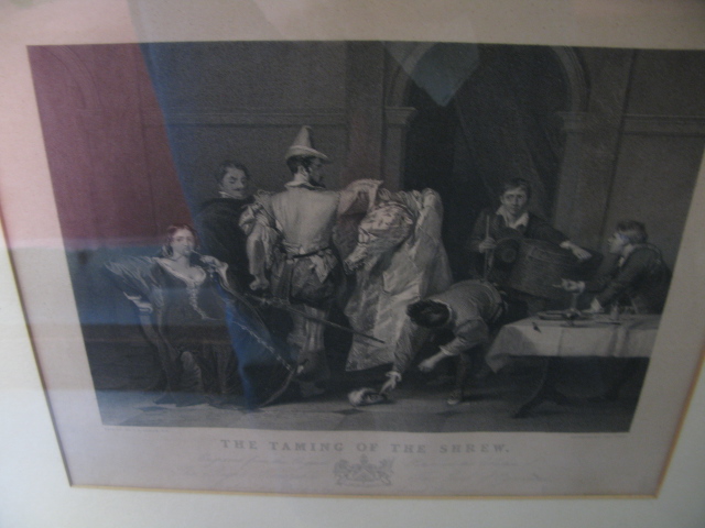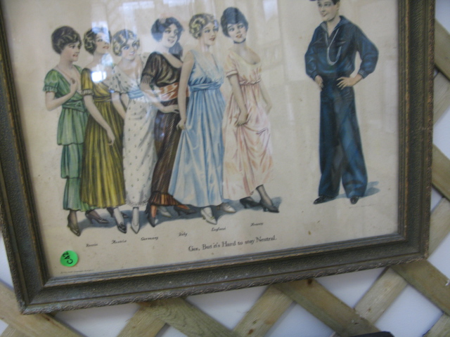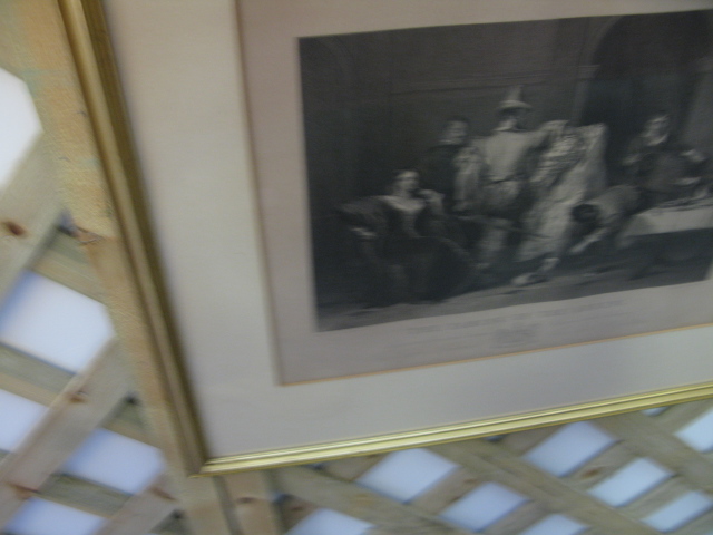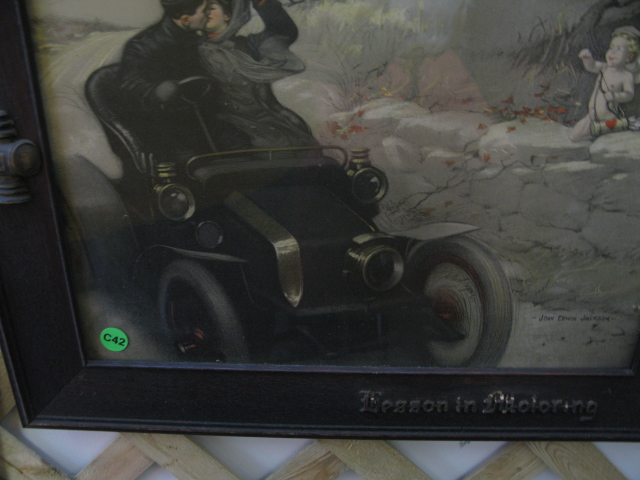Four prints House of Art Parish type print and print of early car with 2 people.