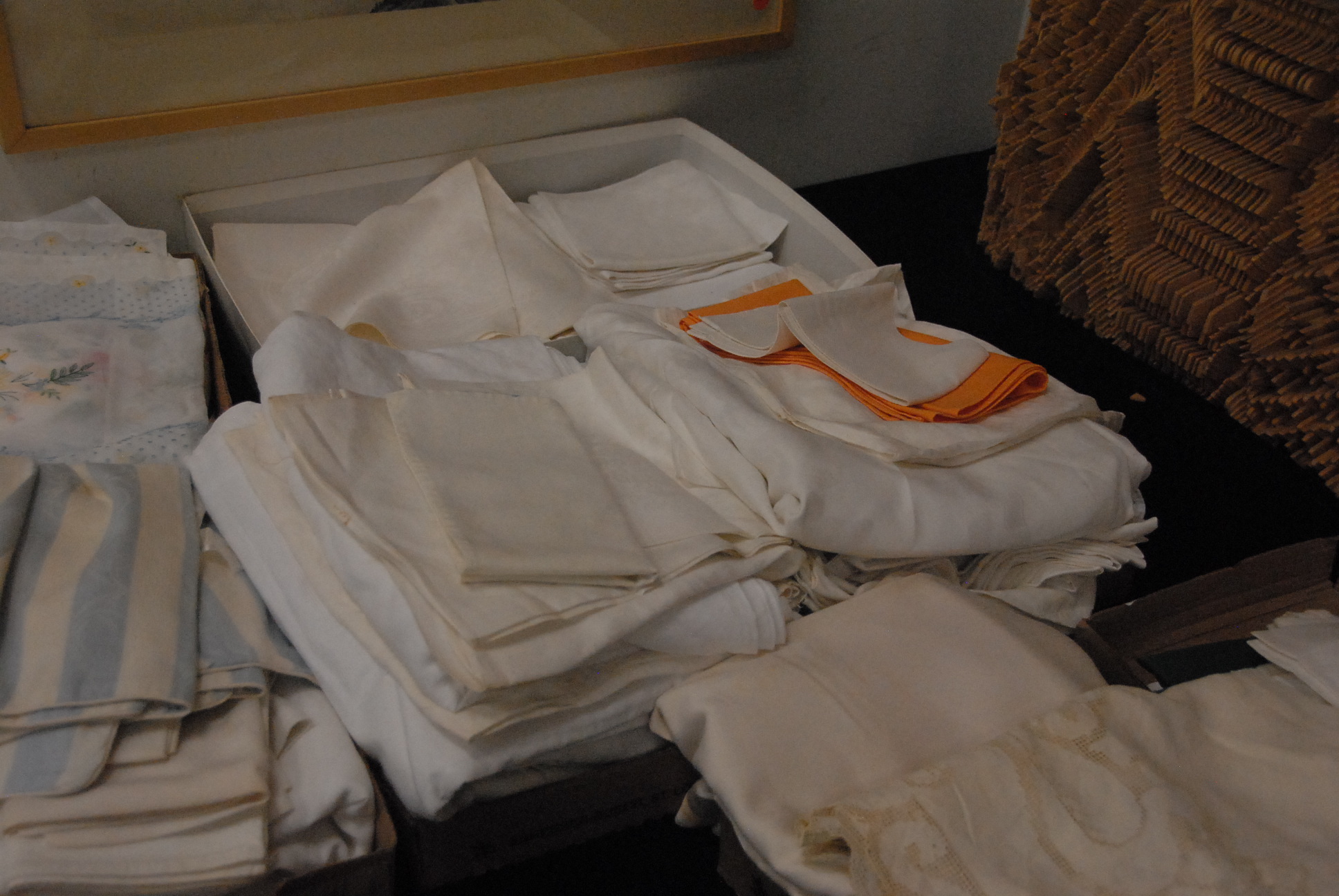 Lot 352: Fourteen boxes to include twelve boxes of various table linens and embroidered place mats, one table cloth lg. 14ft., napkins, cutwo…