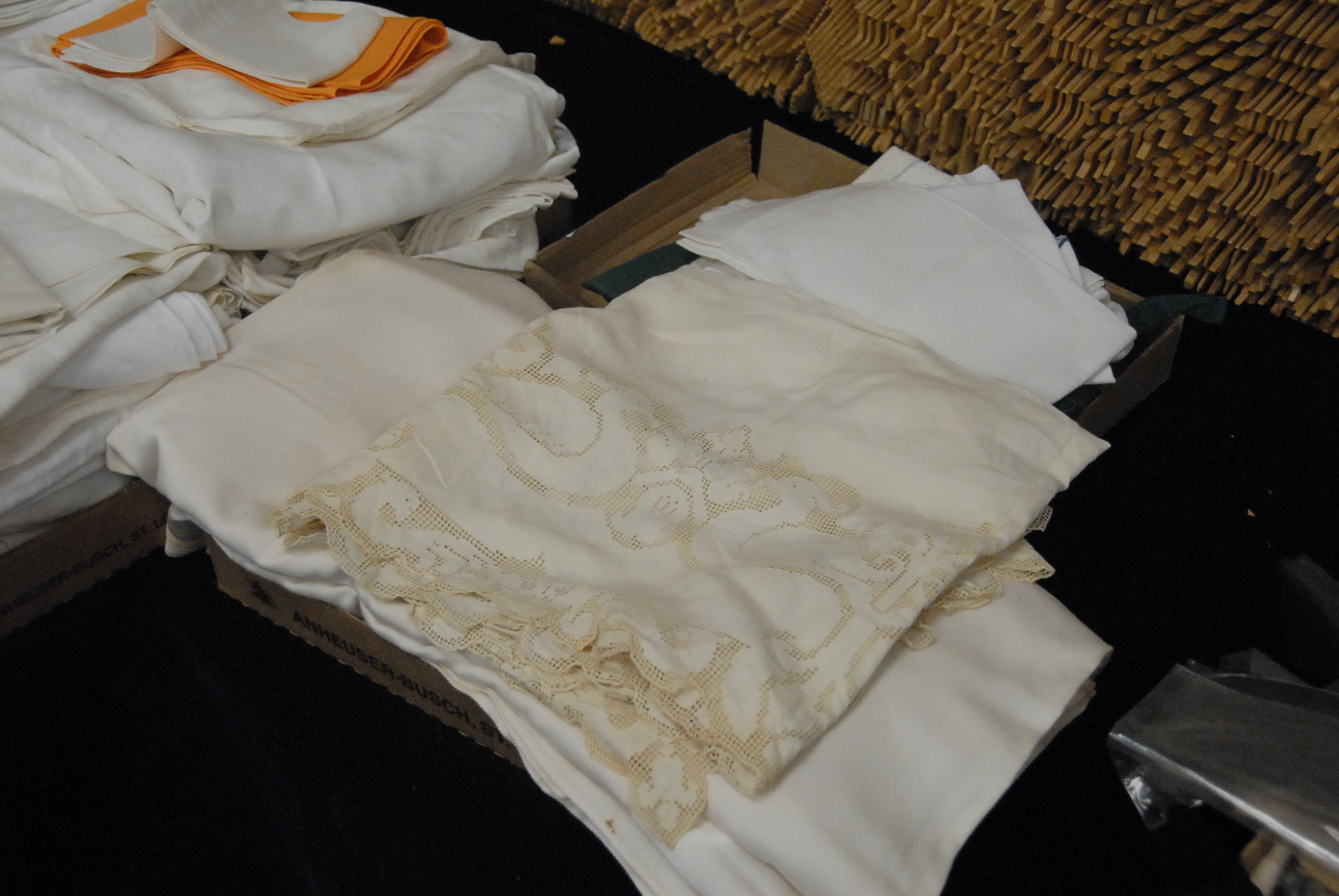 Fourteen boxes to include twelve boxes of various table linens and embroidered place mats, one table cloth lg. 14ft., napkins, cutwork pieces along with two boxes of gloves.
