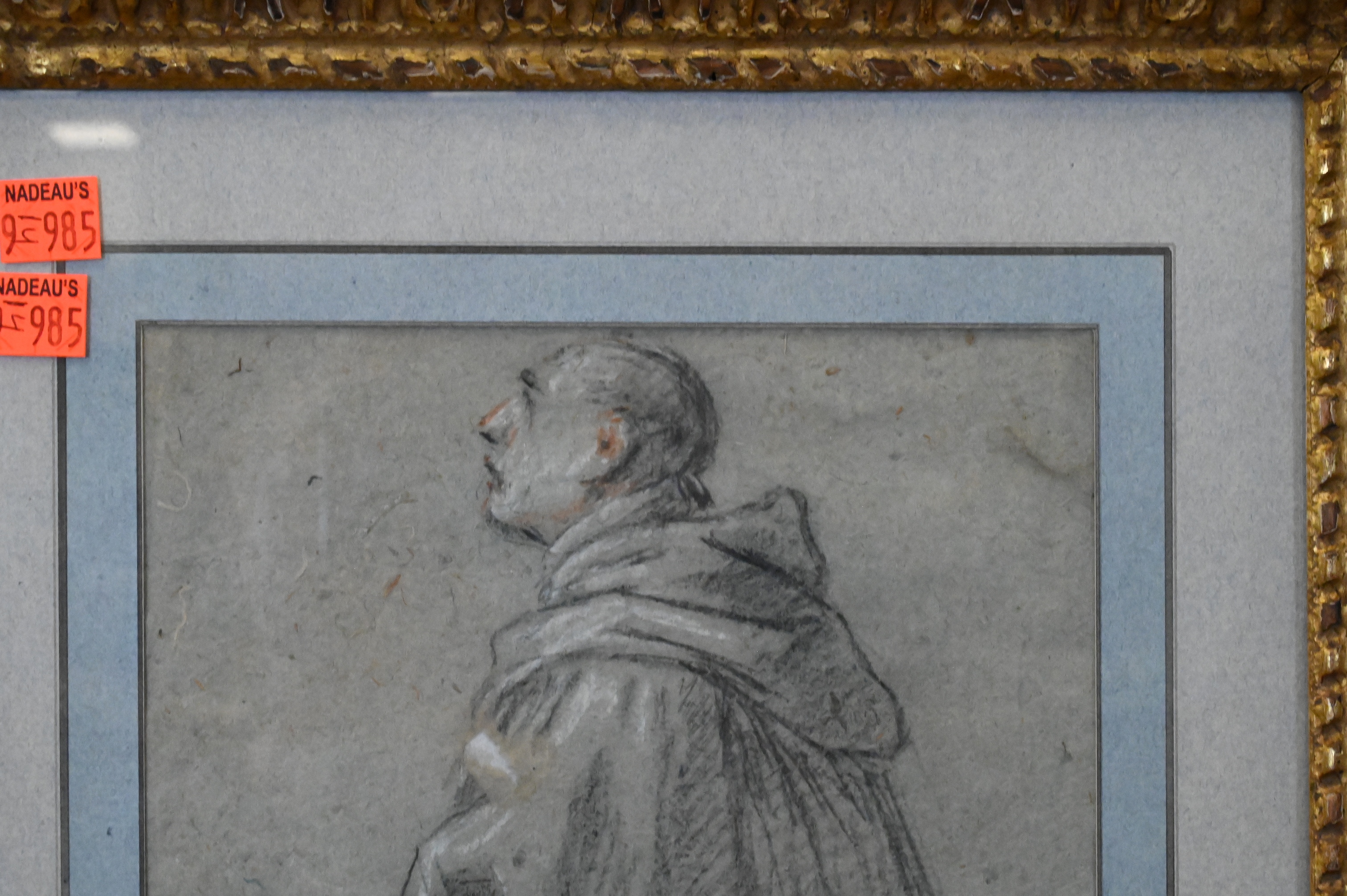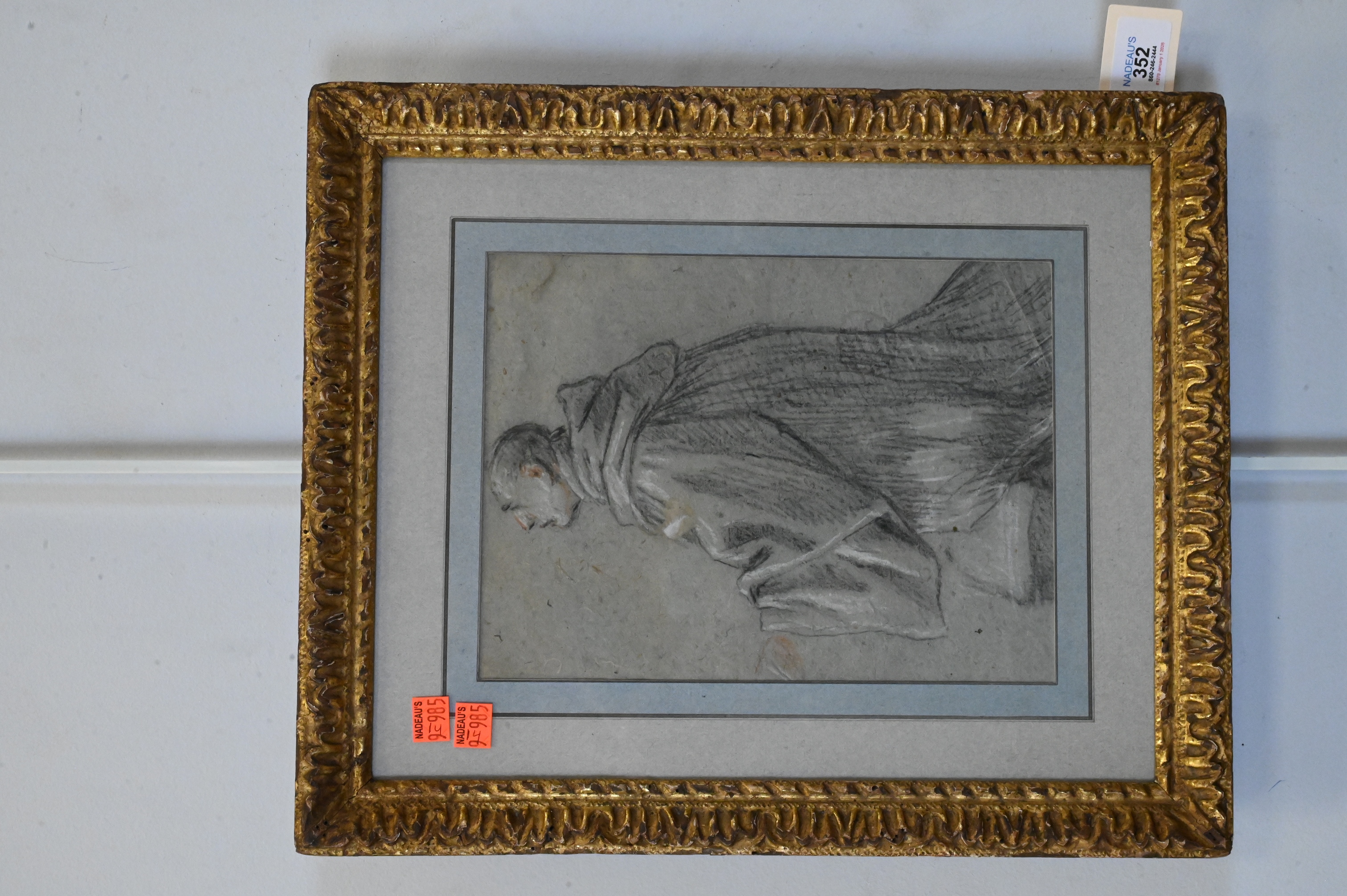 Fine Old Master study of a kneeling monk in profile, executed in black chalk with touches of red chalk on gray-blue paper; the figure is rendered with sensitive modeling of the drapery folds and a devotional upward gaze characteristic of early 17th-century Italian monastic studies